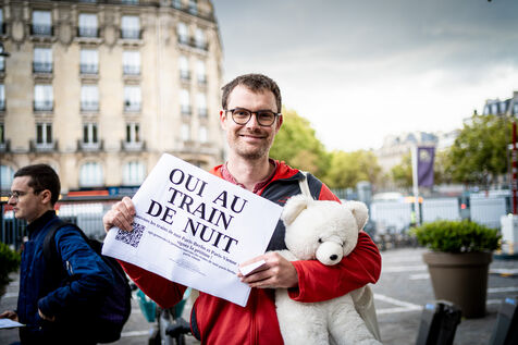 Demonstration on the forecourt of Gare de l'Est station in the form of a pyjama party rally to keep night trains running. According to the user group ‘Oui au train de nuit’ (Yes to night trains), the Paris-Vienna and Paris-Berlin night services could disappear due to a lack of state subsidies in Paris, France on September 26, 2025.