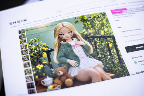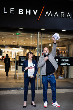 Demonstration in the form of a happening in front of the BHV Le Marais store (Bazar de l'Hotel de Ville) on Rue de Rivoli, organised by the Mouv'enfants association (which fights against all forms of violence against children and adolescents) to denounce the opening of a corner shop for the Chinese brand Shein, accused of selling sex dolls with the faces of children (pornography, pedocriminality) in Paris, France on November 3, 2025.