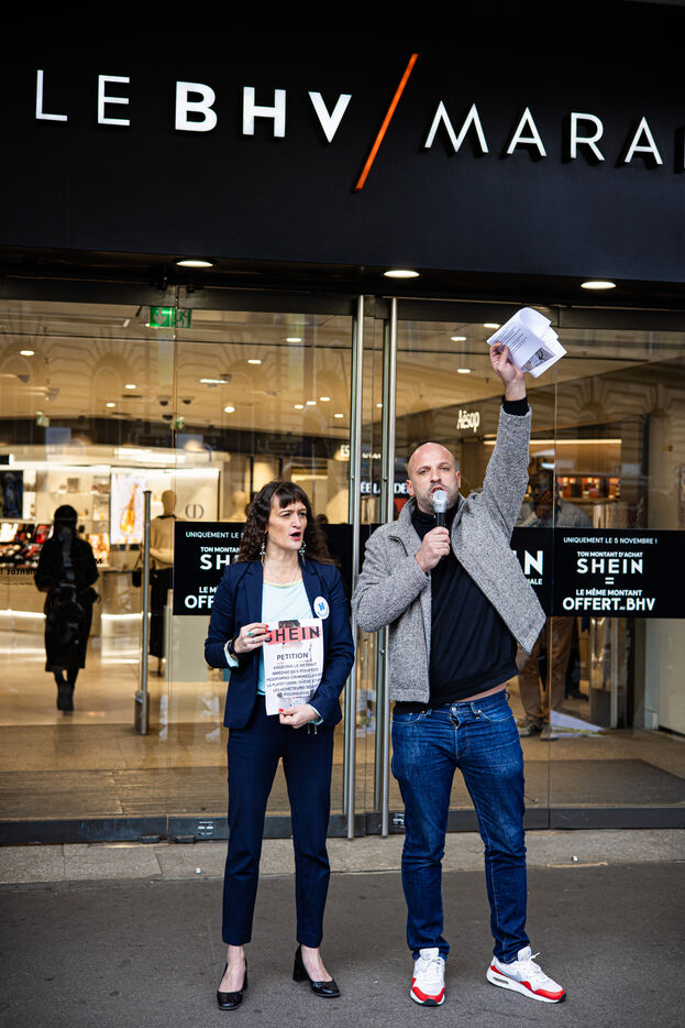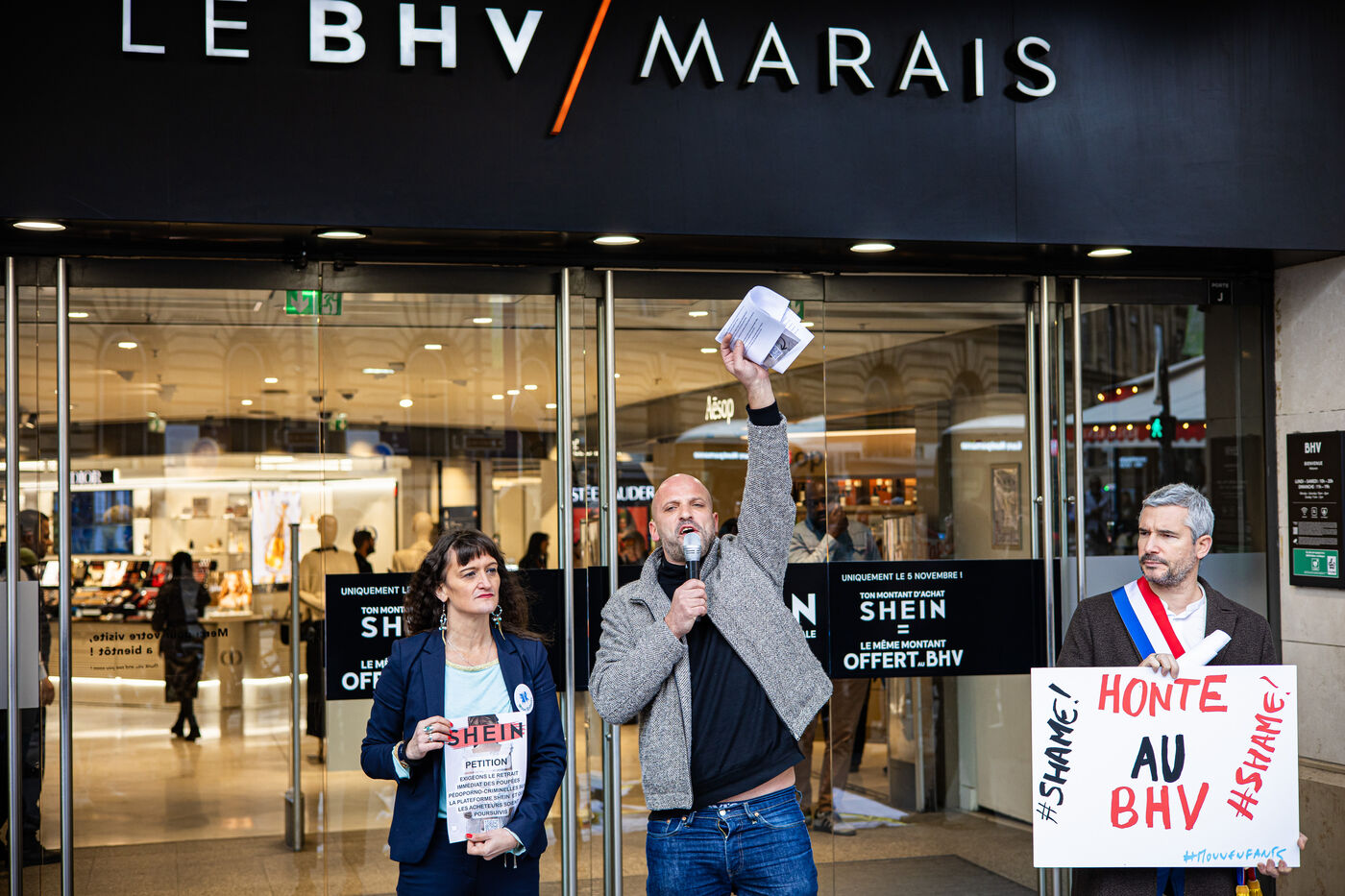 Manifestation sous la forme d'un happening devant la facade du magasin BHV Le Marais (Bazar de l'Hotel de Ville) rue de Rivoli à l'initiative de l'association Mouv'enfants (lutte contre toutes les formes de violence faites aux enfants et aux adolescents) pour dénoncer l'ouverture d'une boutique corner de la marque chinoise Shein accusée de vendre des poupées sexuelles à caractère pédopornographique avec des visages d'enfants (pedocriminalité) à Paris, France le 3 Novembre 2025.