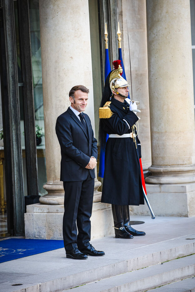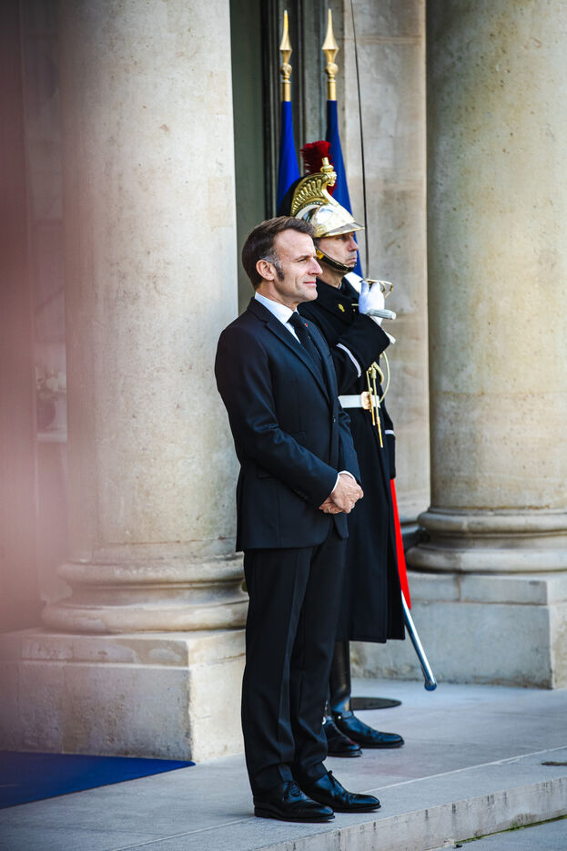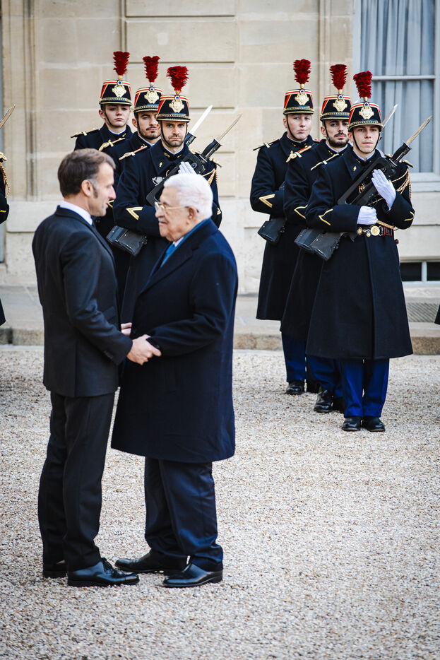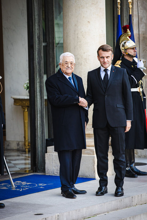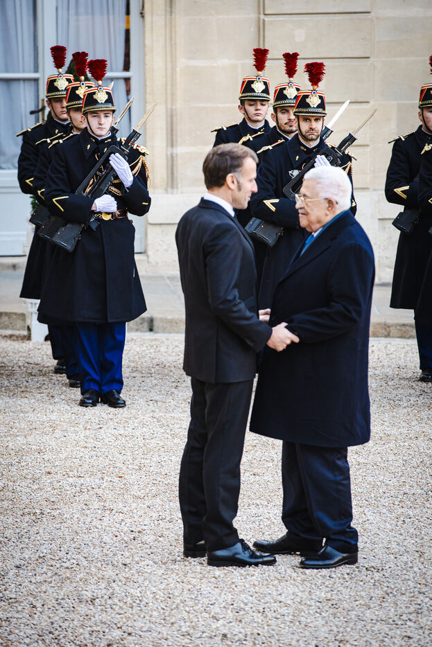 Meeting between France's President Emmanuel Macron and Palestine's President Mahmoud Abbas at the Presidential Elysee Palace in Paris, France on November 11, 2025. Bilateral meeting following France's recognition of the Palestinian State and ongoing efforts to implement a peace and security plan for all in the Middle East, war between Israel and Palestine.