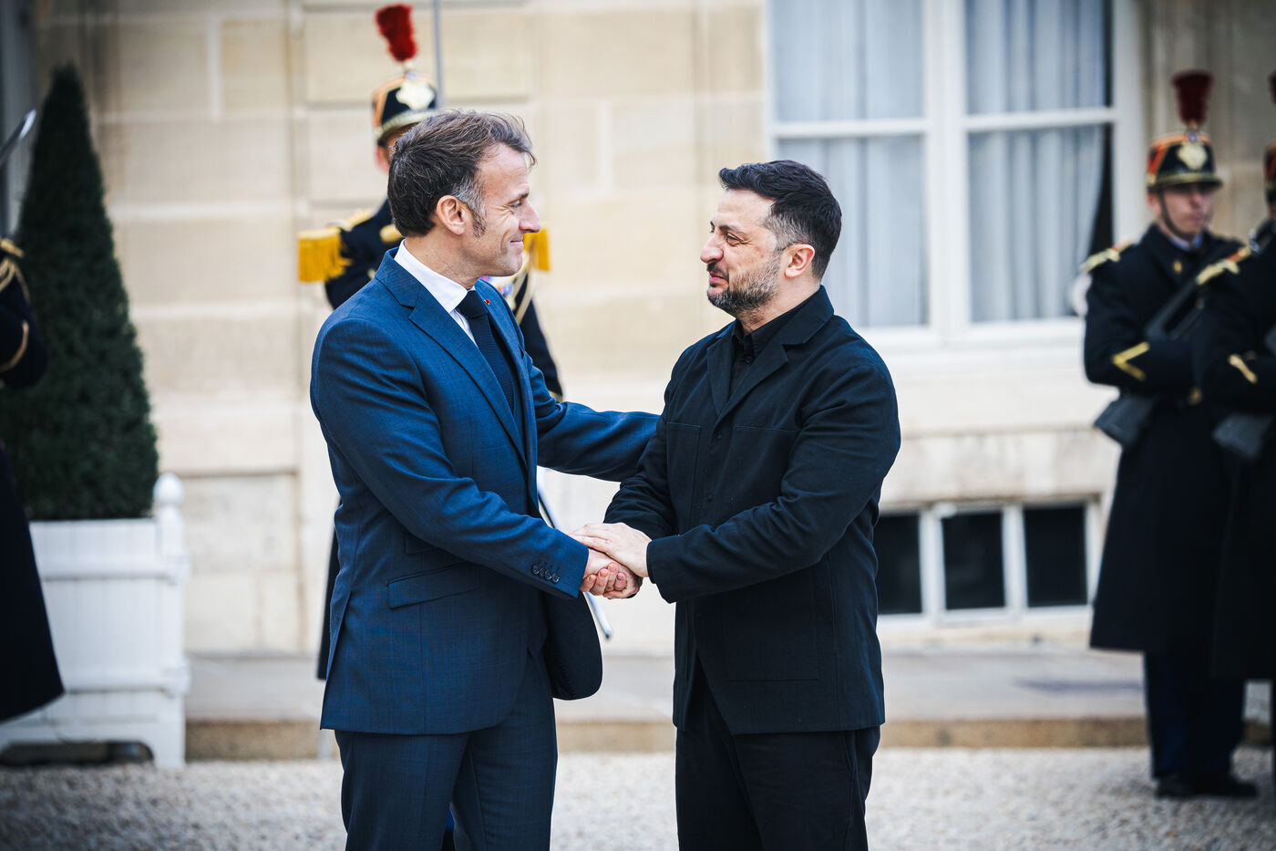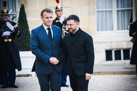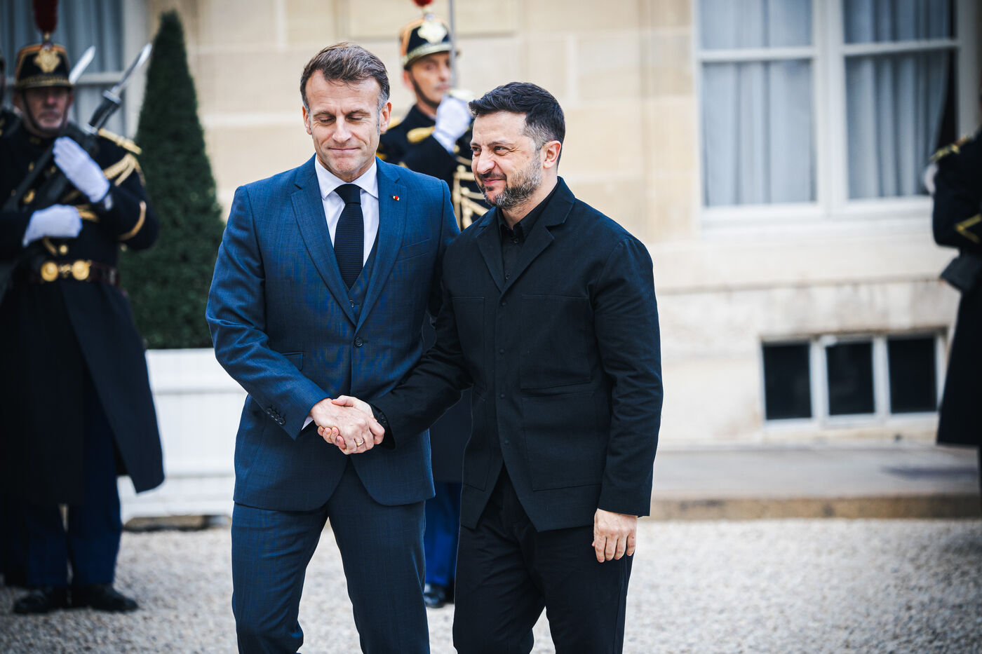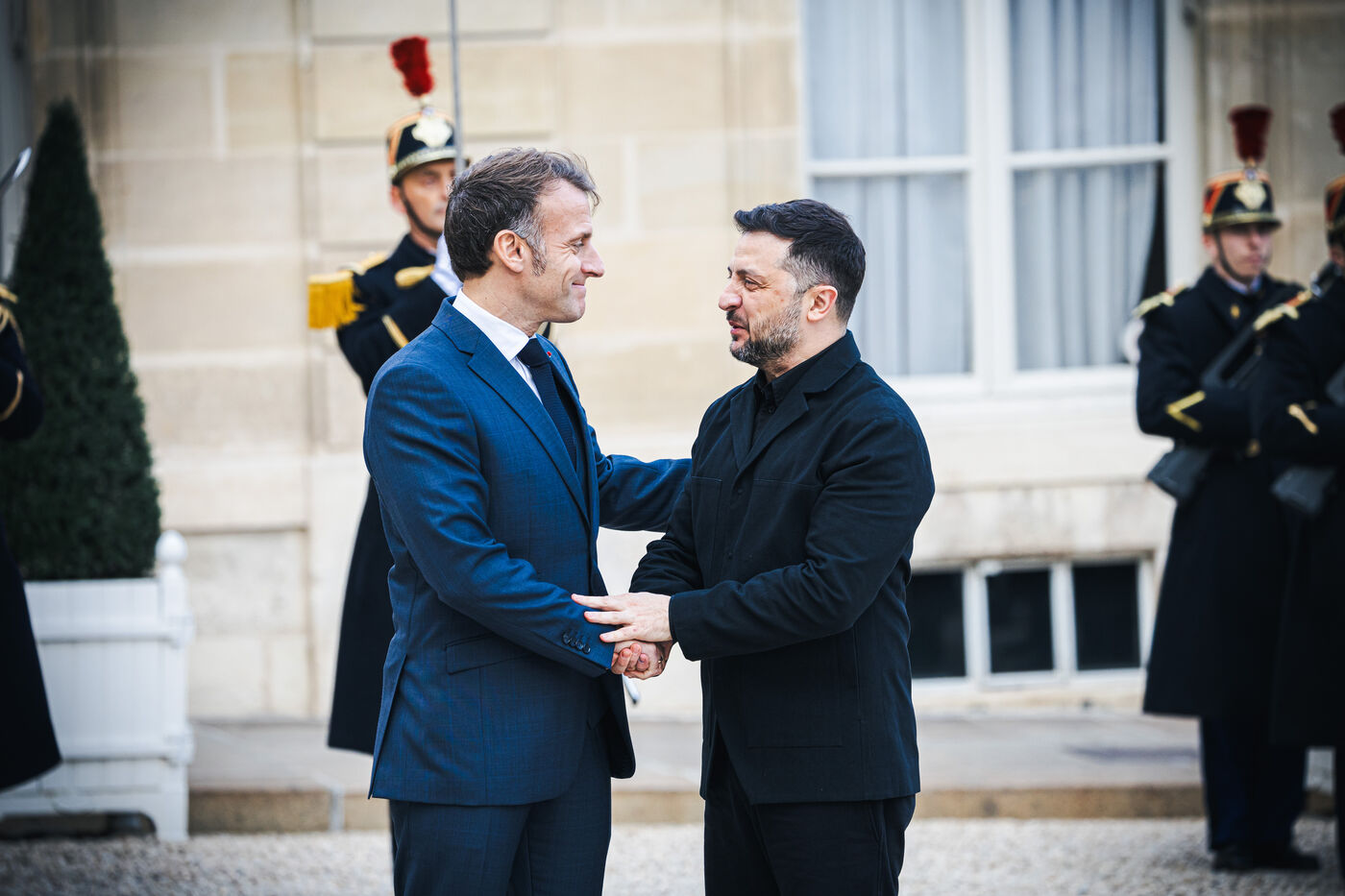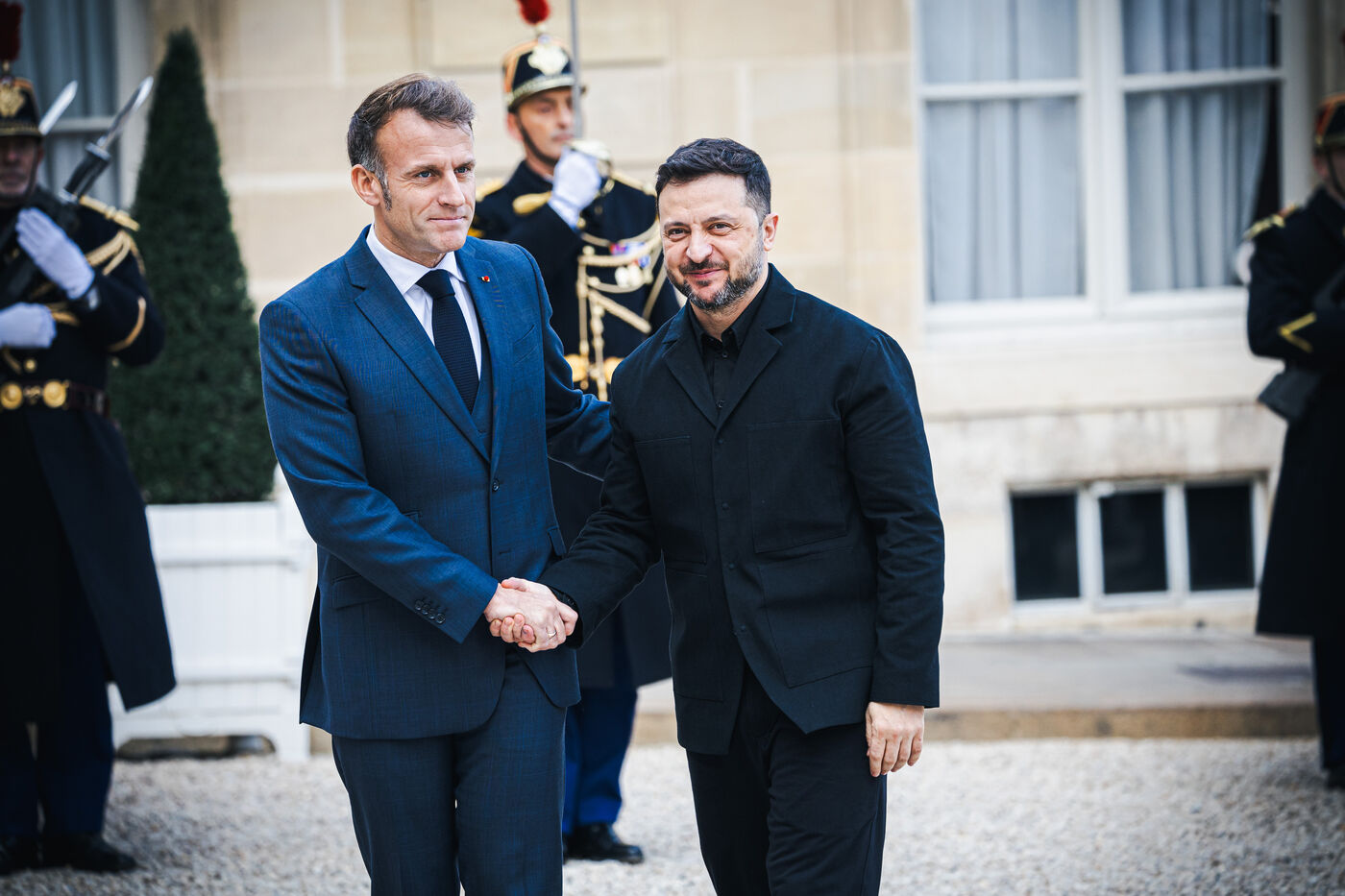 France's President Emmanuel Macron welcomes Ukraine's President Volodymyr Zelensky in the courtyard before their bilateral meeting at the Presidential Elysee Palace in Paris, France on November 17, 2025. Reaffirmation of France's commitment to Ukraine, discussion of bilateral cooperation issues, particularly in the areas of energy, economics and defence (armaments, arms sales, signing of a letter of intent for the purchase of 100 Rafale aircraft from France).
