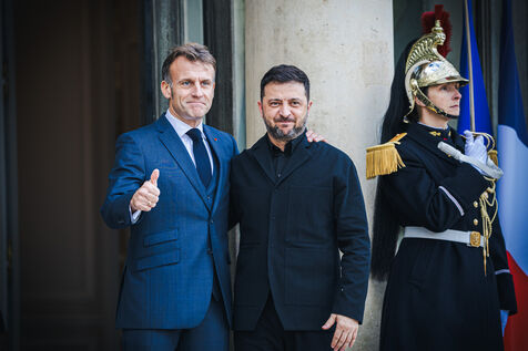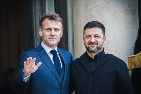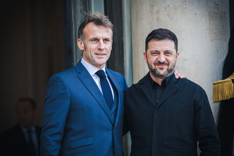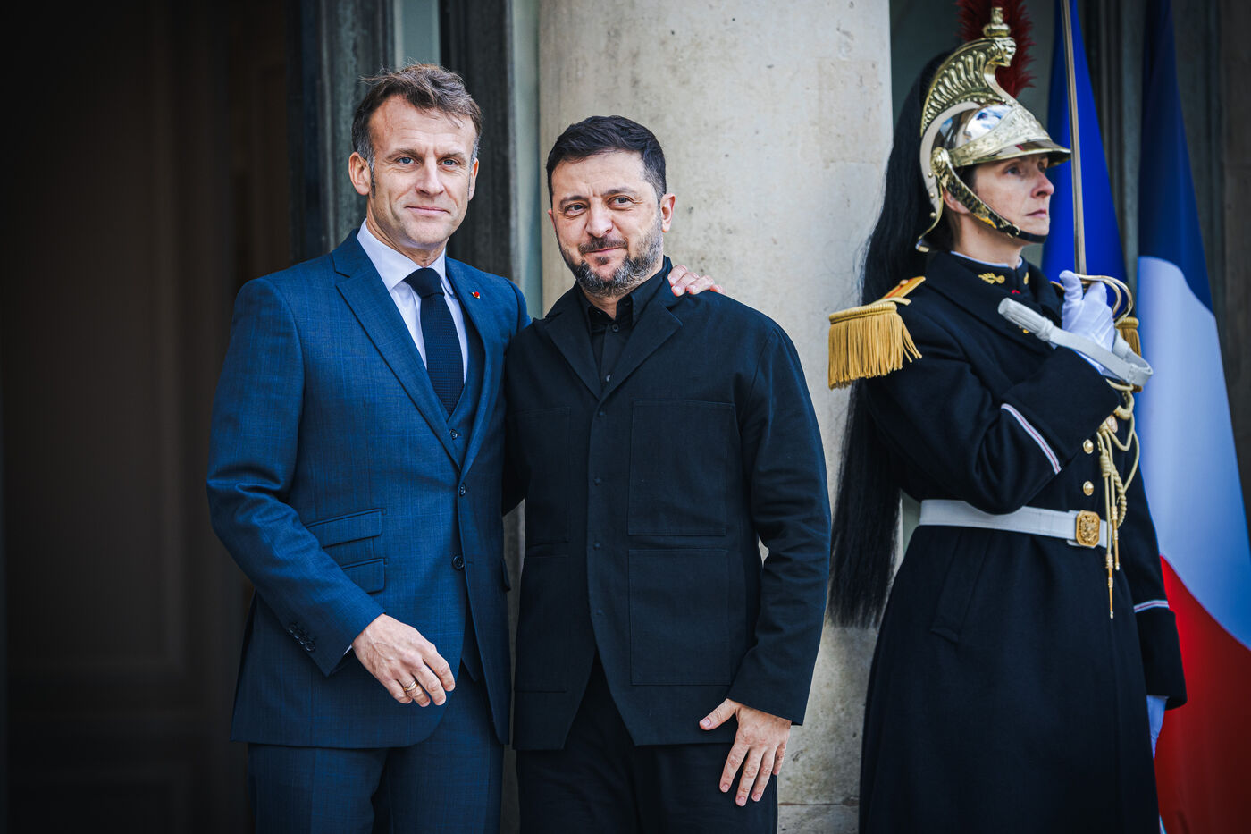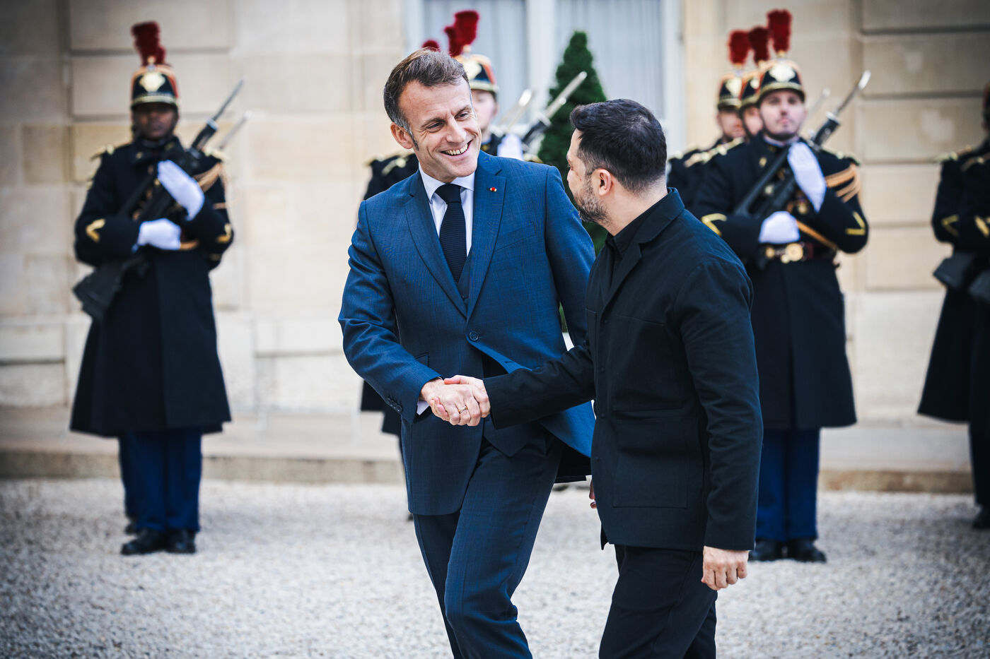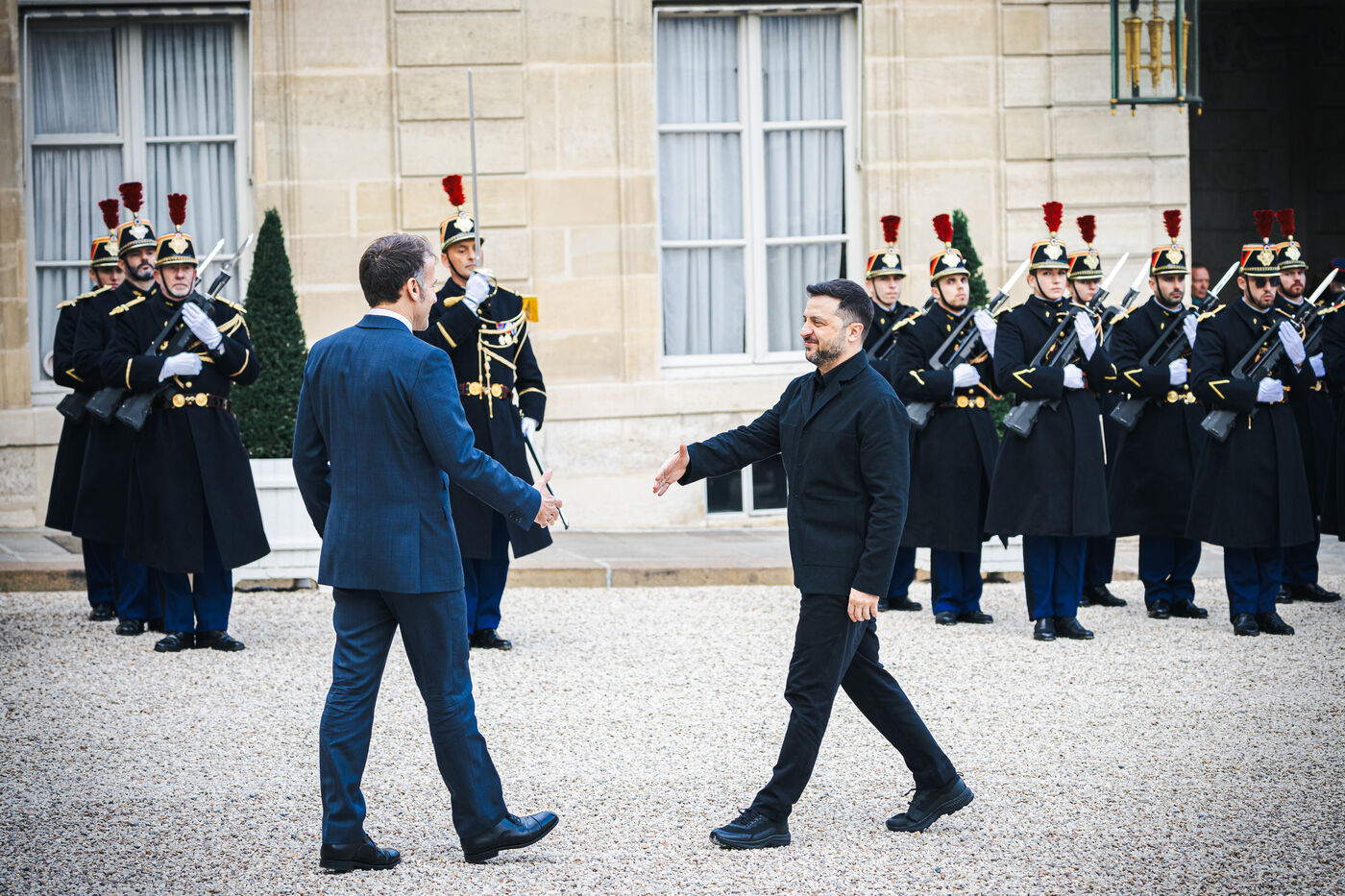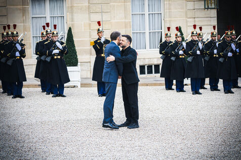 France's President Emmanuel Macron welcomes Ukraine's President Volodymyr Zelensky in the courtyard before their bilateral meeting at the Presidential Elysee Palace in Paris, France on November 17, 2025. Reaffirmation of France's commitment to Ukraine, discussion of bilateral cooperation issues, particularly in the areas of energy, economics and defence (armaments, arms sales, signing of a letter of intent for the purchase of 100 Rafale aircraft from France).