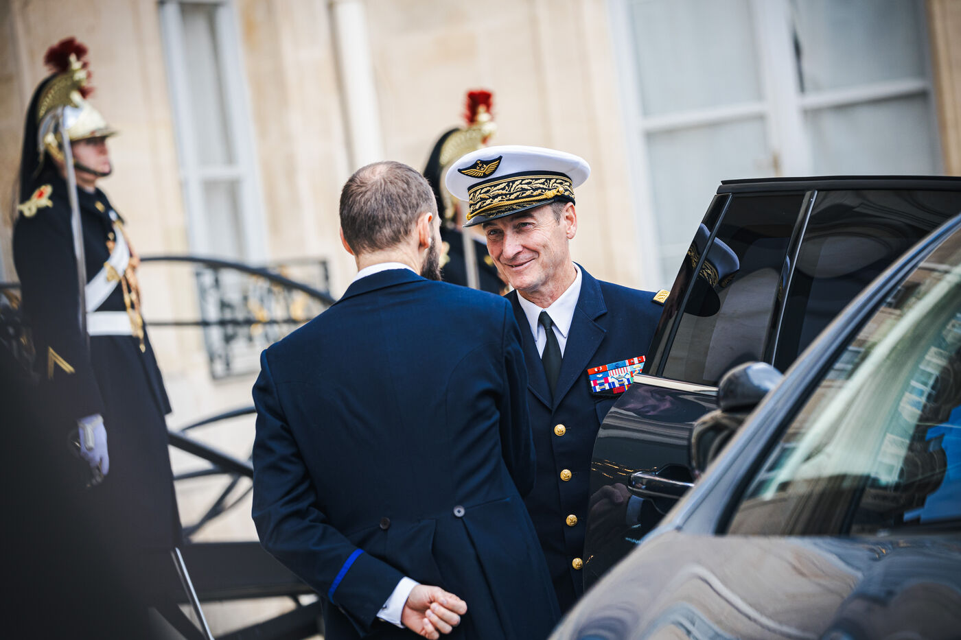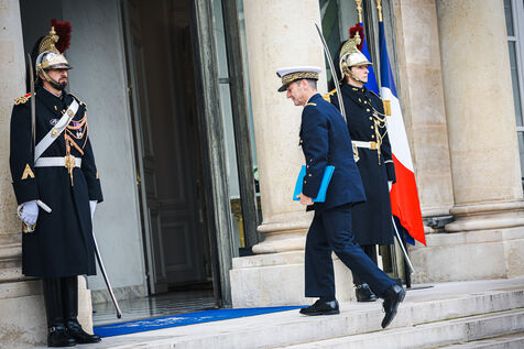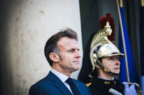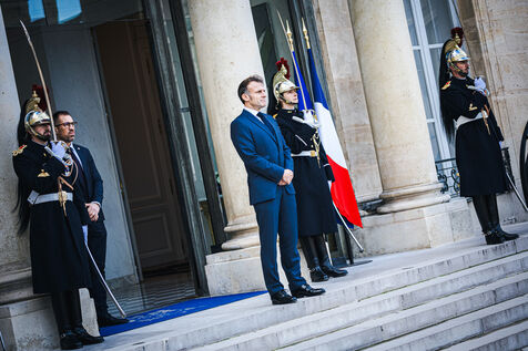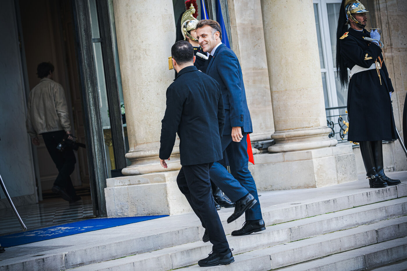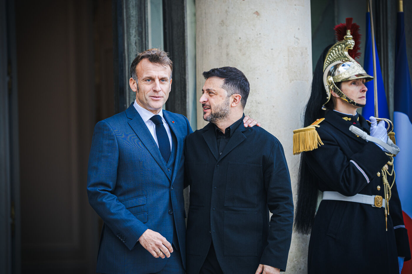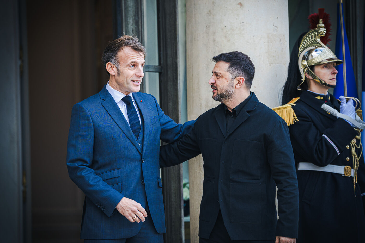 France's President Emmanuel Macron welcomes Ukraine's President Volodymyr Zelensky in the courtyard before their bilateral meeting at the Presidential Elysee Palace in Paris, France on November 17, 2025. Reaffirmation of France's commitment to Ukraine, discussion of bilateral cooperation issues, particularly in the areas of energy, economics and defence (armaments, arms sales, signing of a letter of intent for the purchase of 100 Rafale aircraft from France).