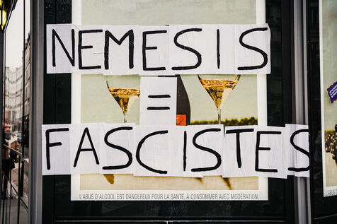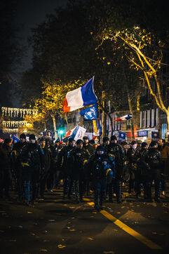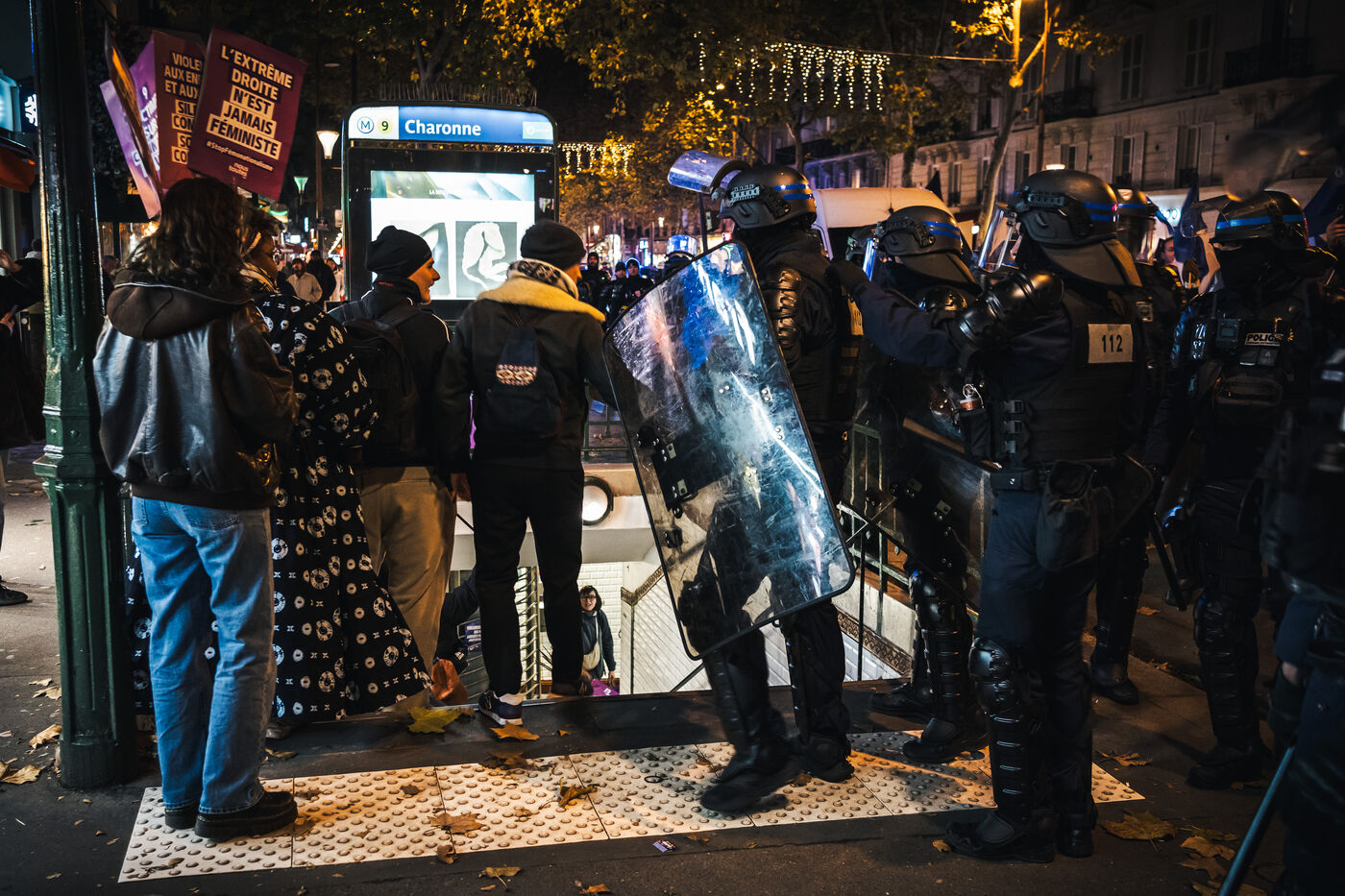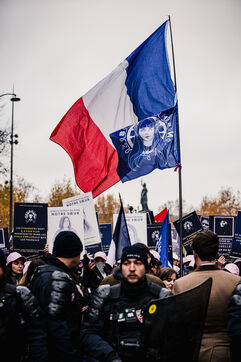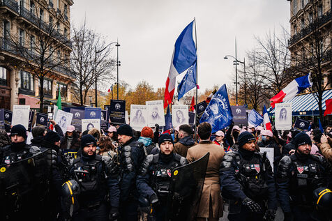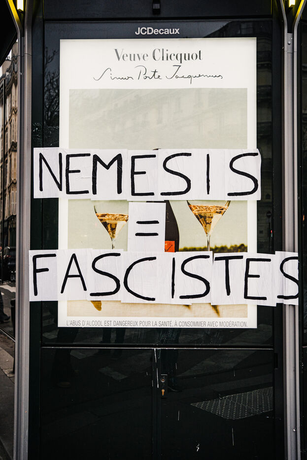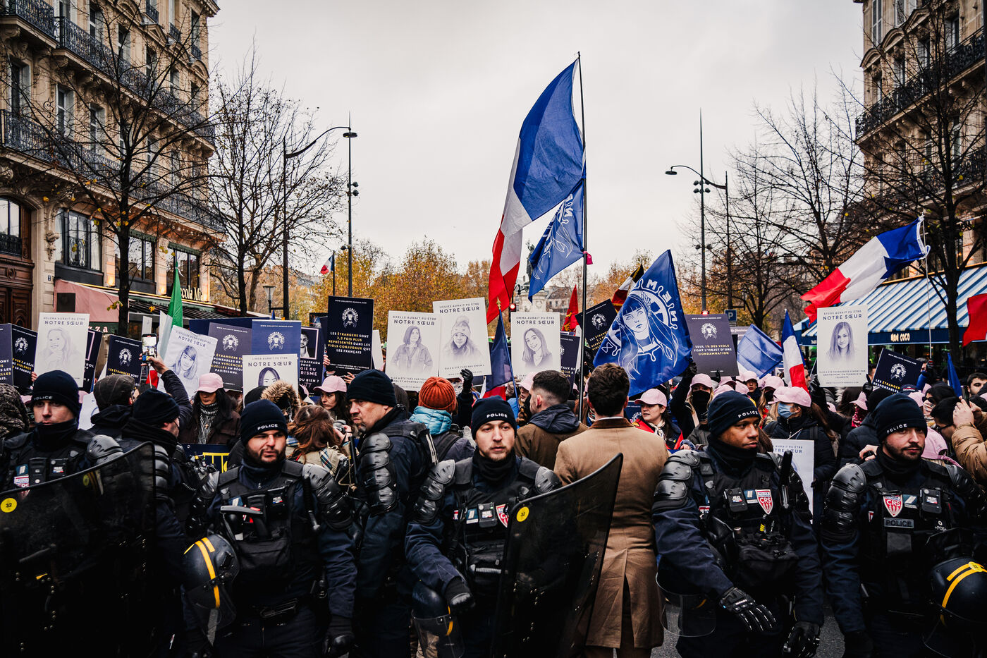 Presence of the extreme right-wing collective Nemesis (identitarians) protected by a large police and security presence at the end of the feminist demonstration against sexist and sexual violence against women, organised by the Greve feministe collective, which brings together several trade unions, associations and collectives, including the Nous Toutes collective, which fights against gender-based violence, in Paris, France on November 22, 2025. Mobilisation a few days before November 25, the International Day for the Elimination of Violence against Women and Gender Minorities.
