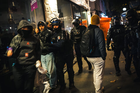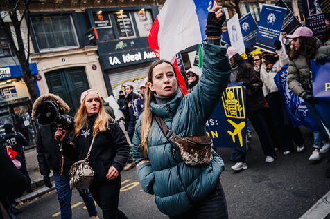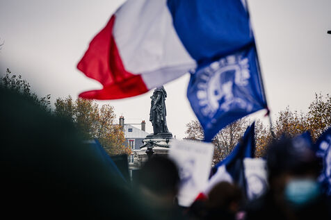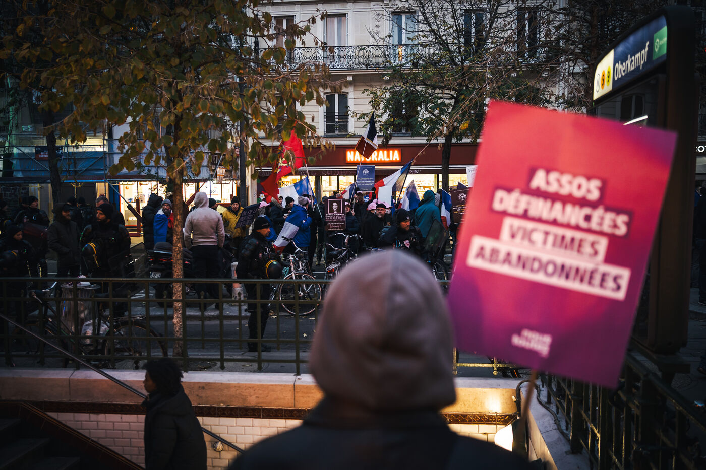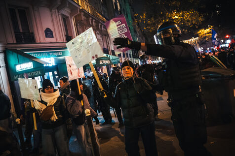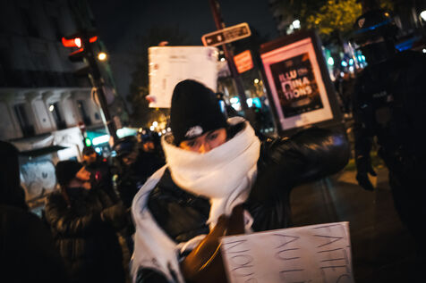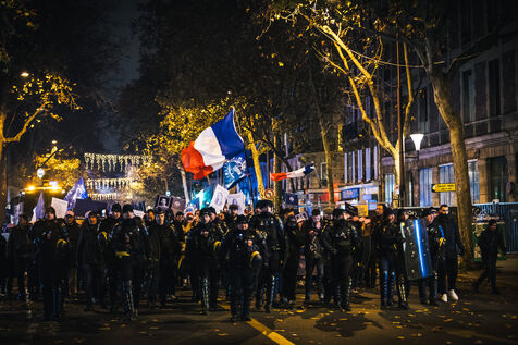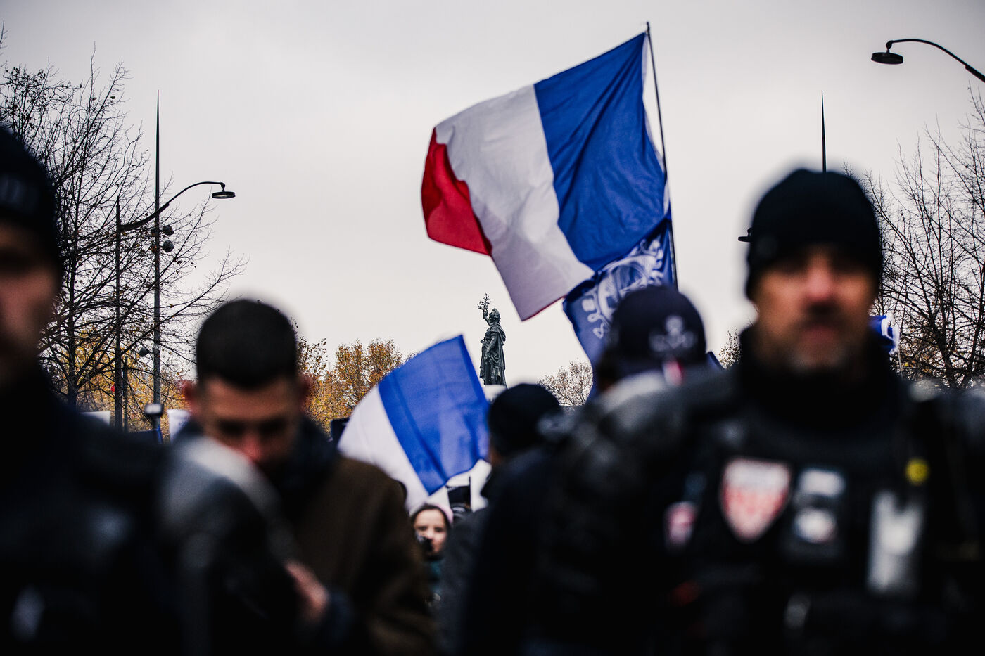 Presence of the extreme right-wing collective Nemesis (identitarians) protected by a large police and security presence at the end of the feminist demonstration against sexist and sexual violence against women, organised by the Greve feministe collective, which brings together several trade unions, associations and collectives, including the Nous Toutes collective, which fights against gender-based violence, in Paris, France on November 22, 2025. Mobilisation a few days before November 25, the International Day for the Elimination of Violence against Women and Gender Minorities.