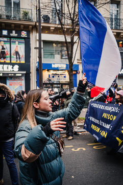 Présence du collectif d'extrême droite Némésis (identitaires) protégés par un gros dispositif de policiers et de service d'ordre en fin de cortège de la manifestation féministe contre les violences sexistes et sexuelles faites aux femmes, à l'appel du collectif Grève féministe qui regroupe plusieurs syndicats, associations et collectifs dont le collectif Nous Toutes qui lutte contre les violences de genre, à Paris, France le 22 novembre 2025. Mobilisation quelques jours avant le 25 novembre, journee internationale de lutte contre les violences faites aux femmes et aux minorites de genre.