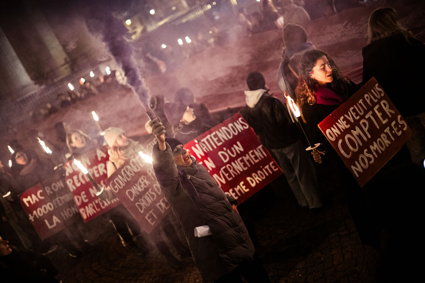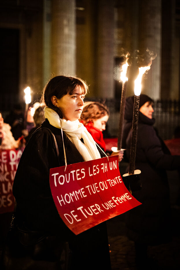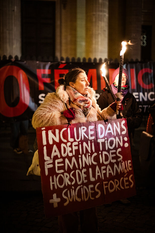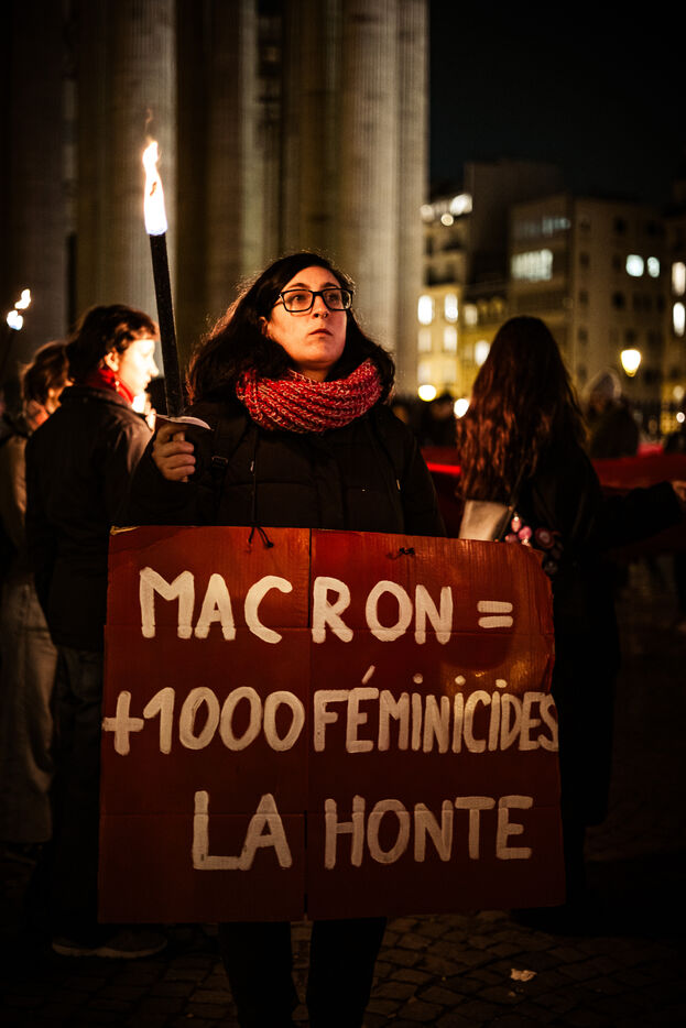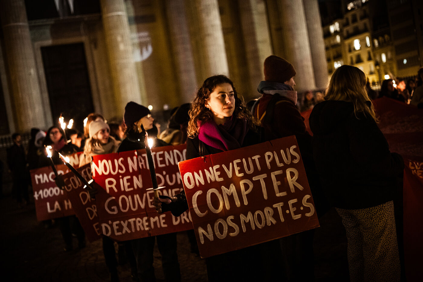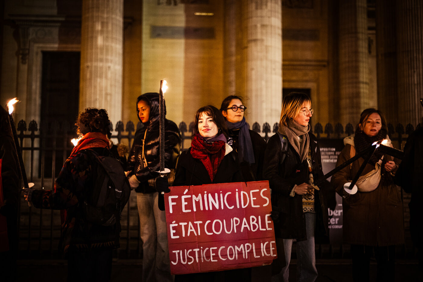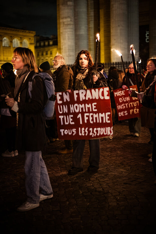 Night-time gathering in the form of a femmage (tribute to murdered women) organised by the Nous Toutes collective, which fights against gender-based and sexual violence against women and gender minorities and counts the number of femicides, at the Place du Pantheon in Paris, France on November 25, 2025. The participants hold torches and placards, shout their anger and denounce the failings of the state, reading out the names of all the women who were victims of feminicide in 2025.