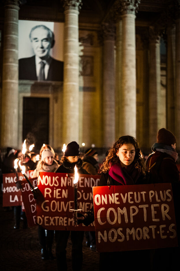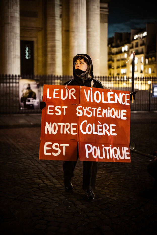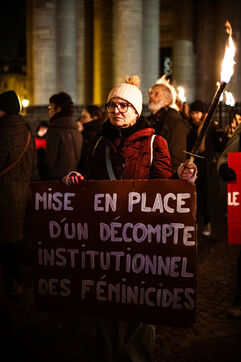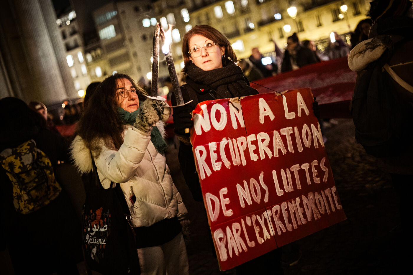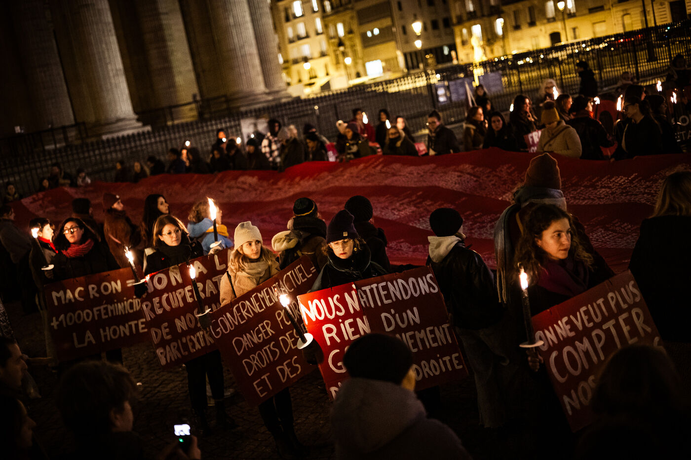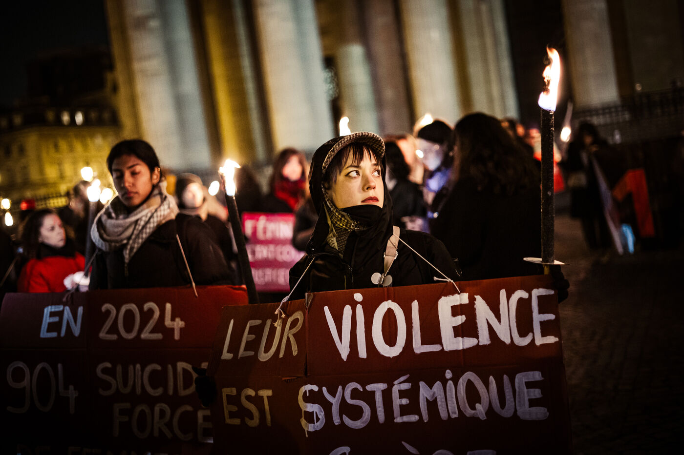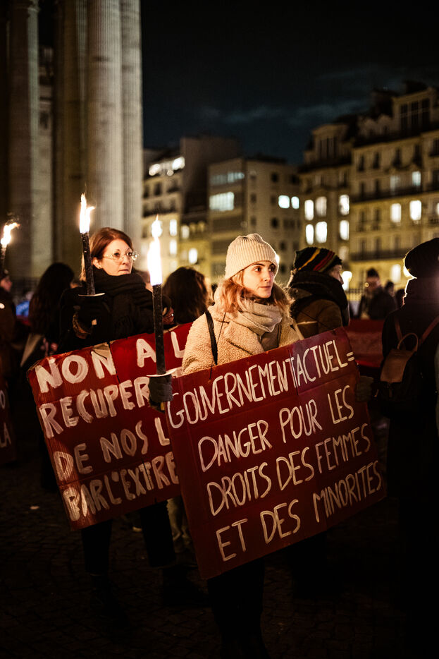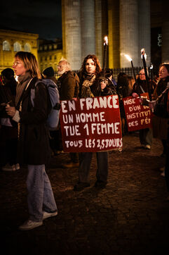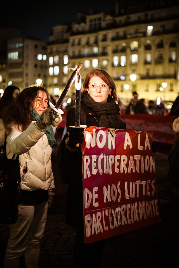 Night-time gathering in the form of a femmage (tribute to murdered women) organised by the Nous Toutes collective, which fights against gender-based and sexual violence against women and gender minorities and counts the number of femicides, at the Place du Pantheon in Paris, France on November 25, 2025. The participants hold torches and placards, shout their anger and denounce the failings of the state, reading out the names of all the women who were victims of feminicide in 2025.