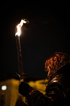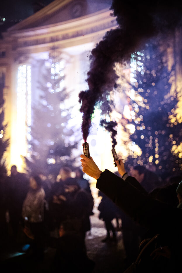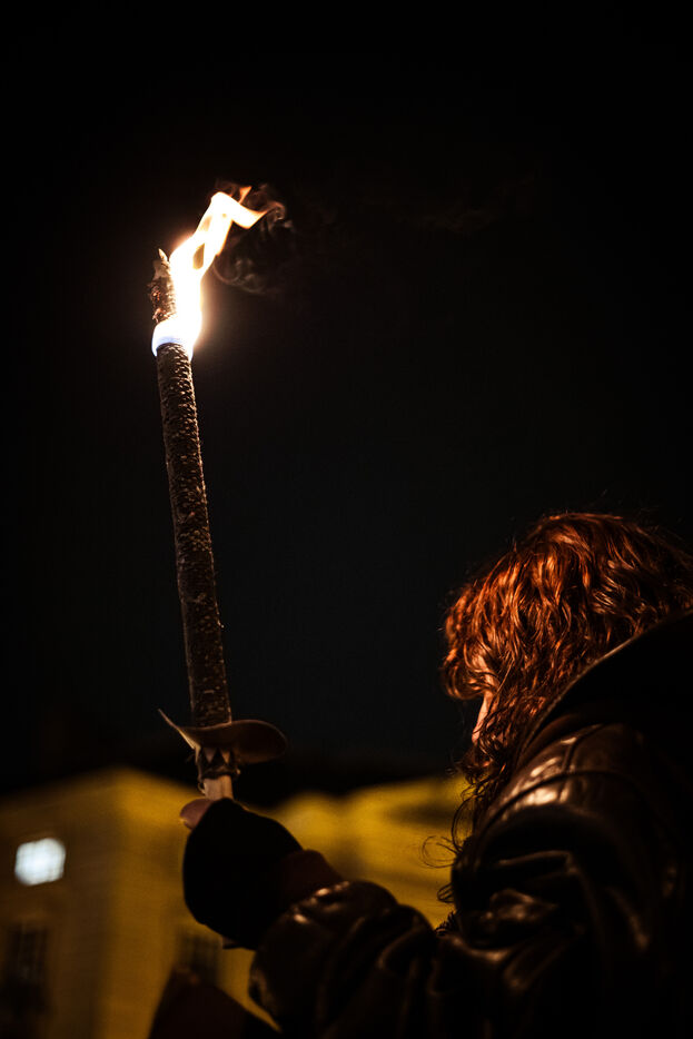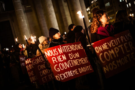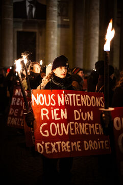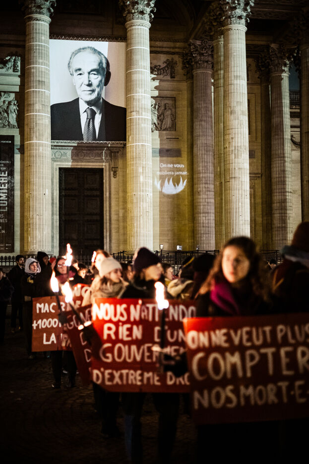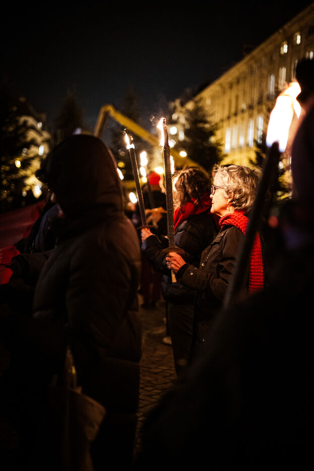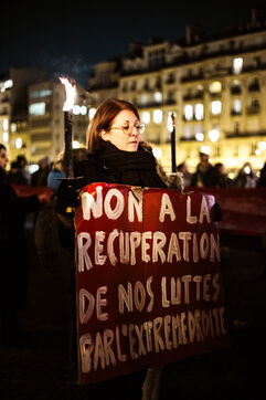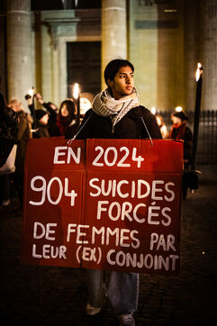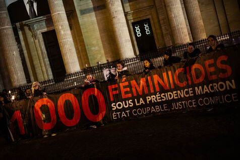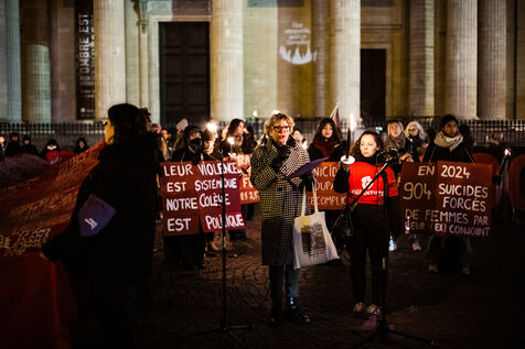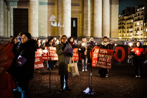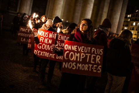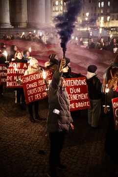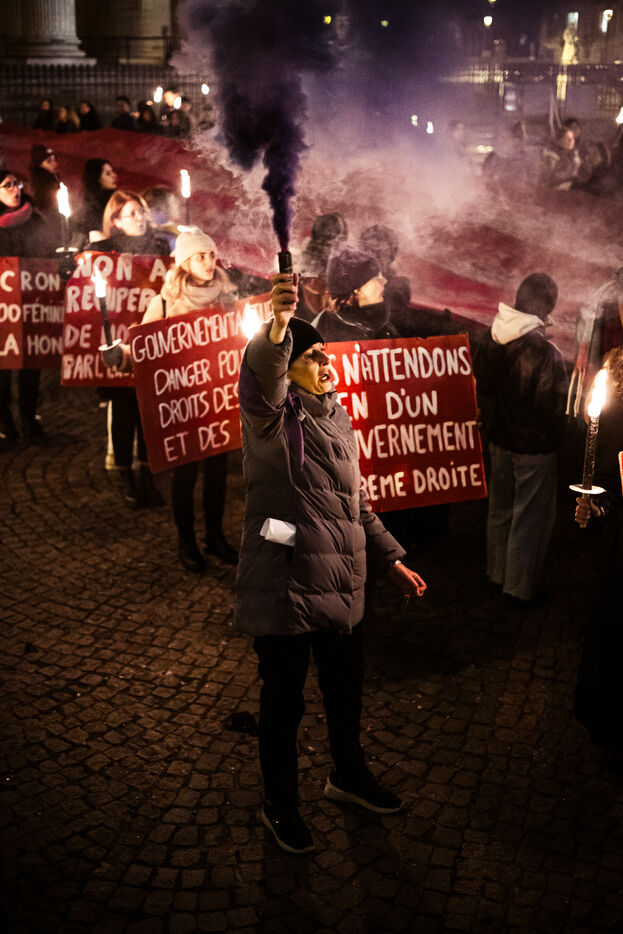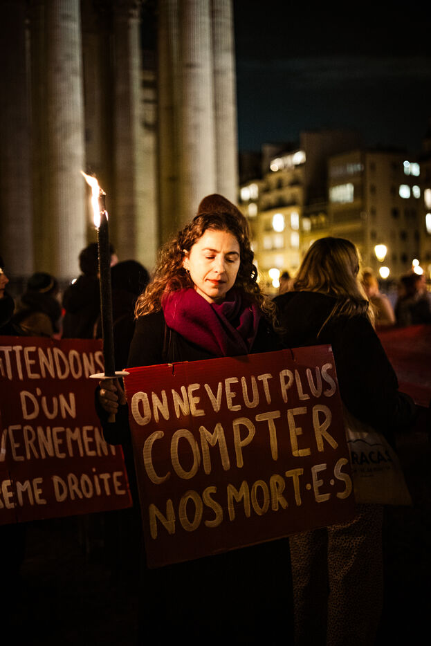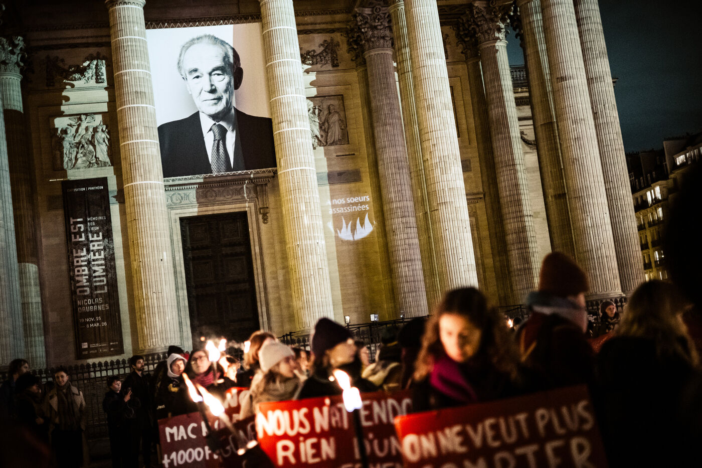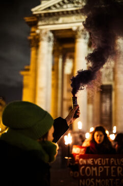 Night-time gathering in the form of a femmage (tribute to murdered women) organised by the Nous Toutes collective, which fights against gender-based and sexual violence against women and gender minorities and counts the number of femicides, at the Place du Pantheon in Paris, France on November 25, 2025. The participants hold torches and placards, shout their anger and denounce the failings of the state, reading out the names of all the women who were victims of feminicide in 2025.