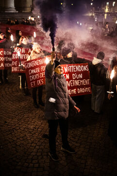 Rassemblement de nuit sous la forme d'une action femmage (hommage aux femmes tuées) organisée par le collectif Nous Toutes qui lutte contre les violences sexistes et sexuelles faites aux femmes et aux minorités de genre et fait un décompte des féminicides, sur la Place du Panthéon à Paris, France le 25 Novembre 2025. Les participantes tiennent des flambeaux et des pancartes, crient leur colère et dénoncent les défaillance de l'état, lecture des noms de toutes les femmes victimes de féminicides en 2025.