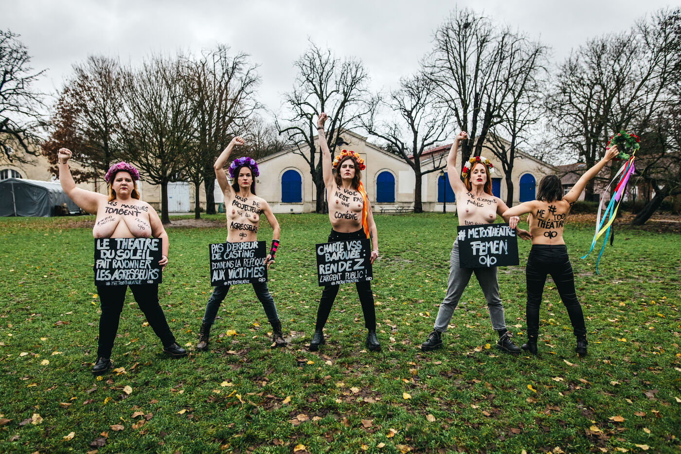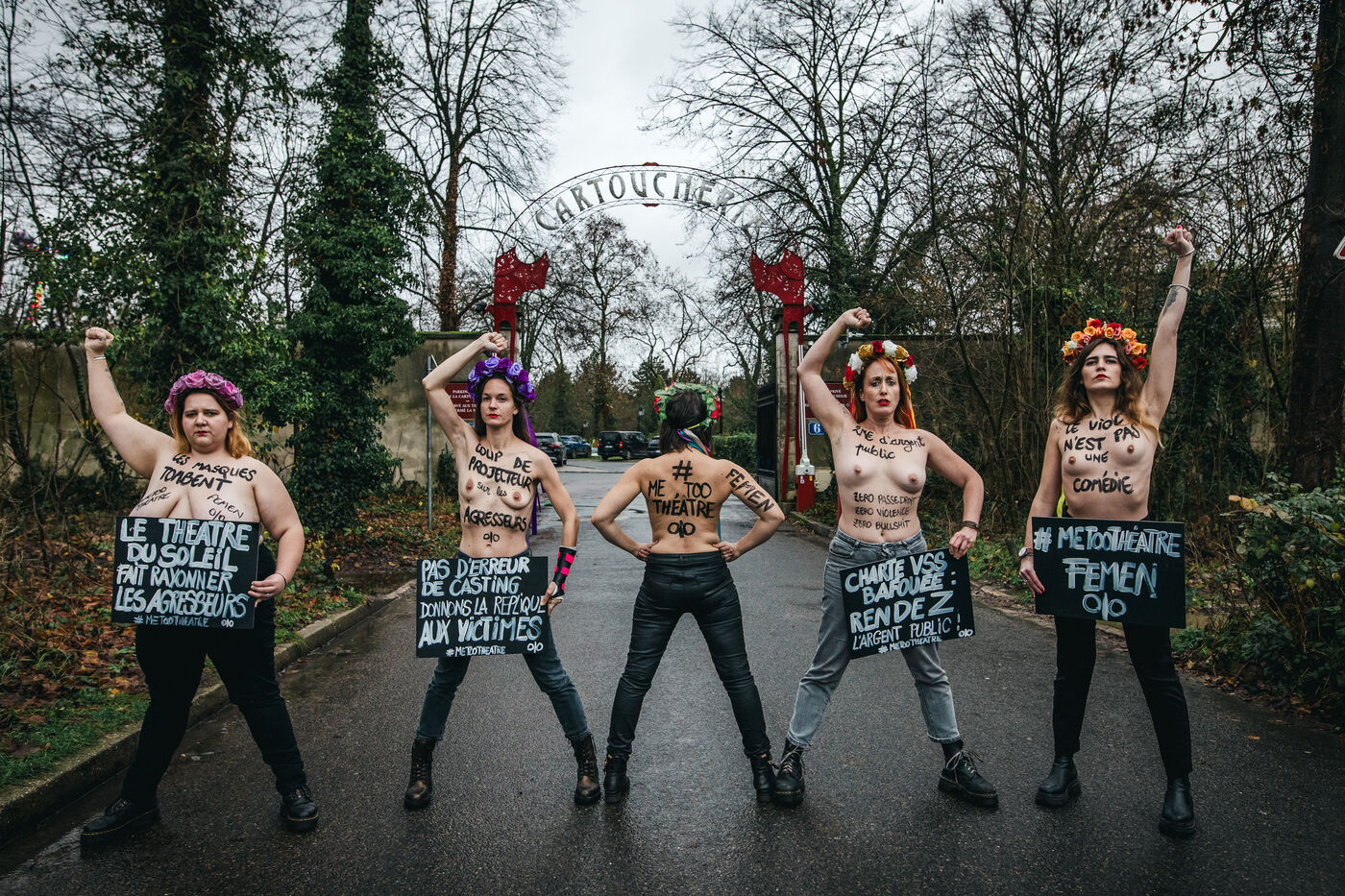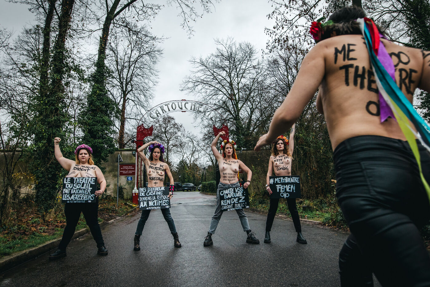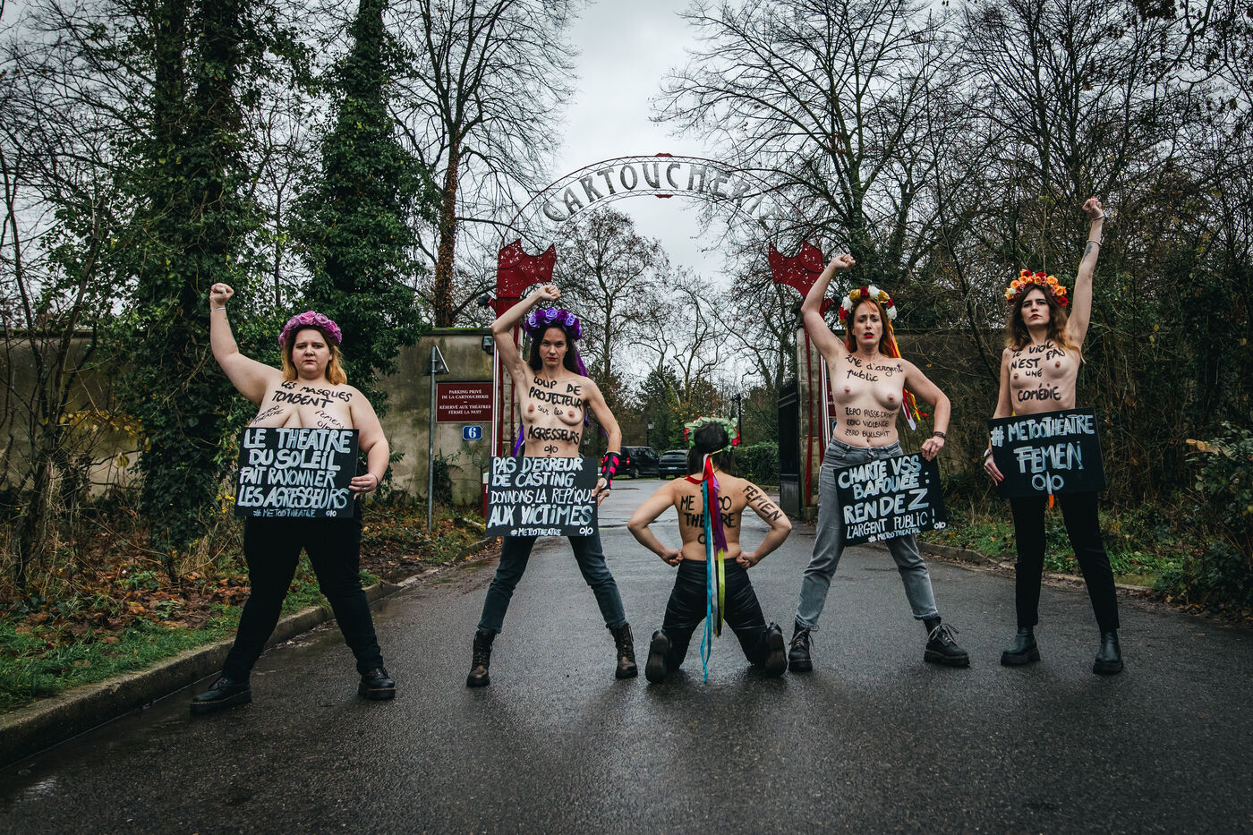 Action by FEMEN activists at La Cartoucherie to denounce the silence of the director of the Theatre de Soleil following accusations by women victims of sexist and sexual violence (sexual assault and rape) within the theatre company (#MeTooTheatre) in the Bois de Vincennes in Paris, France on December 7, 2025. The activists are demonstrating topless and holding placards.
