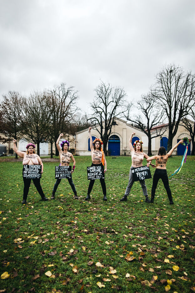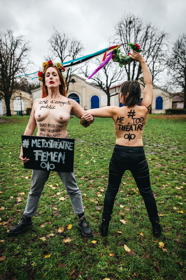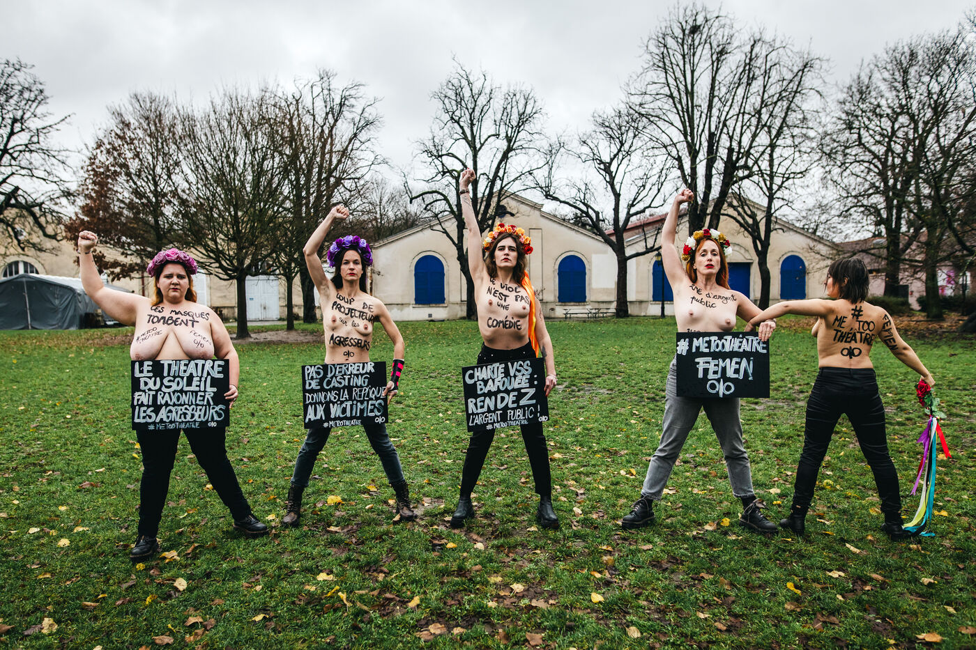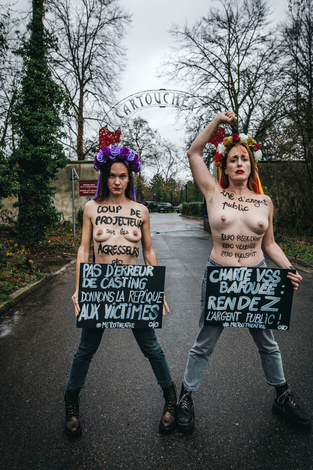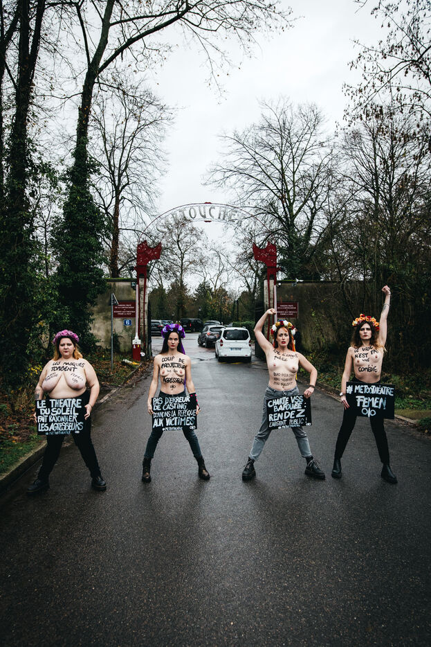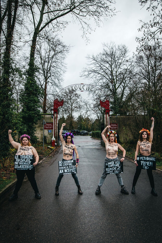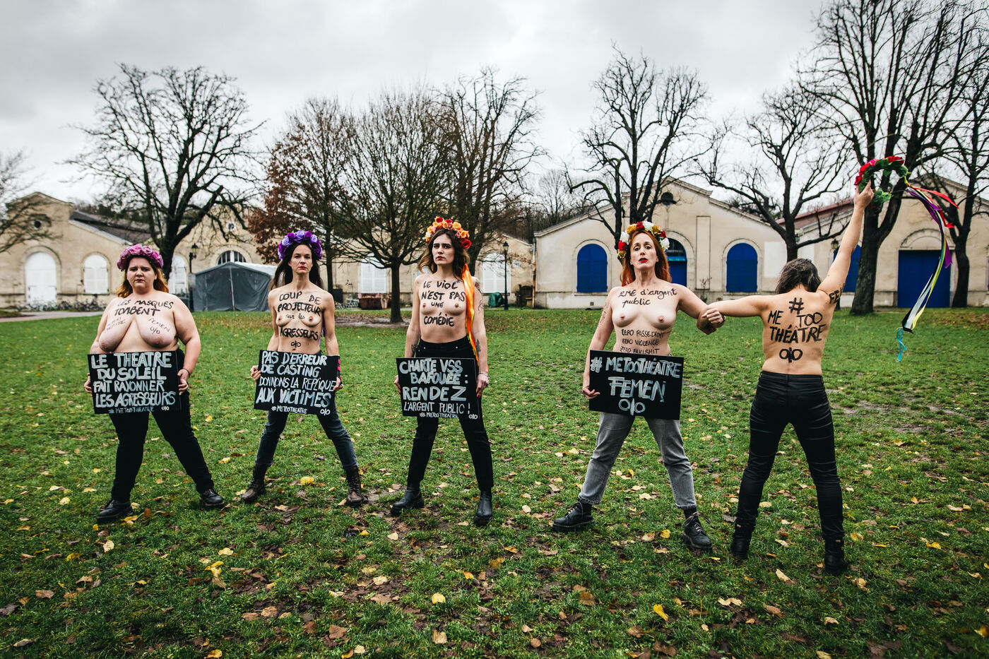 Action by FEMEN activists at La Cartoucherie to denounce the silence of the director of the Theatre de Soleil following accusations by women victims of sexist and sexual violence (sexual assault and rape) within the theatre company (#MeTooTheatre) in the Bois de Vincennes in Paris, France on December 7, 2025. The activists are demonstrating topless and holding placards.