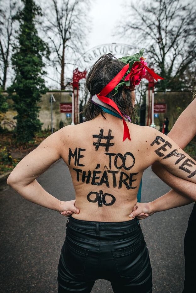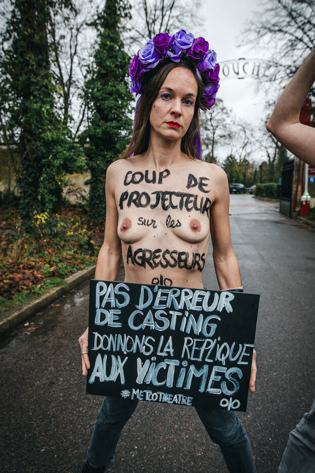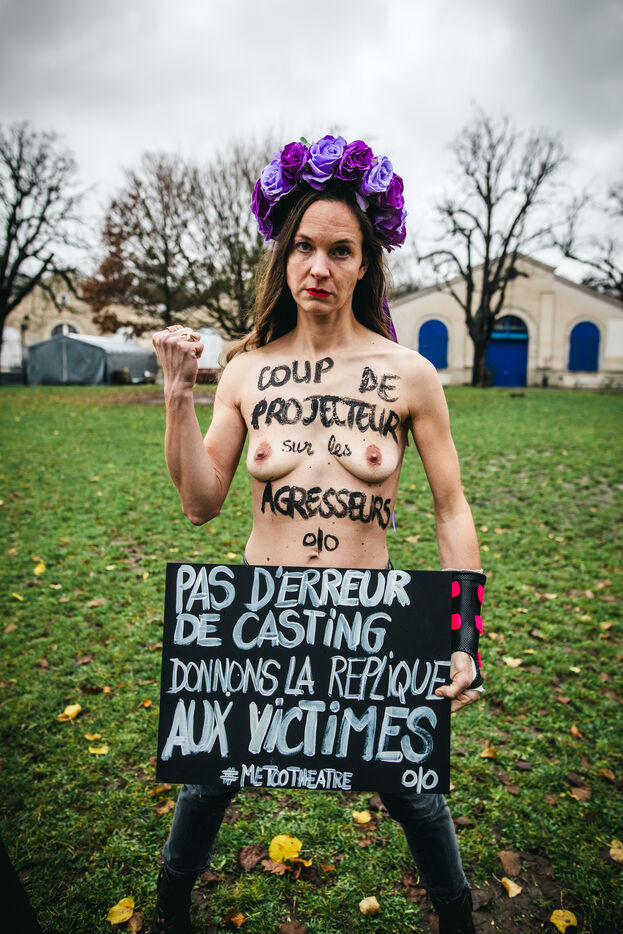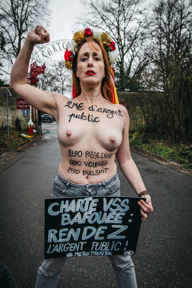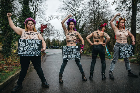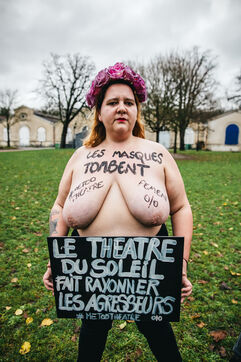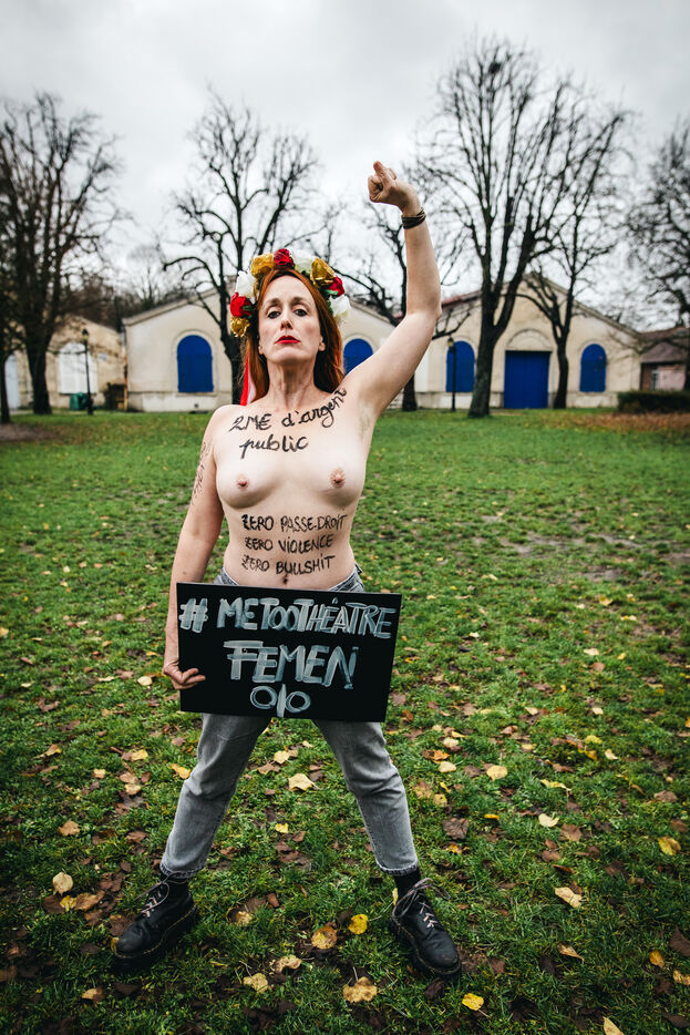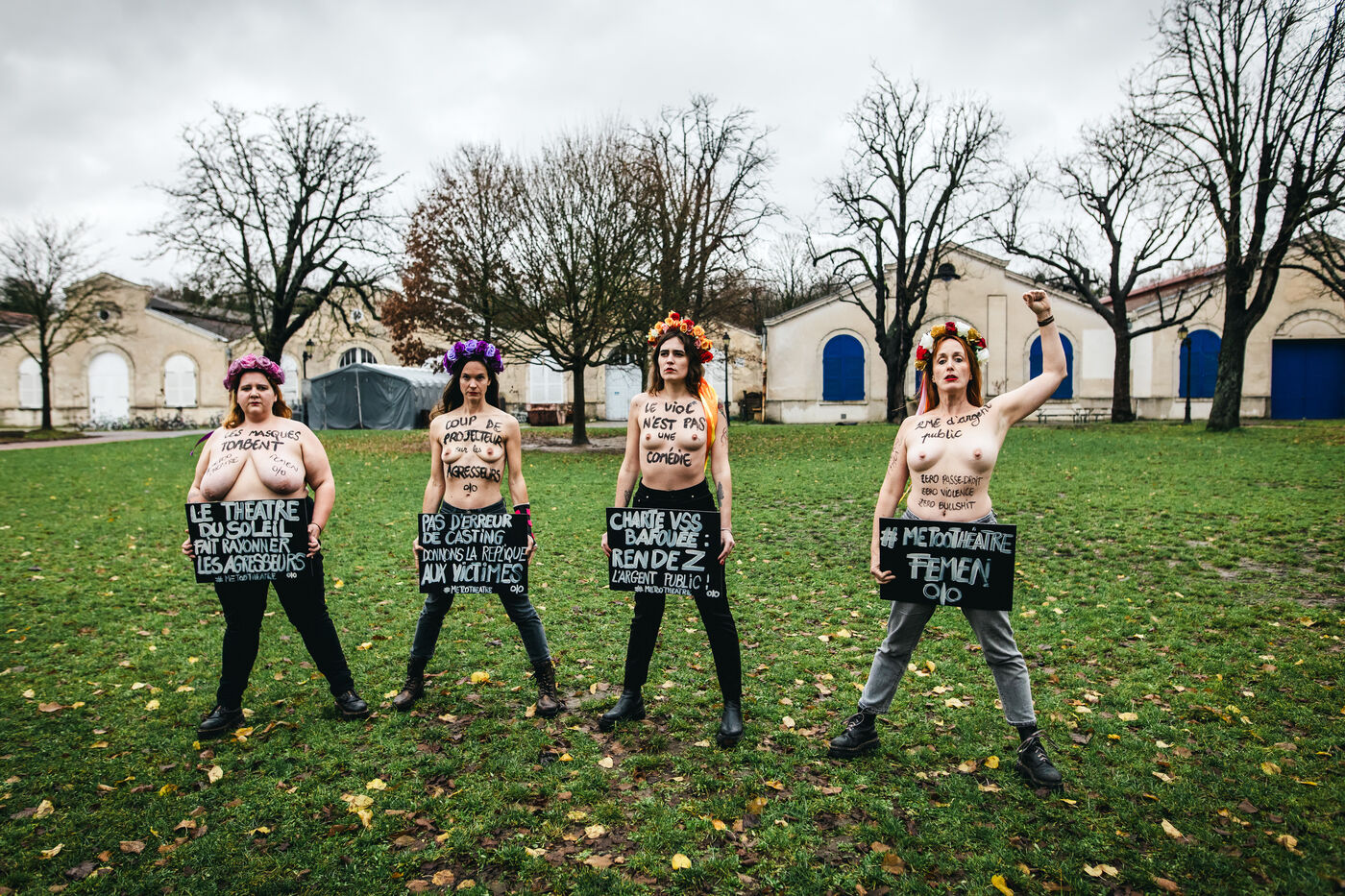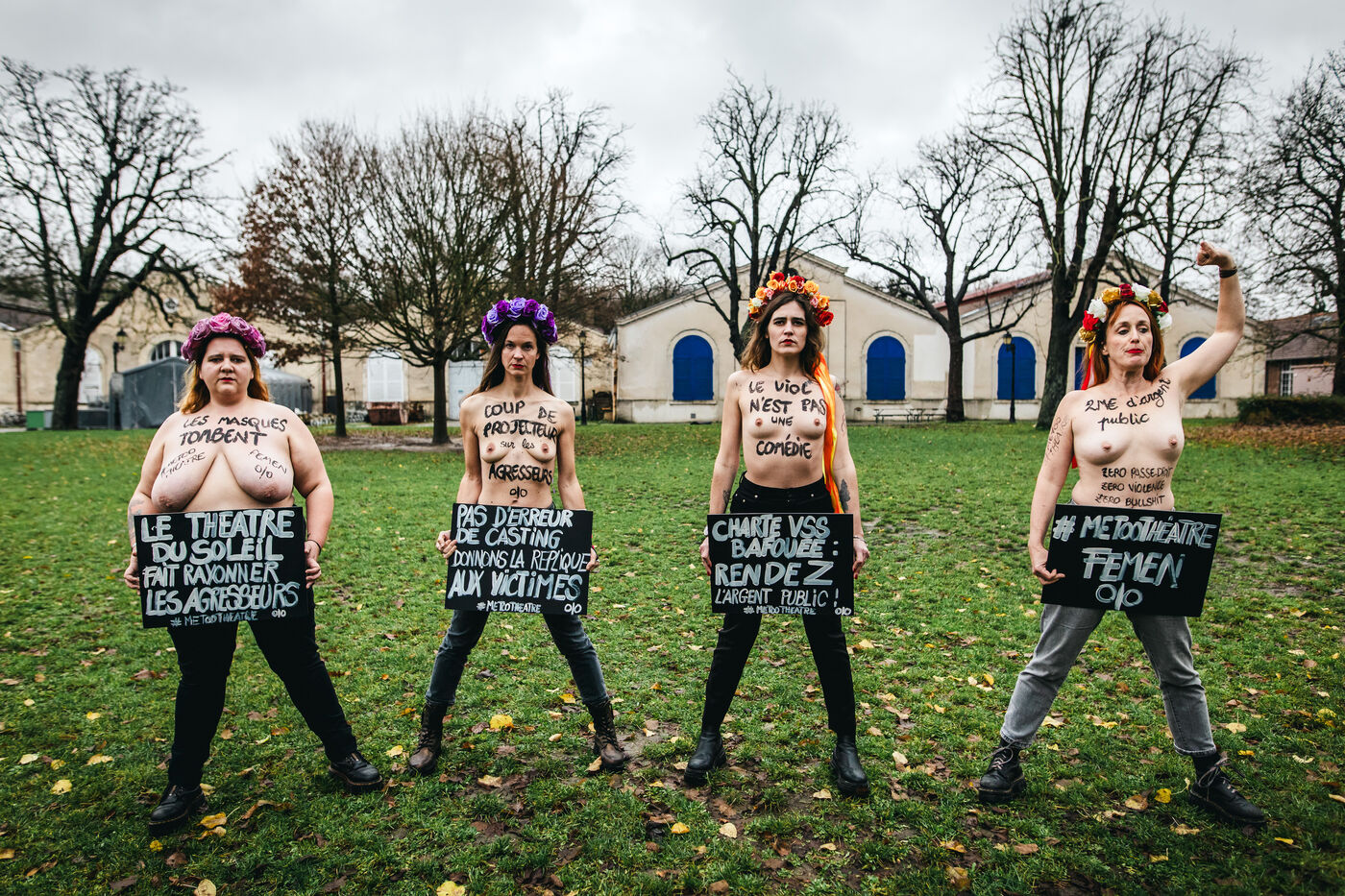 Action by FEMEN activists at La Cartoucherie to denounce the silence of the director of the Theatre de Soleil following accusations by women victims of sexist and sexual violence (sexual assault and rape) within the theatre company (#MeTooTheatre) in the Bois de Vincennes in Paris, France on December 7, 2025. The activists are demonstrating topless and holding placards.