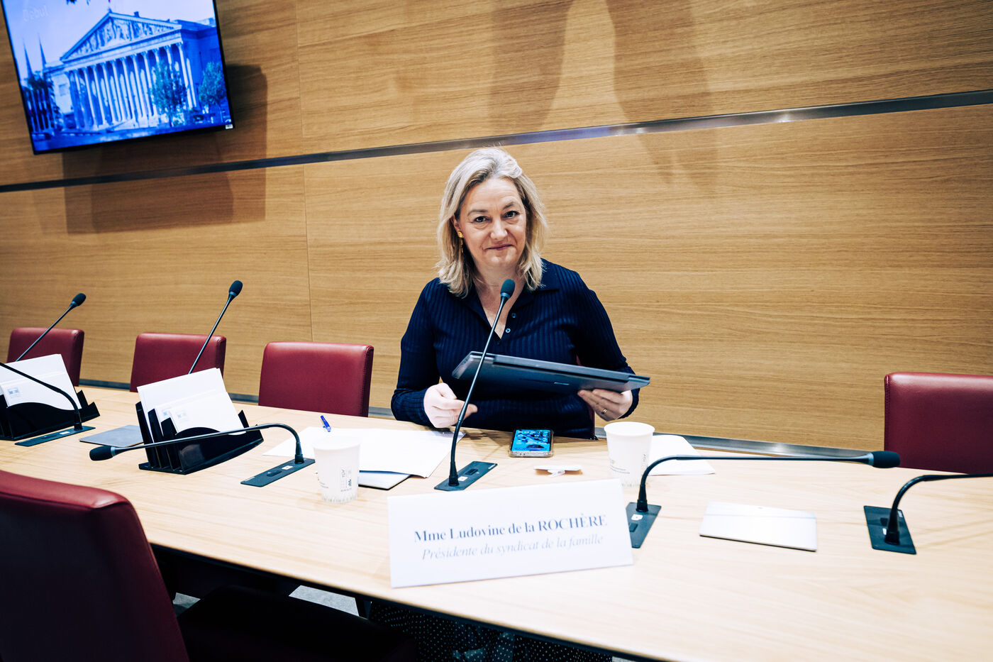 Hearing of Ludovine de La Rochere, president of the family union (formerly Manif pour tous) which campaigned against marriage for all, against same-sex parenting and against surrogacy, by members of the National Assembly's Fact-Finding Mission on the Causes and Consequences of the Decline in Birth Rates in France, Paris, France on December 16, 2025.