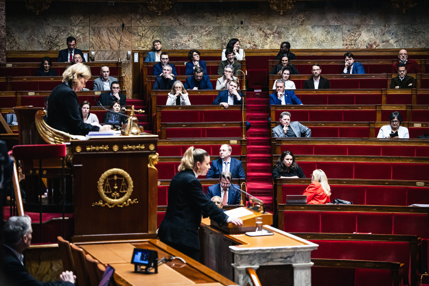 Discussion commune et vote sur deux motions de censure contre le gouvernement Lecornu déposées par les groupes d'opposition La France Insoumise LFI (parti politique de gauche) et le Rassemblement National RN (parti politique d'extreme droite) en application de l'article 49 alinéa 2 de la Constitution suite à la signature de l'accord UE-Mercosur alors que le pays traverse une crise agricole, dans l'hémicycle de l'Assemblée Nationale à Paris, France le 14 Janvier 2026.