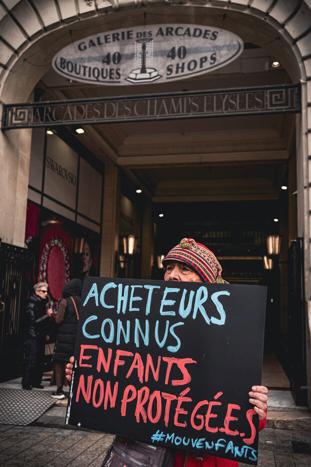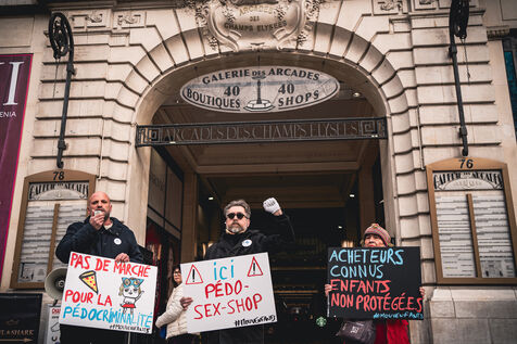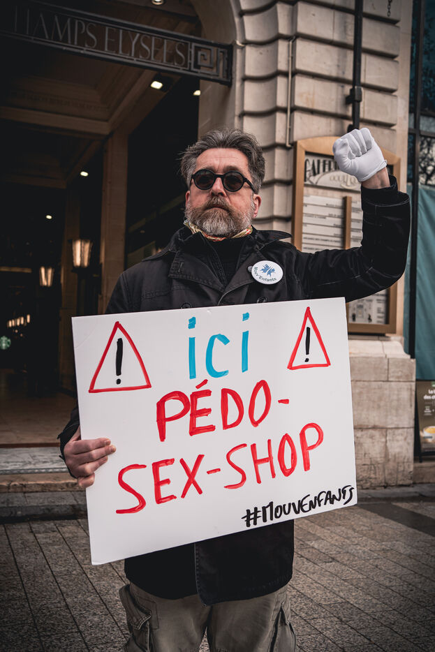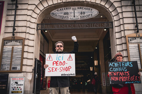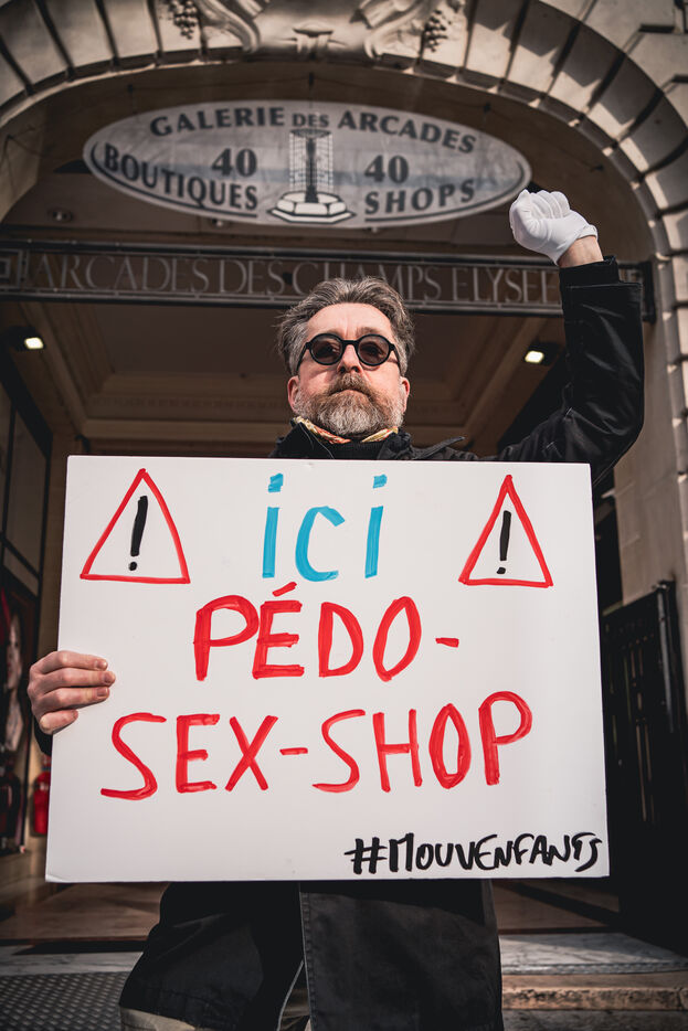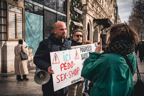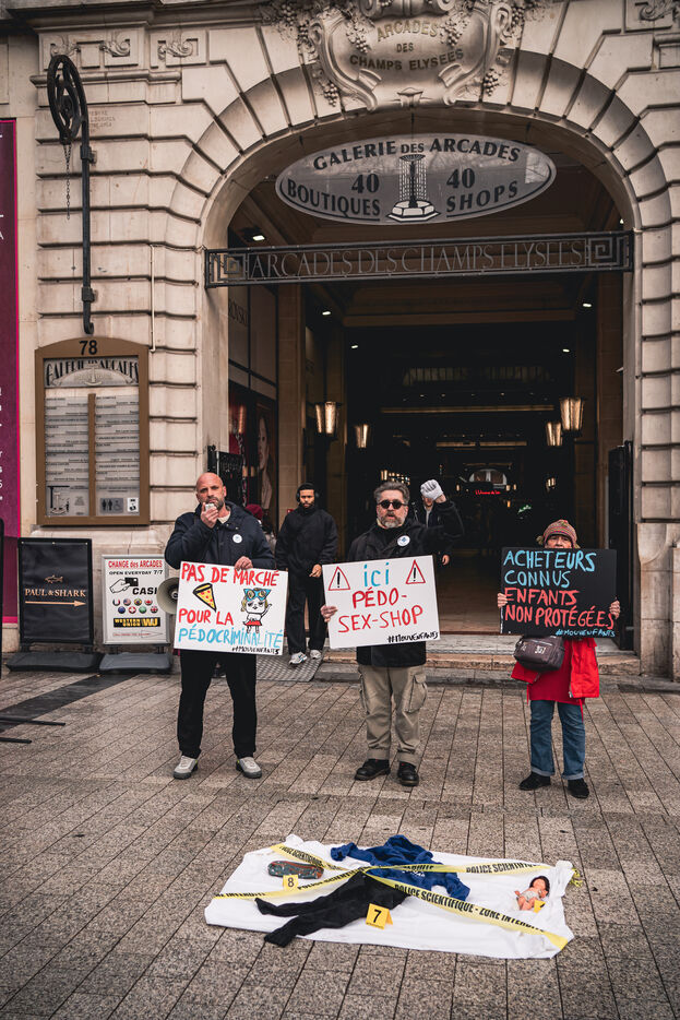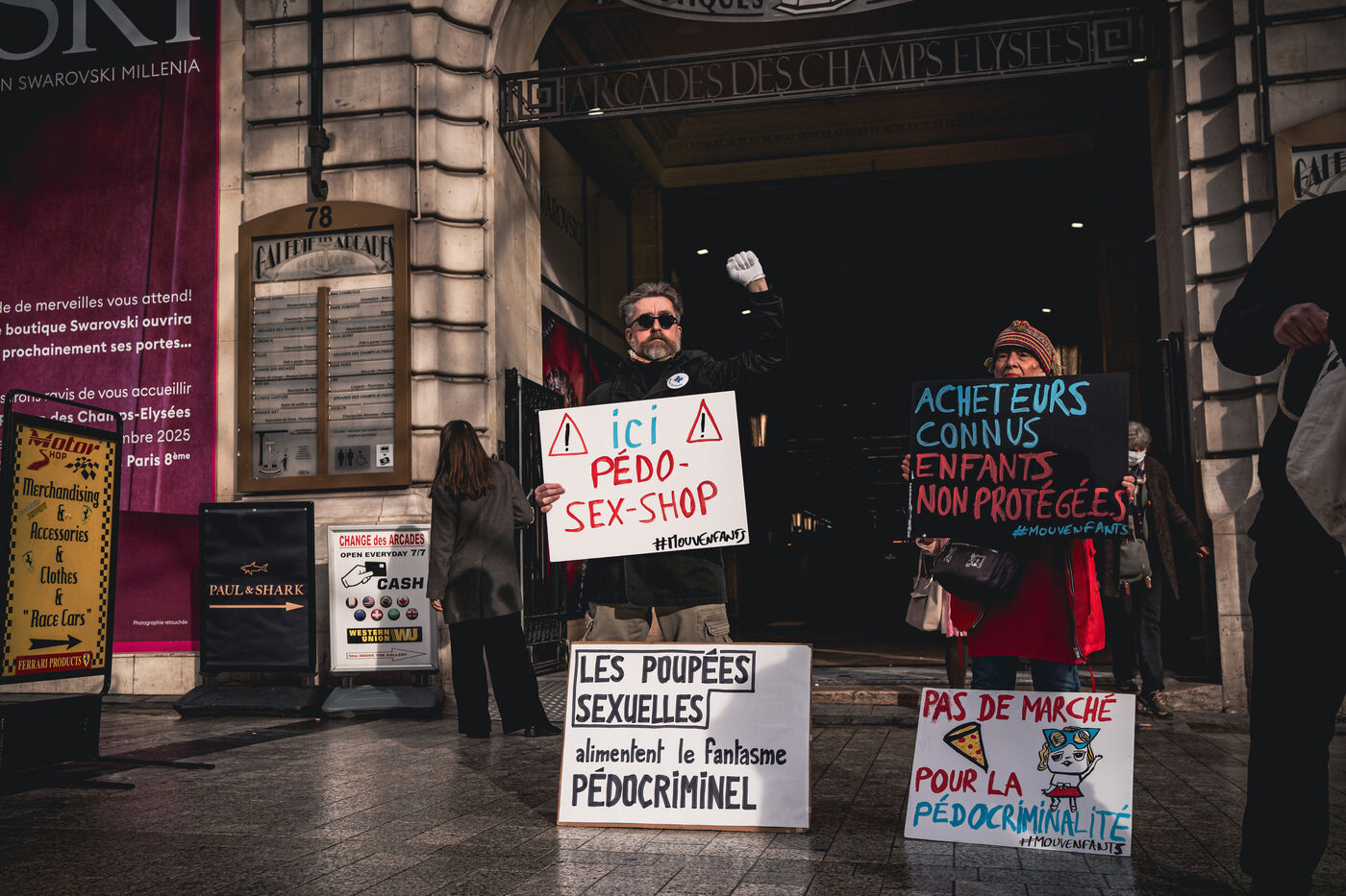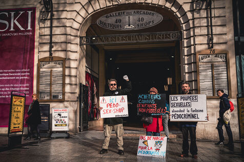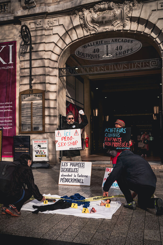 Action by activists from the Mouv'enfants association in front of the entrance to the Galerie des Arcades on the Champs Elysees to denounce the sale by the company Sexy Dolls (headquartered at 78 Avenue des Champs Elysees) of sex dolls with the faces of children and teenagers, in Paris, France on January 14, 2026. Mouv'Enfants is an association that fights against all forms of violence against children and teenagers, they denounce the sale on the sex shop's website of sexualised dolls with child pornographic characteristics representing minors, the company's website has been closed following a report on the Pharos platform.