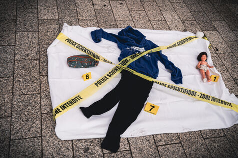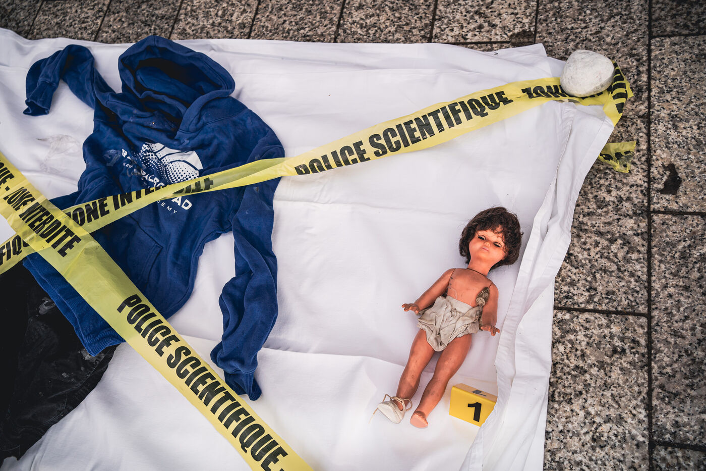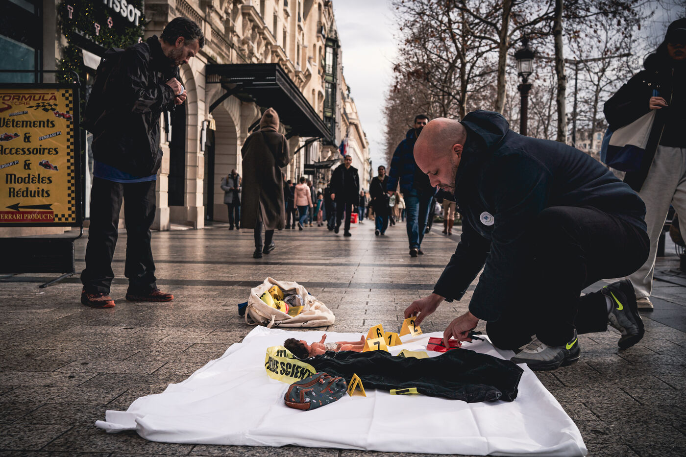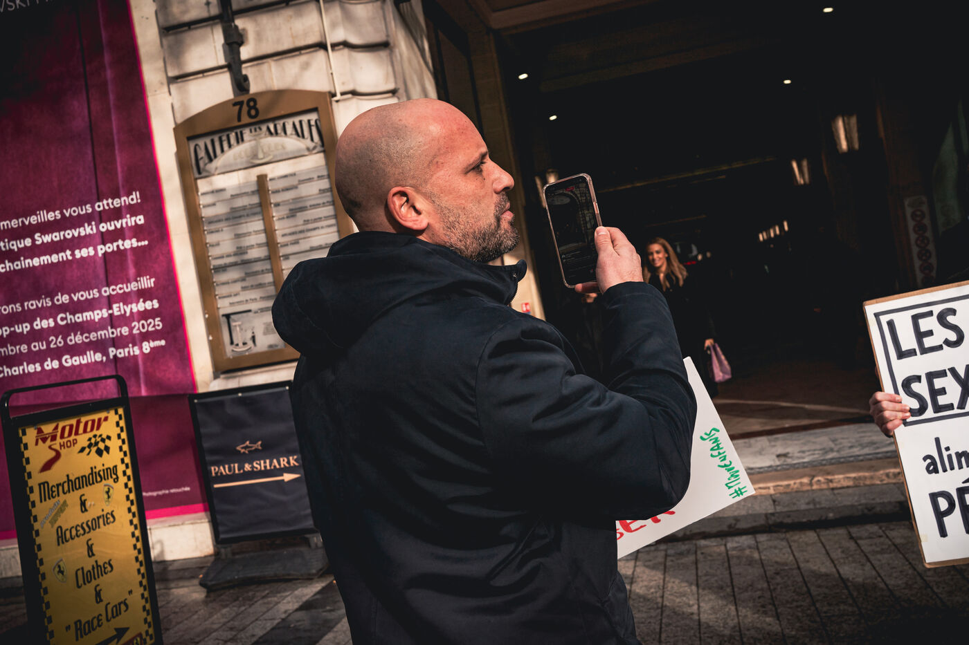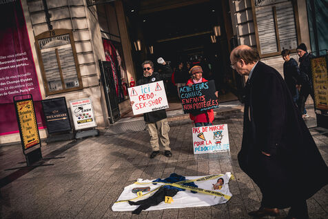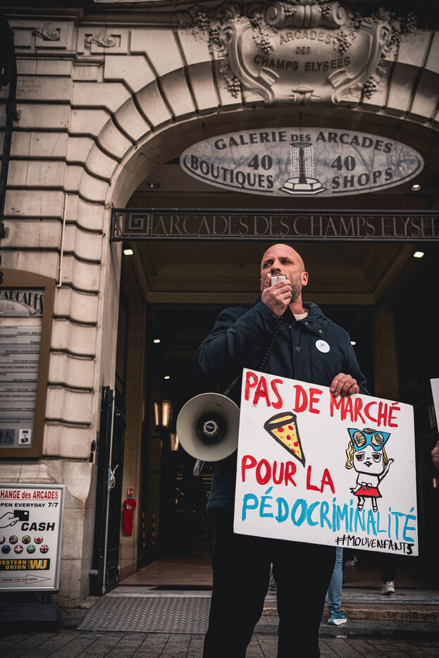 Action by activists from the Mouv'enfants association in front of the entrance to the Galerie des Arcades on the Champs Elysees to denounce the sale by the company Sexy Dolls (headquartered at 78 Avenue des Champs Elysees) of sex dolls with the faces of children and teenagers, in Paris, France on January 14, 2026. Mouv'Enfants is an association that fights against all forms of violence against children and teenagers, they denounce the sale on the sex shop's website of sexualised dolls with child pornographic characteristics representing minors, the company's website has been closed following a report on the Pharos platform.