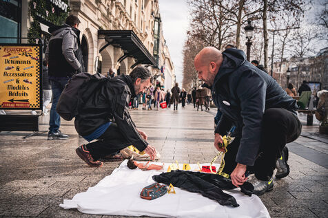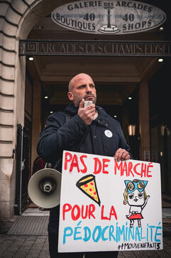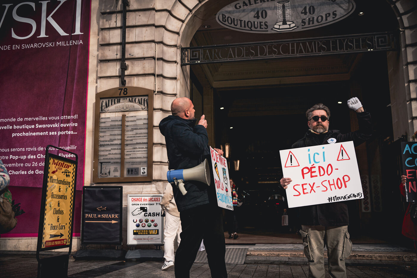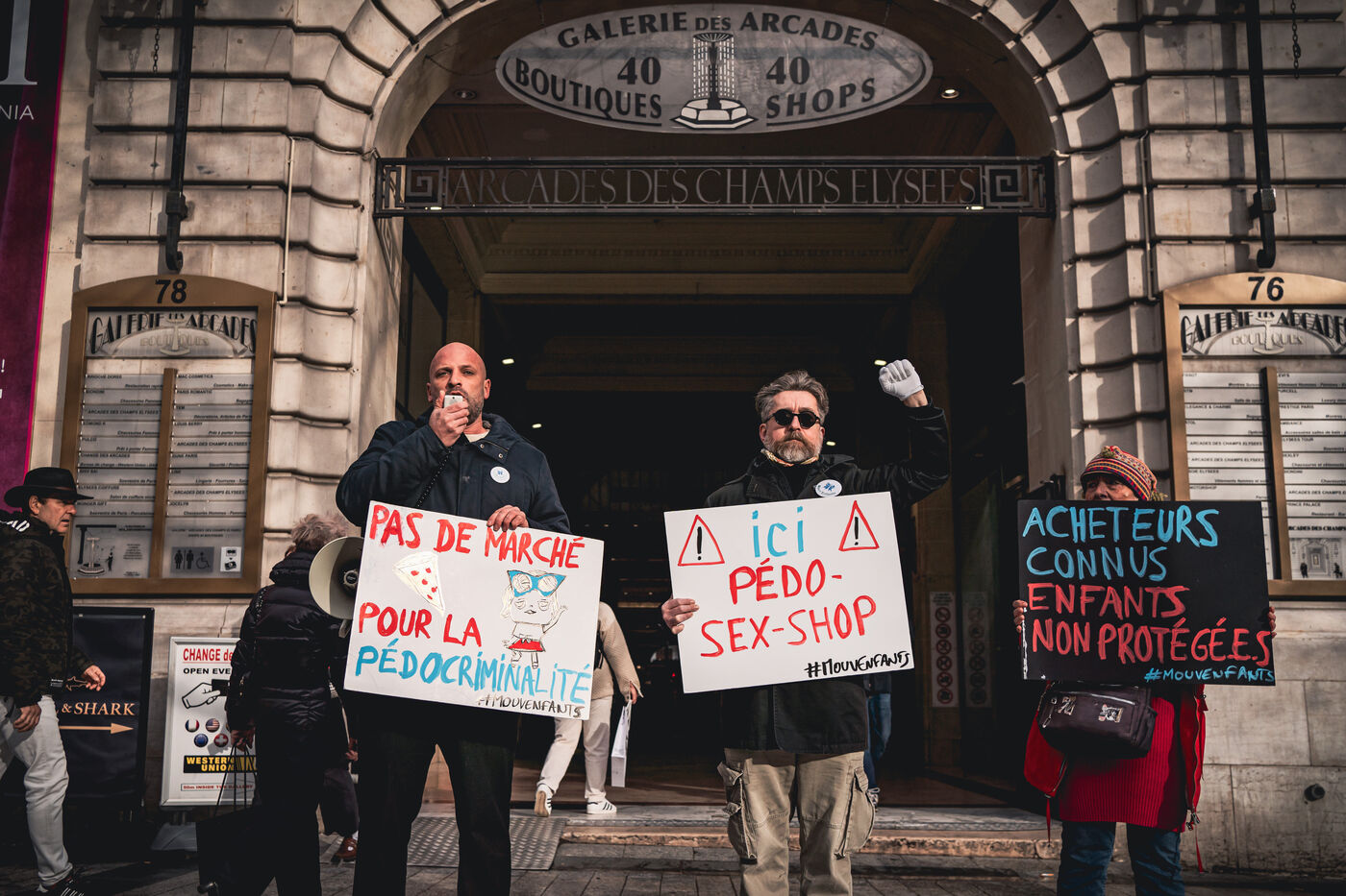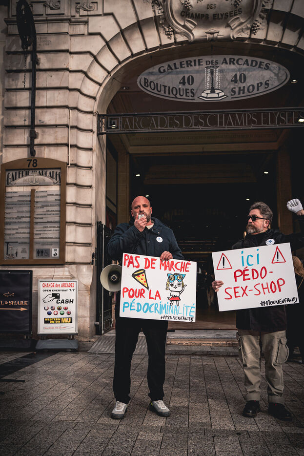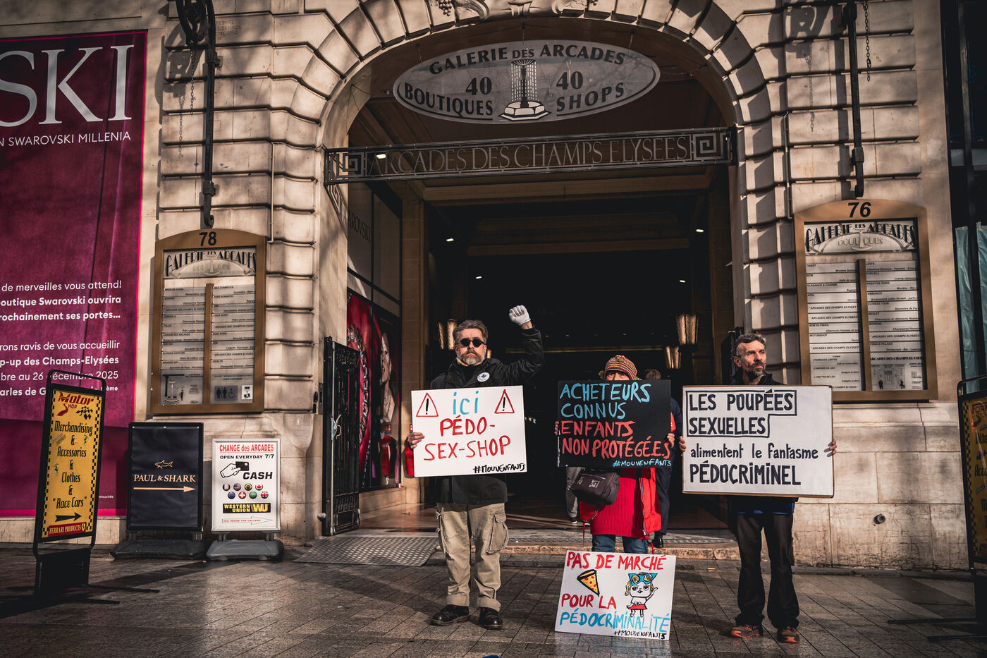 Action des militants et activistes de l'association Mouv'enfants devant l'entree de la Galerie des arcades des Champs Elysees pour denoncer la vente par l'entreprise Sexy Dolls (siege social domicilie au numero 78 de l'avenue des Champs Elysees) de poupees sexuelles a visages d'enfants et adolescents, a Paris, France le 14 Janvier 2026. Mouv'Enfants est une association de lutte contre toutes les formes de violence faites aux enfants et aux adolescents, ils denoncent la vente sur le site internet de l'enseigne sex shop de commerce en ligne de poupees sexualisees a caractere pedopornographique representants des mineurs, le site de l'entreprise a ete ferme suite a signalement sur la plateforme Pharos.