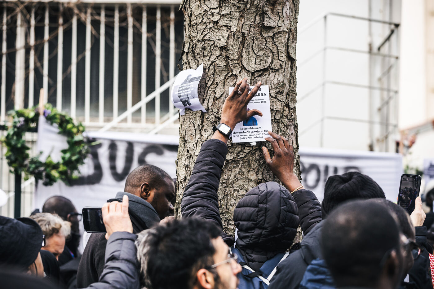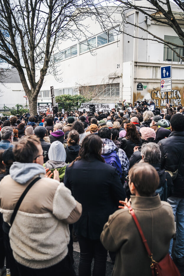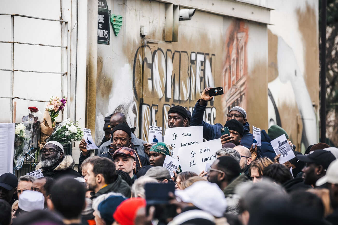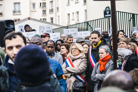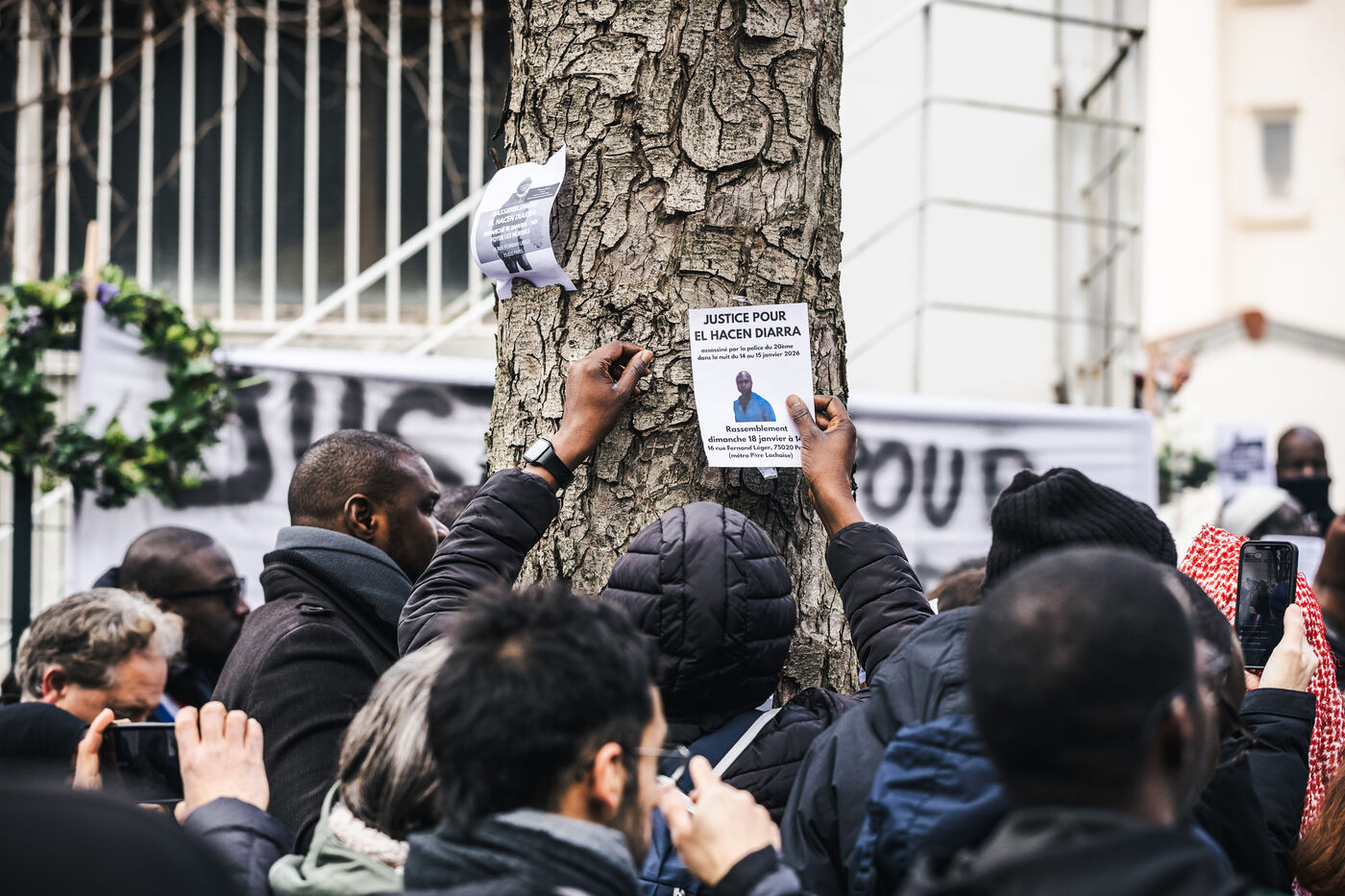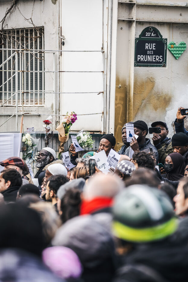 Gathering for El Hacen Diarra in front of the Les Muriers shelter on Rue Ferdinand Leger in Paris, France on January 18, 2026. El Hacen Diarra died in police custody following a cardiac arrest on the night of Wednesday 14 to Thursday 15 January around midnight at the central police station in the 20th arrondissement following an arrest involving the use of a taser by police officers for possession of narcotics, a complaint has been filed by the family for police violence.
