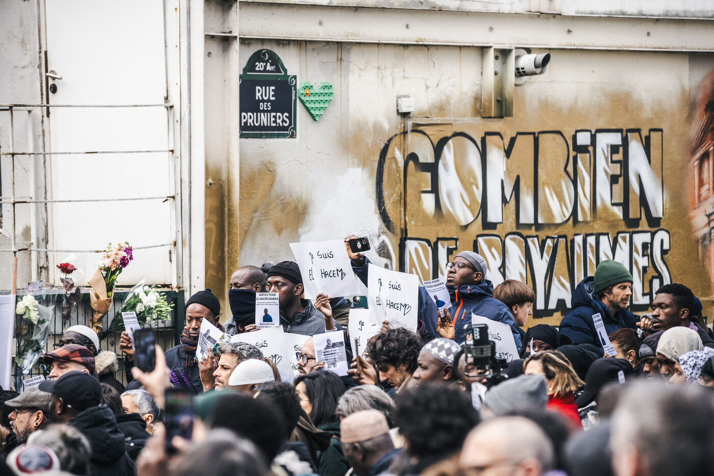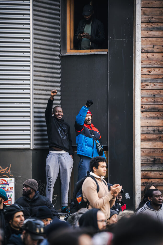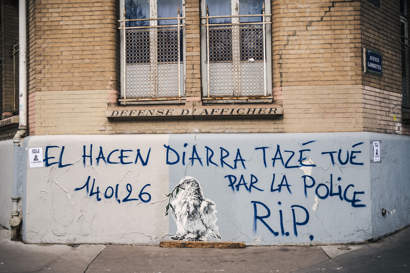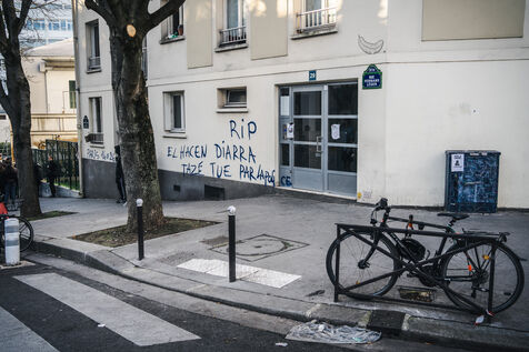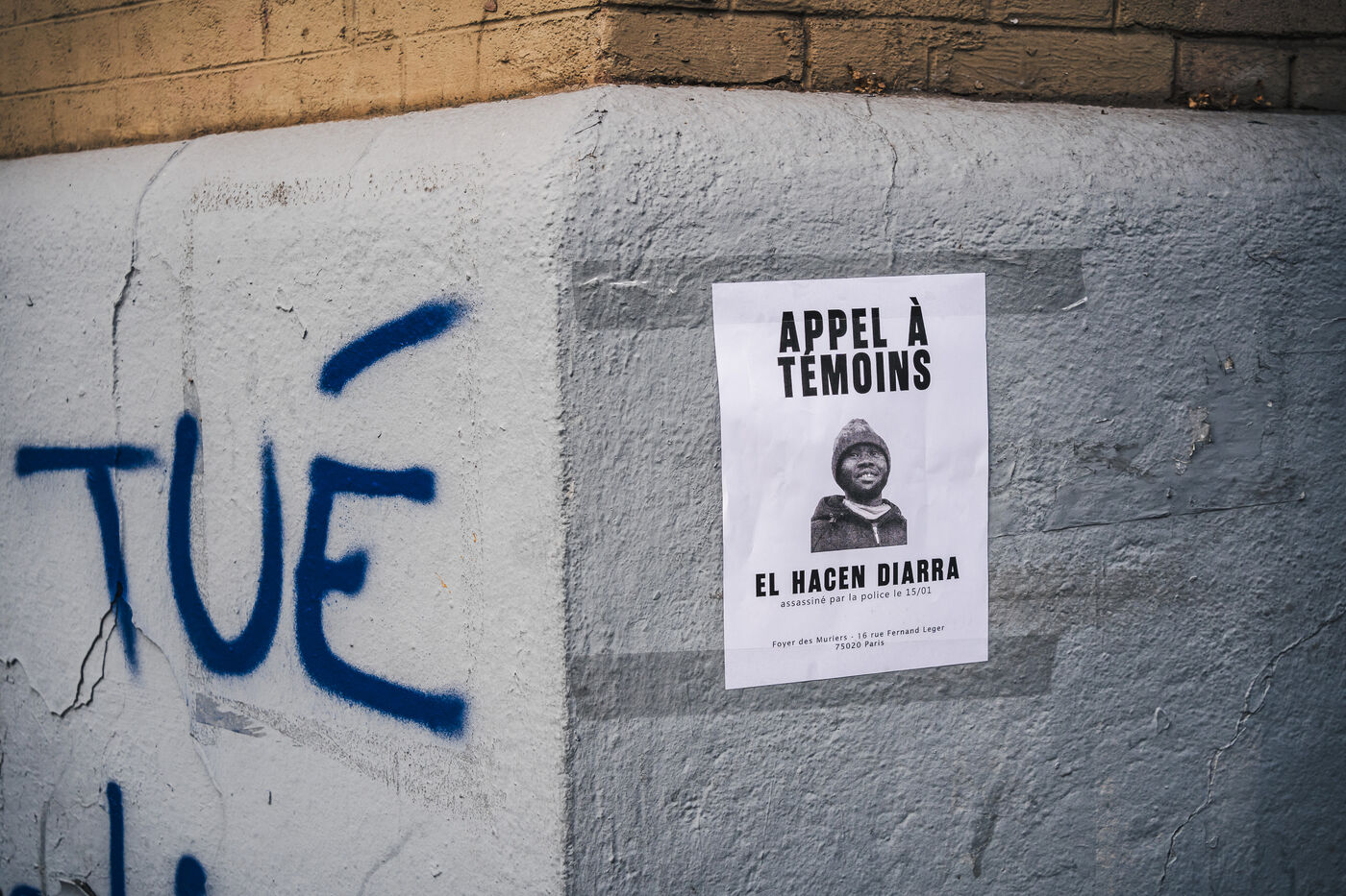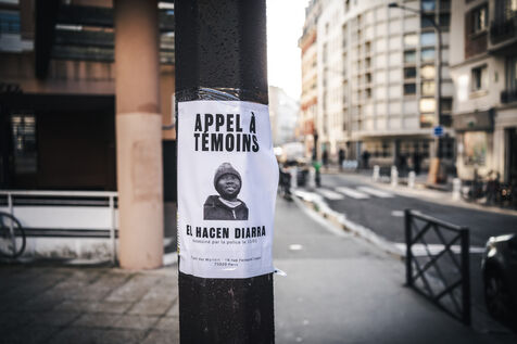 Gathering for El Hacen Diarra in front of the Les Muriers shelter on Rue Ferdinand Leger in Paris, France on January 18, 2026. El Hacen Diarra died in police custody following a cardiac arrest on the night of Wednesday 14 to Thursday 15 January around midnight at the central police station in the 20th arrondissement following an arrest involving the use of a taser by police officers for possession of narcotics, a complaint has been filed by the family for police violence.