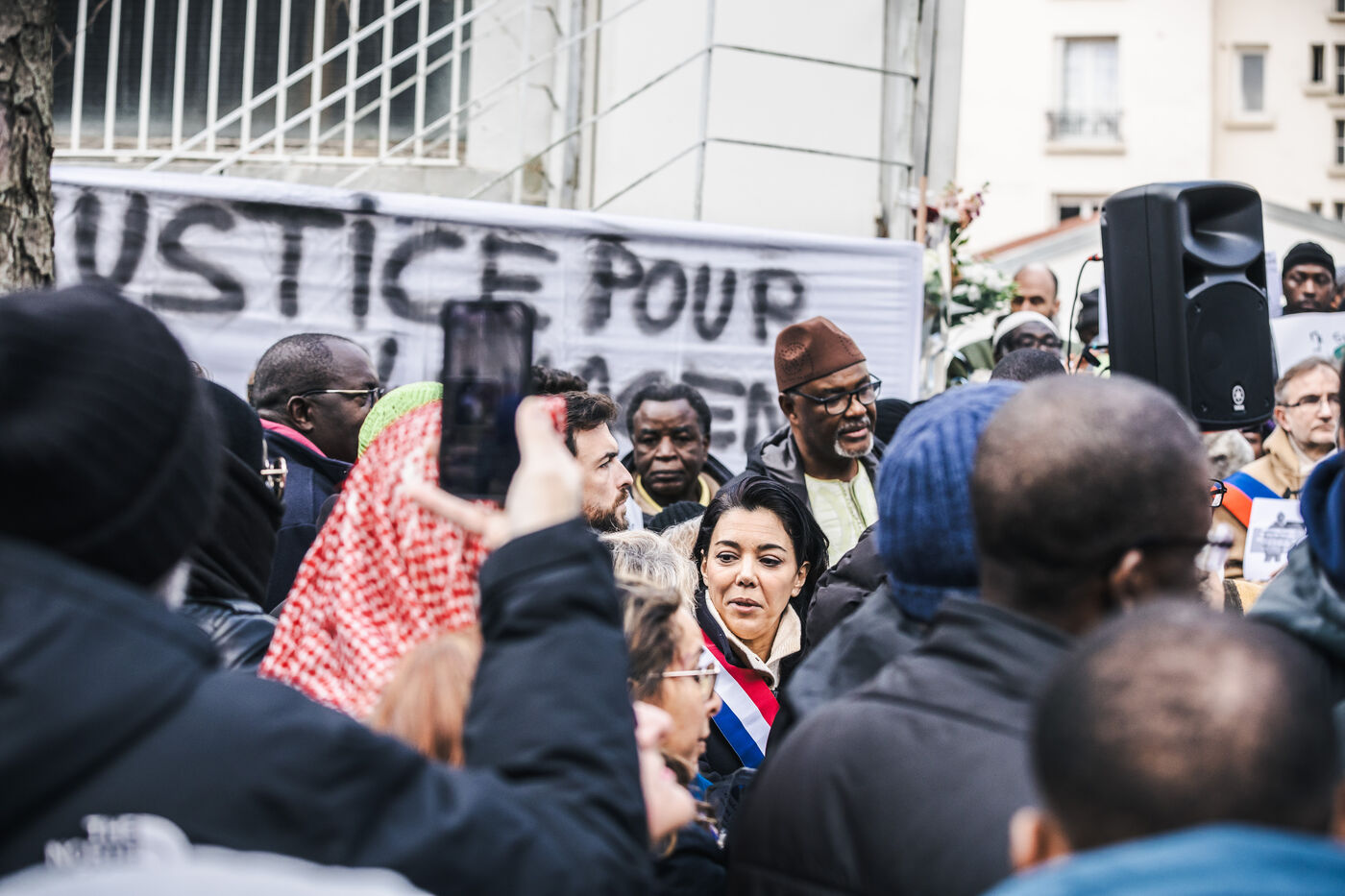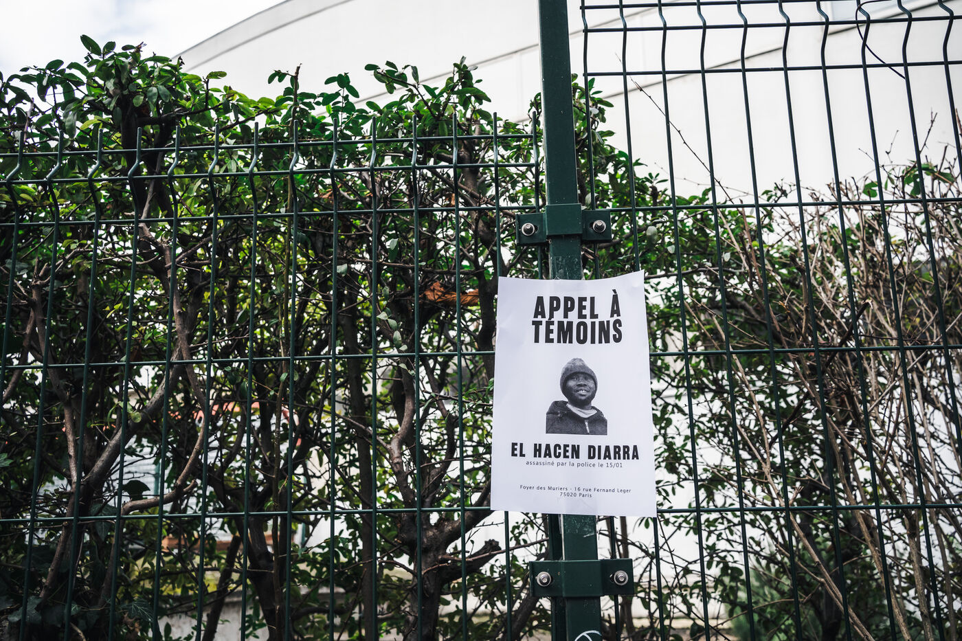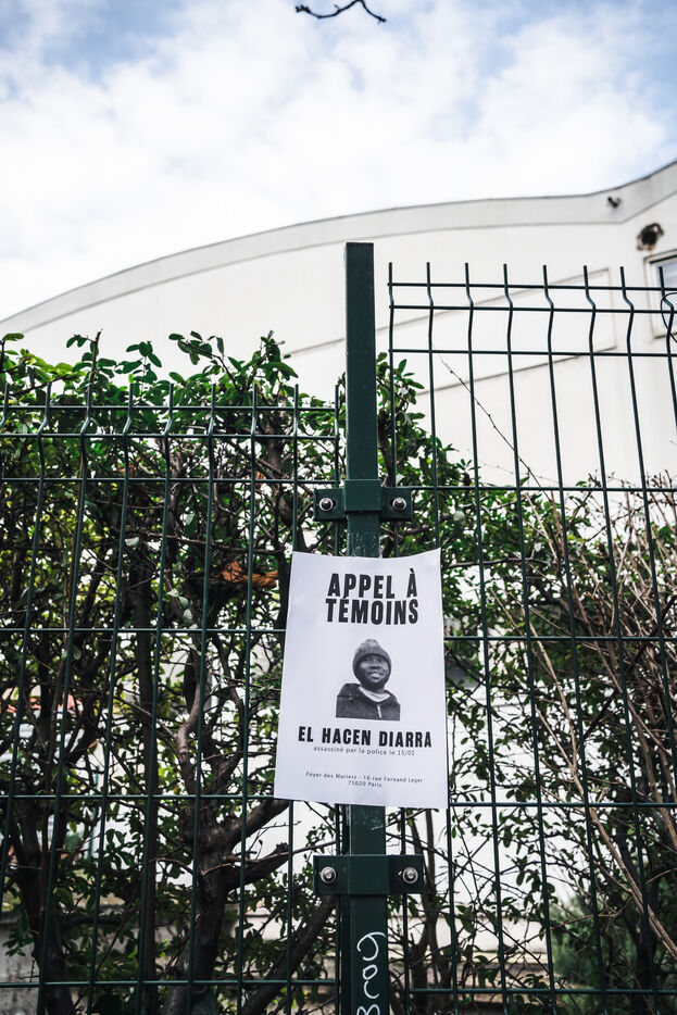 Rassemblement pour El Hacen Diarra devant le foyer Les Muriers situé rue Ferdinand Léger a Paris, France le 18 Janvier 2026. El Hacen Diarra est decede en garde a vue a la suite d'un arret cardiaque dans la nuit du mercredi 14 au jeudi 15 janvier vers minuit au commissariat central du 20e arrondissement a la suite d'une interpellation impliquant l'usage d'un taser par des policiers pour possession de stupefiants, plainte déposée par la famille pour violences policières.