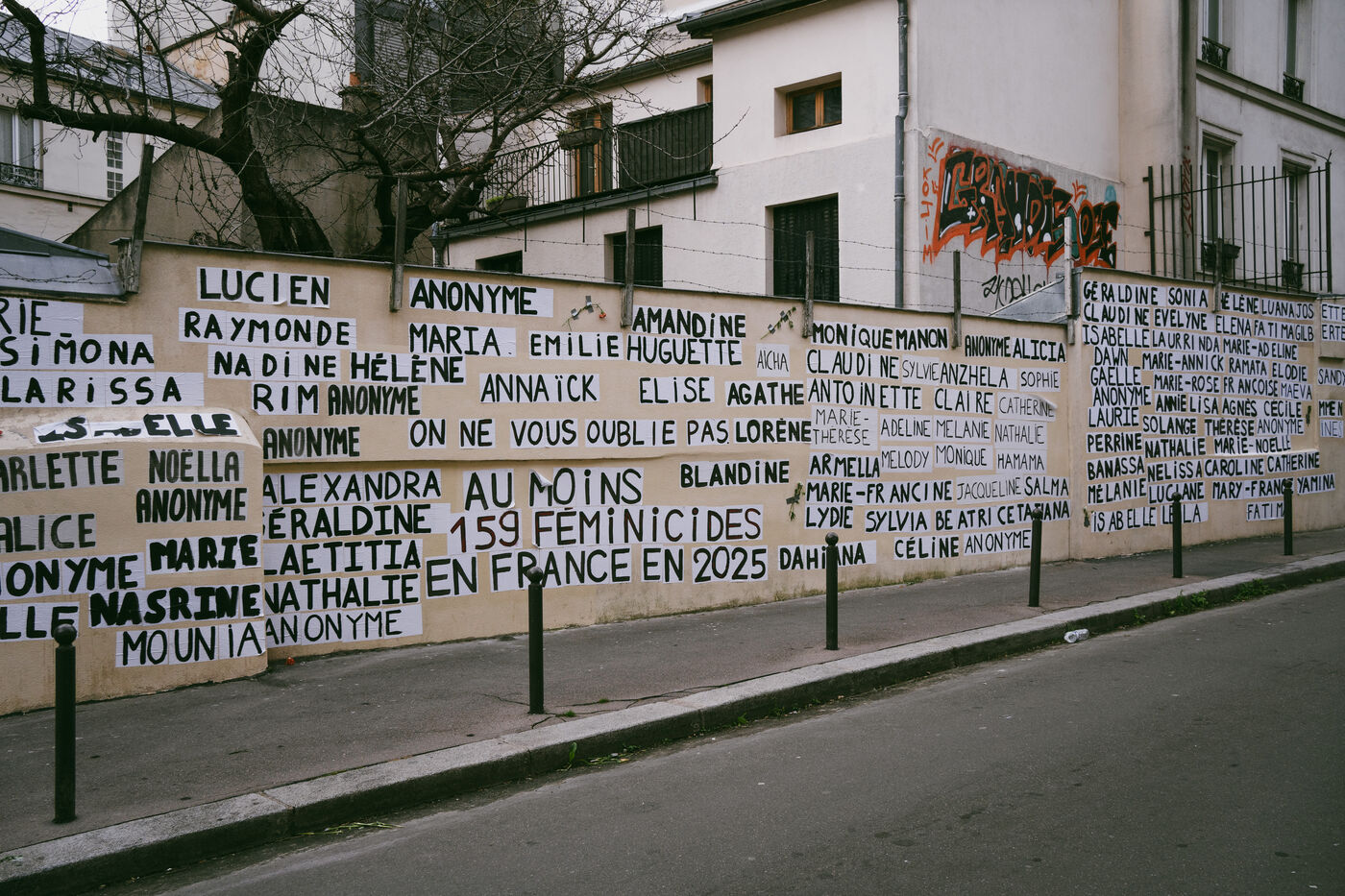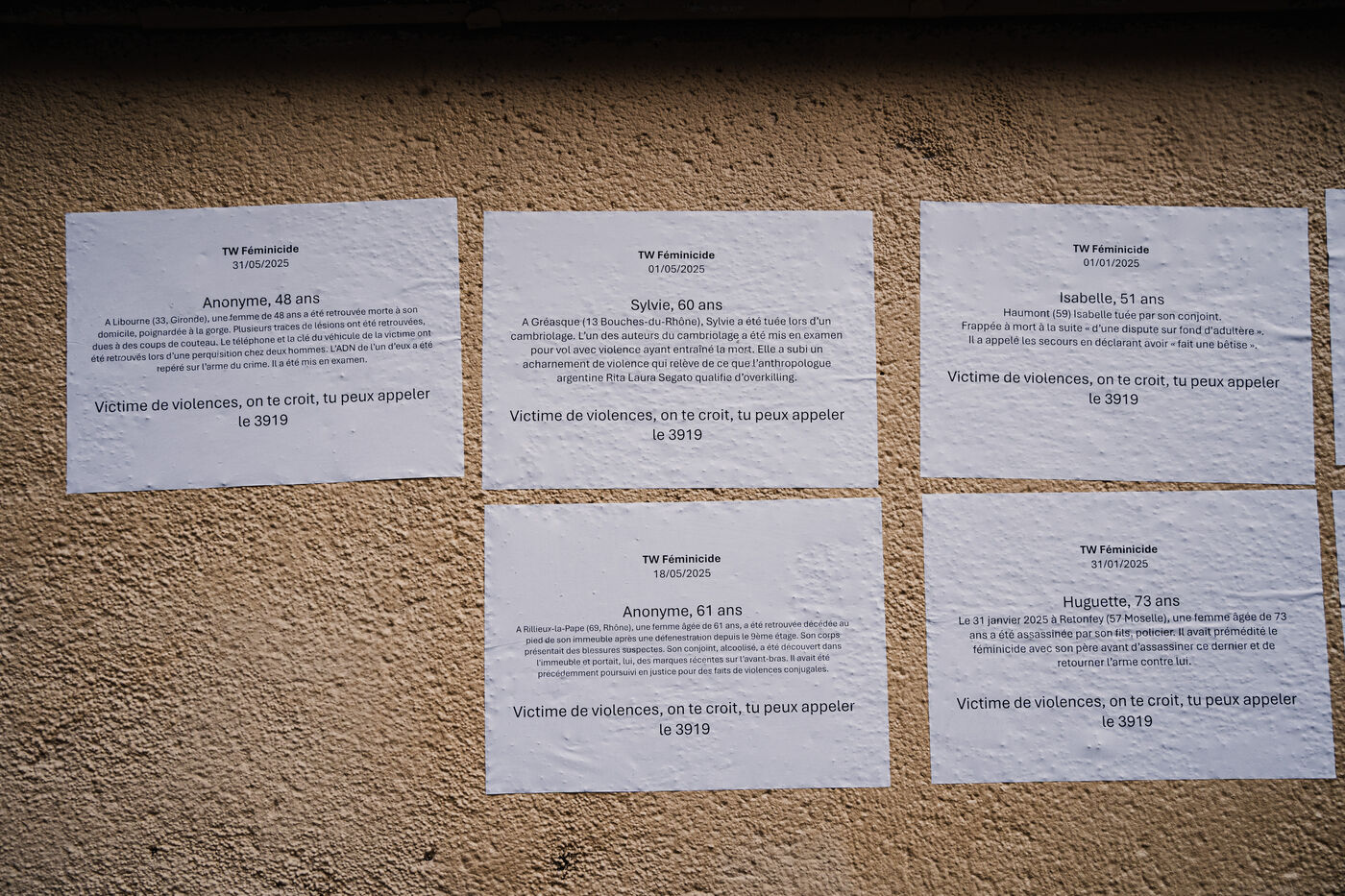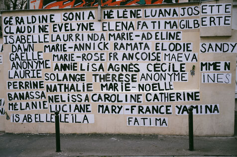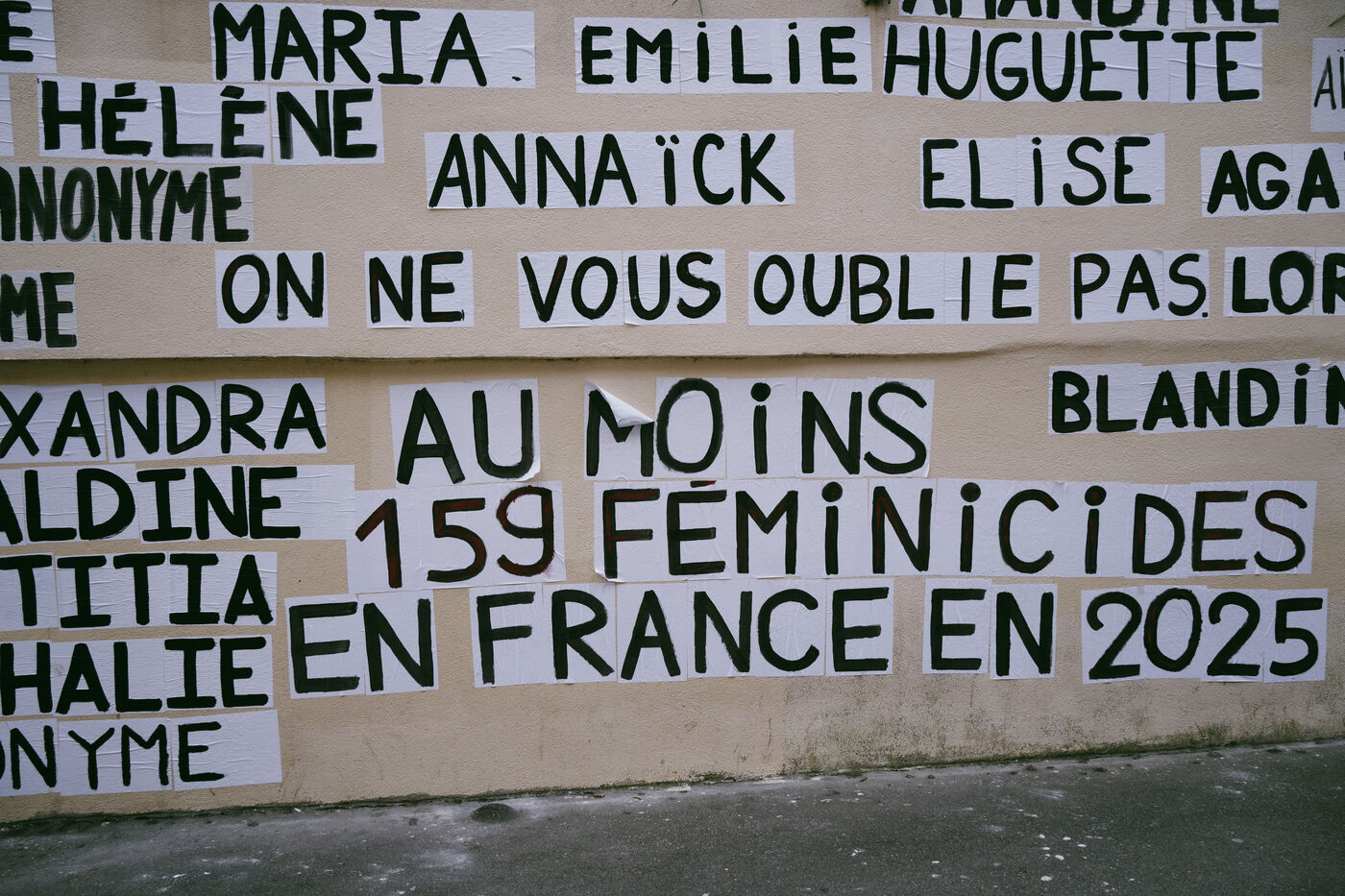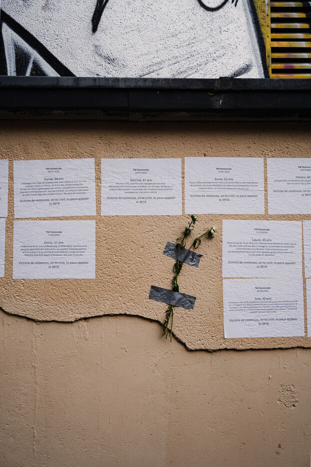 Memorial created by the feminists collage makers of the Collages Feminicides Paris collective to pay tribute to the 159 women victims of femicide on a wall on Rue de l'Equerre in the 19th arrondissement of Paris, France on January 16, 2026. The victims' first names are pasted with posters and large letters, and opposite them are sheets of paper with their age, city and department, and a few words describing the circumstances of their deaths, messages of support and sisterhood "victims of violence, we believe you , you can call 3919" (a toll-free emergency contact and helpline number for women victims of violence set up by the government).