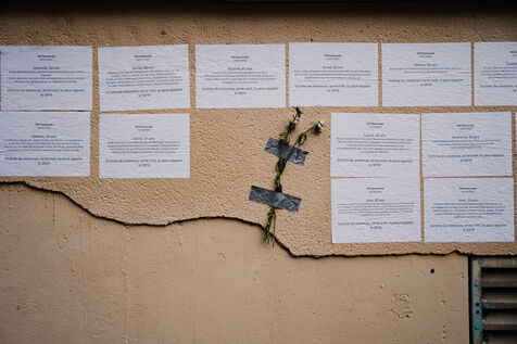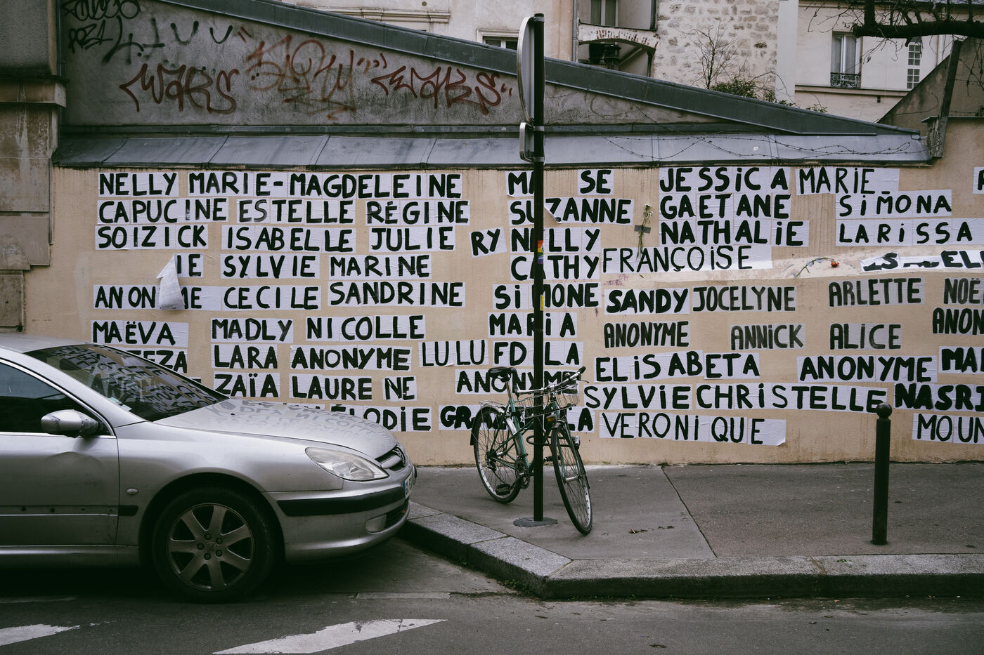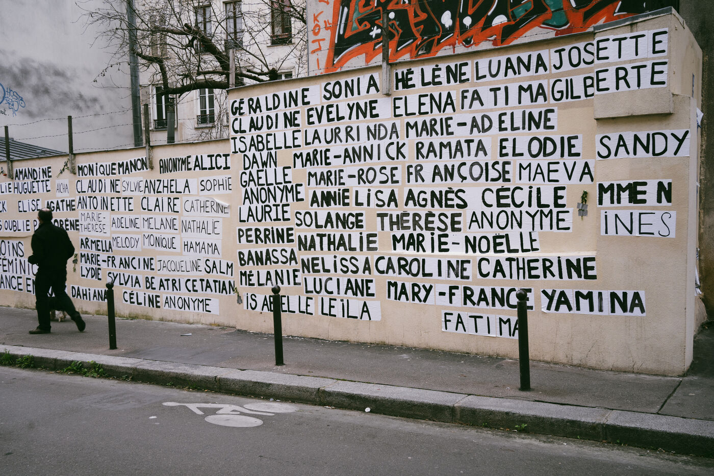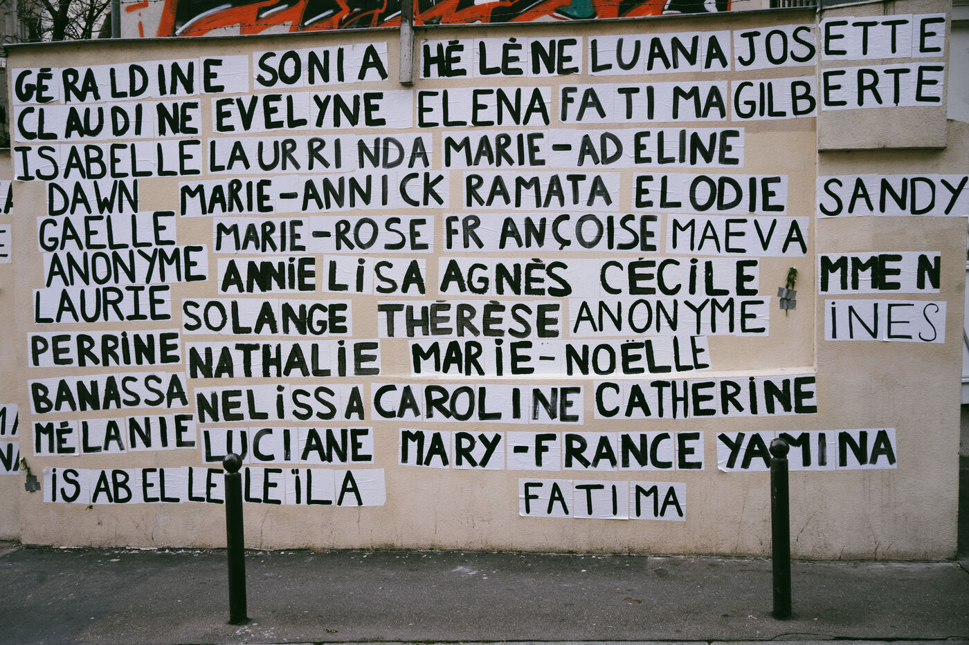 Memorial created by the feminists collage makers of the Collages Feminicides Paris collective to pay tribute to the 159 women victims of femicide on a wall on Rue de l'Equerre in the 19th arrondissement of Paris, France on January 16, 2026. The victims' first names are pasted with posters and large letters, and opposite them are sheets of paper with their age, city and department, and a few words describing the circumstances of their deaths, messages of support and sisterhood "victims of violence, we believe you , you can call 3919" (a toll-free emergency contact and helpline number for women victims of violence set up by the government).
