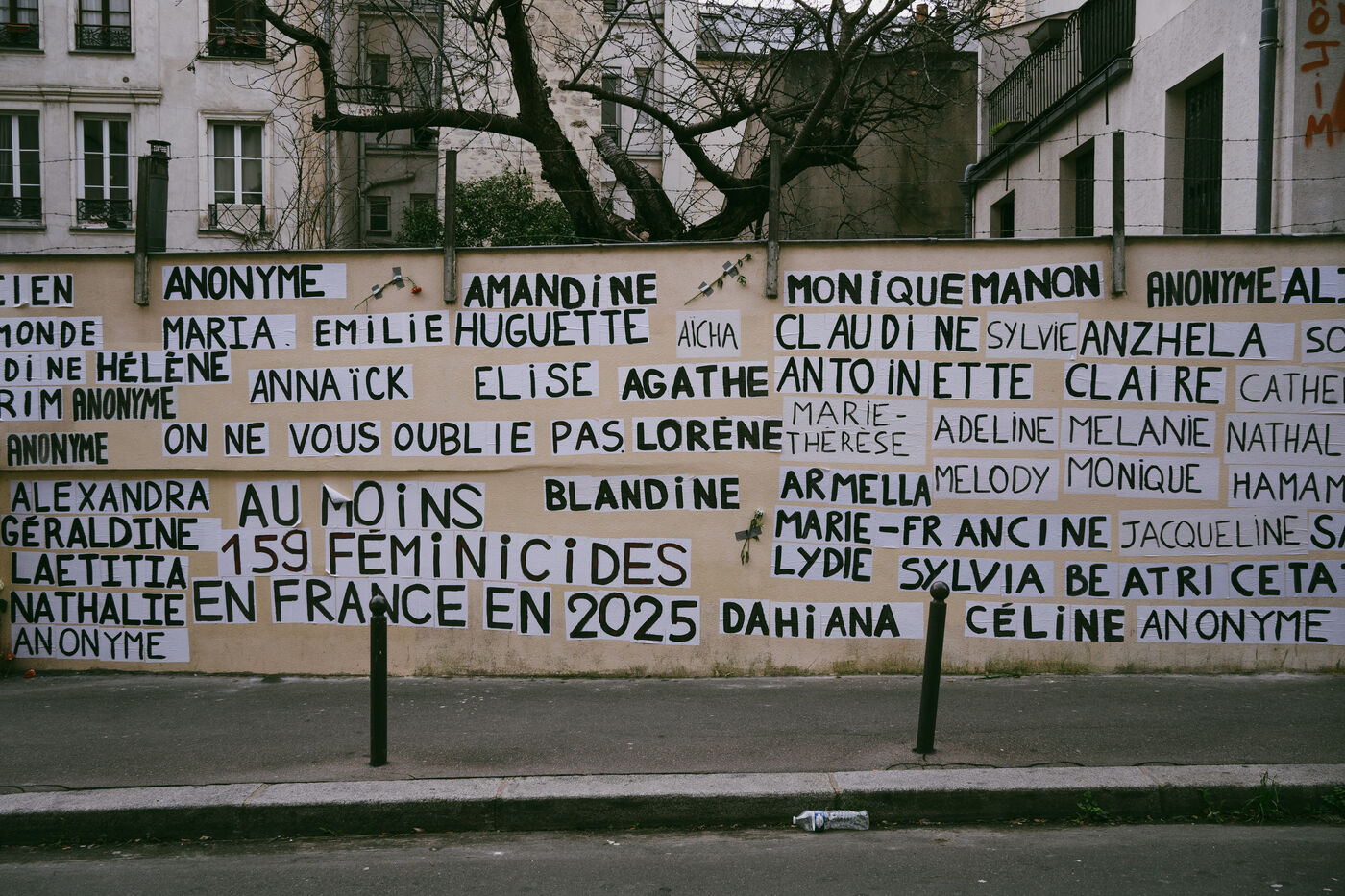 Mémorial créé par les colleurs et colleuses du collectif Collages Féminicides Paris pour rendre hommage aux 159 femmes victimes de féminicides sur un mur de la rue de l'Equerre dans le 19e arrondissement de Paris, France le 16 Janvier 2026. Les prénoms des victimes sont collés avec des affiches et des grandes lettres et en face des feuilles de papier avec leur age, ville et département et en quelques mots dans quelles conditions elles sont mortes, message de soutien et sororité Victime de violences on te croit tu peux appeler le 3919 (numéro vert de contact d'urgence et d'aide pour les femmes victimes de violence mis en place par le gouvernement).