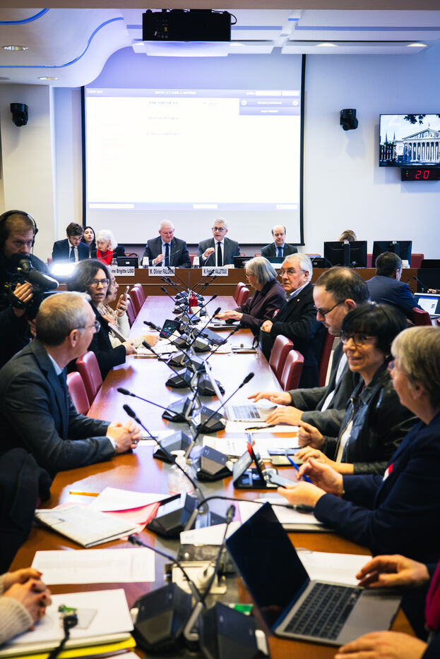 Examen en deuxième lecture de la proposition de loi rejetée par le Sénat, relative au droit à l’aide à mourir (numéro 2401) par les députés membres de la Commission des Affaires Sociales de l'Assemblée Nationale à Paris, France le 4 Février 2026. Le projet de loi parle de la fin de vie, d'euthanasie et d'un acces égal pour tous à l'accompagnement et au recours aux soins palliatifs.