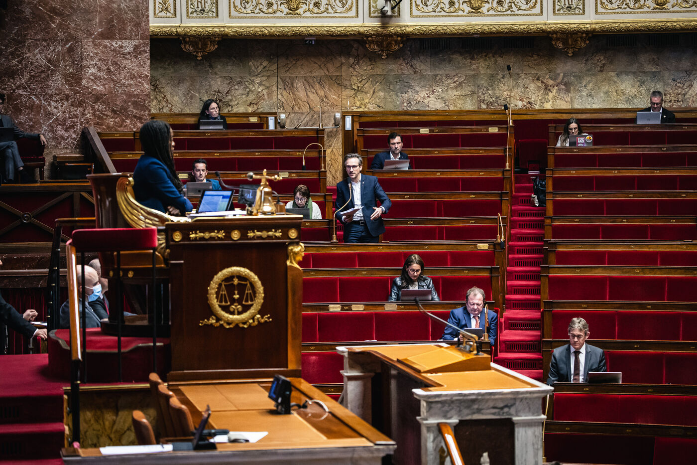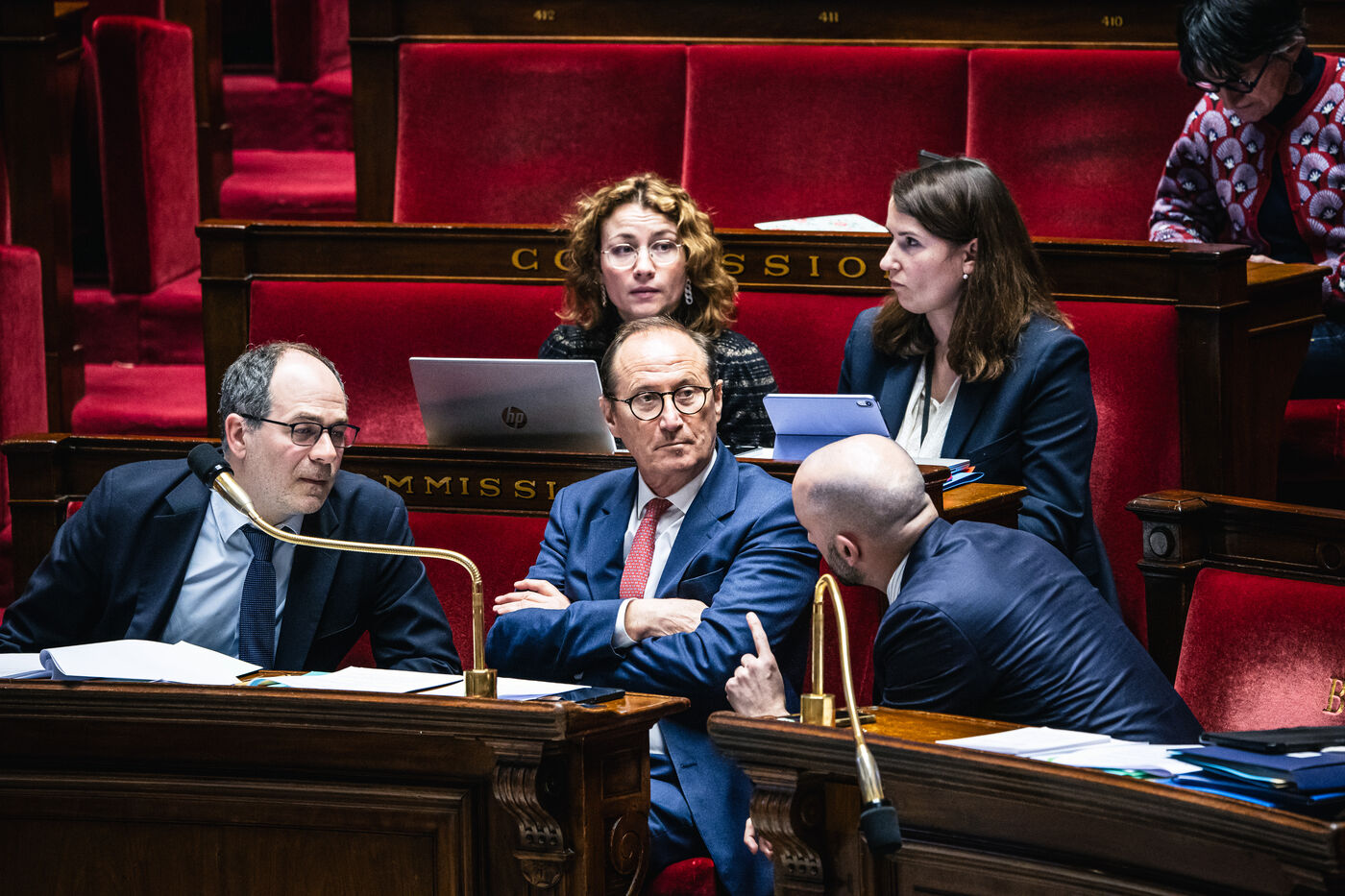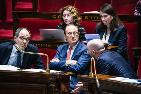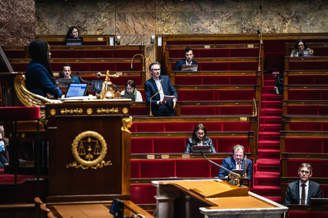 Examen et débat sur la proposition de résolution visant à rejeter le projet d'accord sur les droits de douane et le commerce du 27 juillet 2025 entre l’Union européenne et les Etats-Unis avec les députés présents dans l'hémicycle de l'assemblée nationale à Paris, France le 4 Février 2026. Accord de libre échange de réglementation des droits de douane sur les produits européens exportés en Amérique, exportation de marchandises.