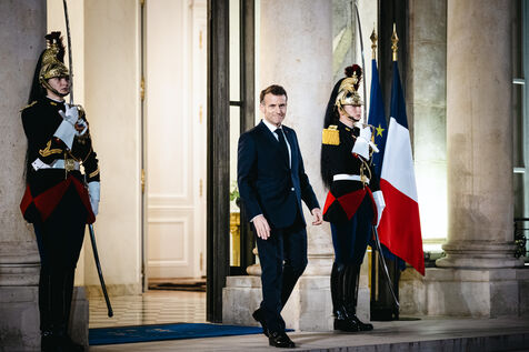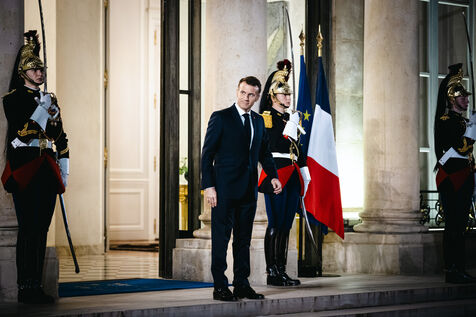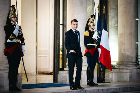 France's President Emmanuel Macron welcomes Singapore's President Tharman Shanmugaratnam in the courtyard before a working dinner at the Presidential Elysee Palace in Paris, France on March 3, 2026.