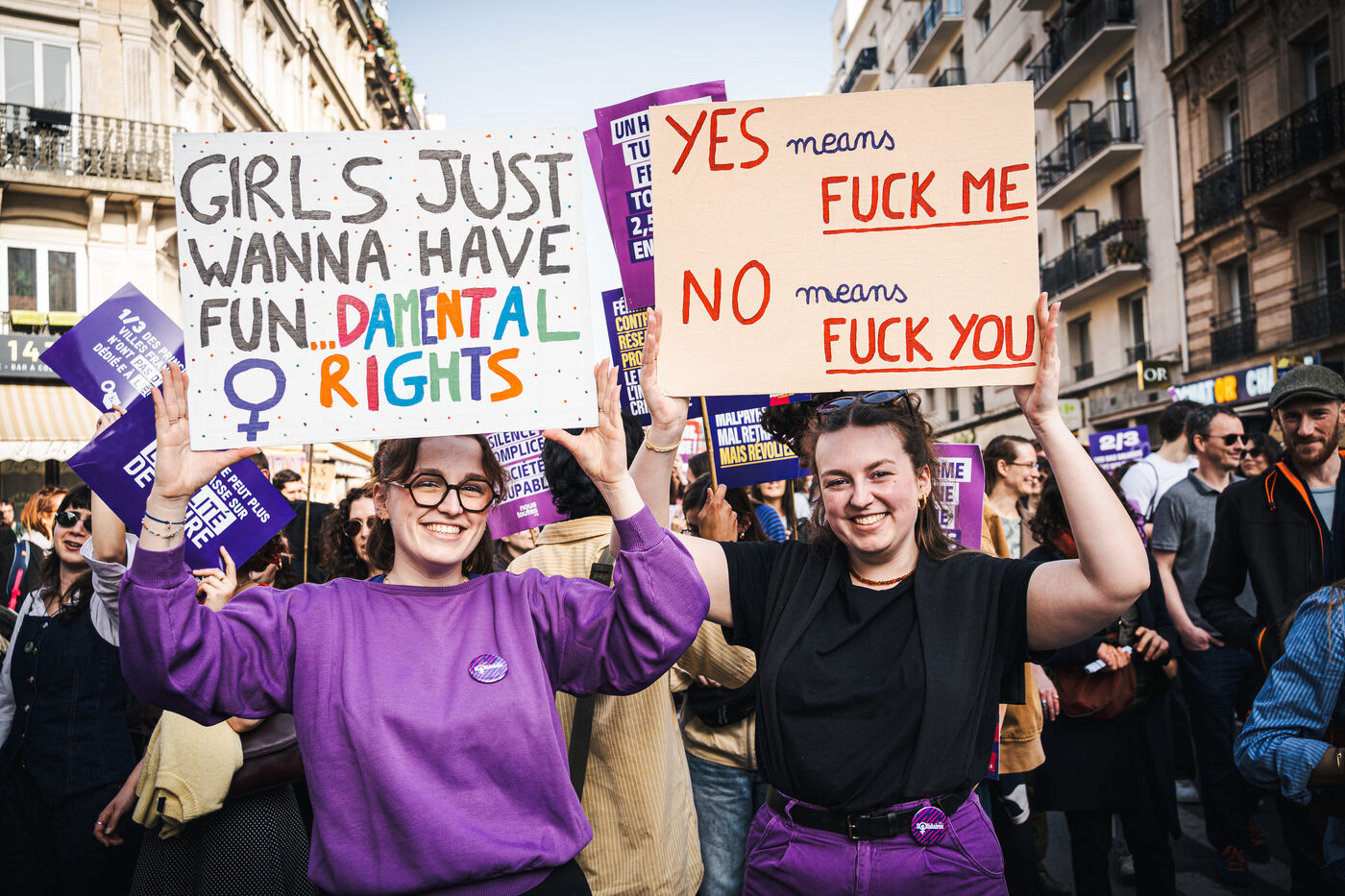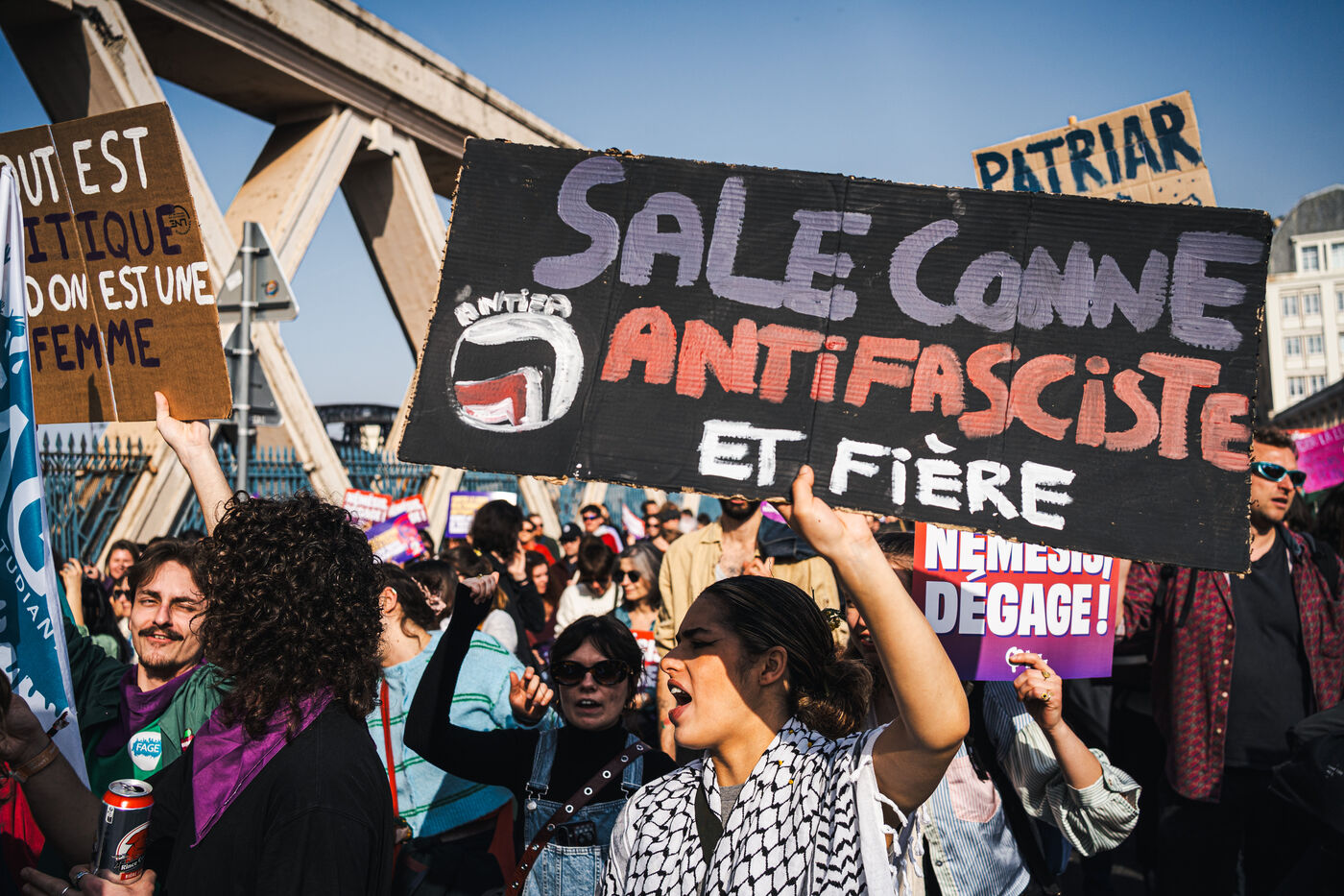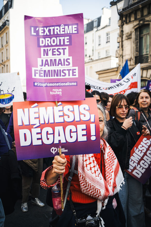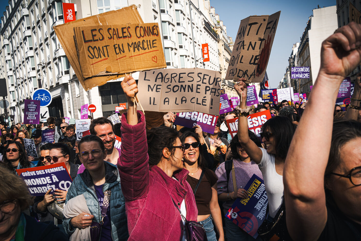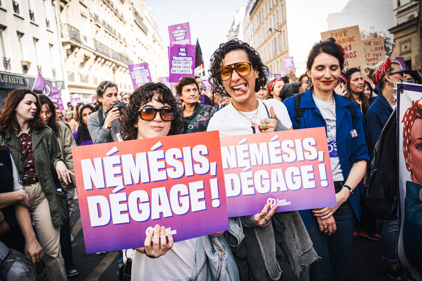 Feminist demonstration in the streets of Paris on International Women's Rights Day in Paris, France, on March 8, 2026. The main slogans chanted and messages written on placards are against patriarchy and against gender-based and sexual violence, in solidarity with women victims around the world.