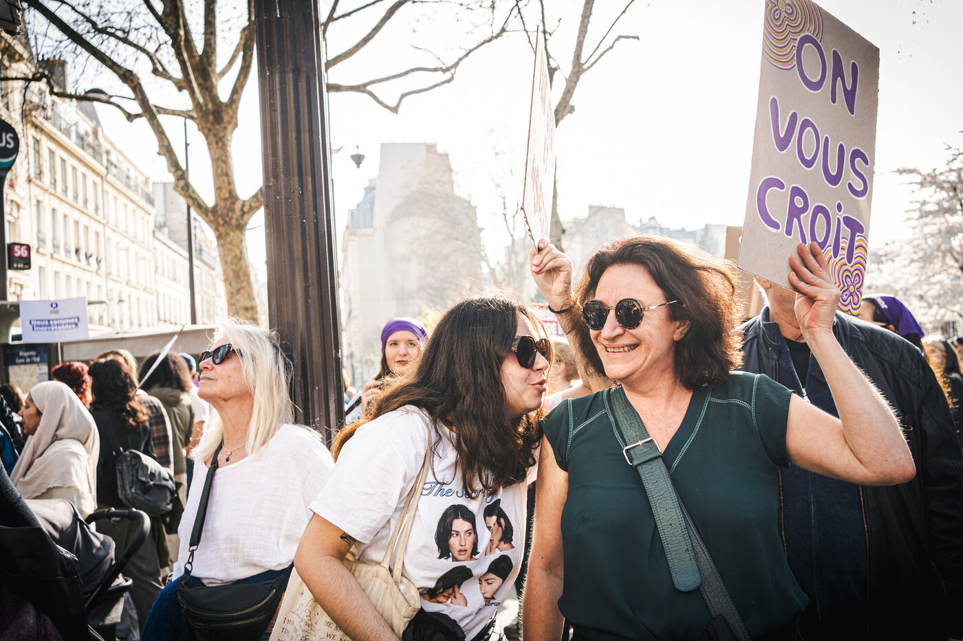 Manifestation féministe dans les rues de Paris à l'occasion de la journée internationale de lutte pour les droits des femmes à Paris, France le 8 Mars 2026. Les principaux slogans scandés et messages écrits sur les pancartes sont contre le patriarcat et contre les violences sexistes et sexuelles, solidarité avec les femmes du monde victimes.