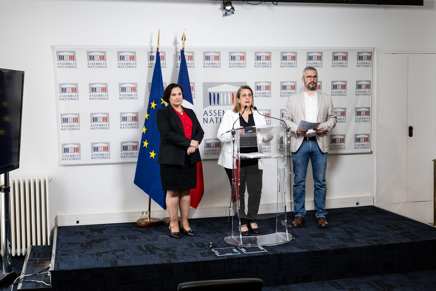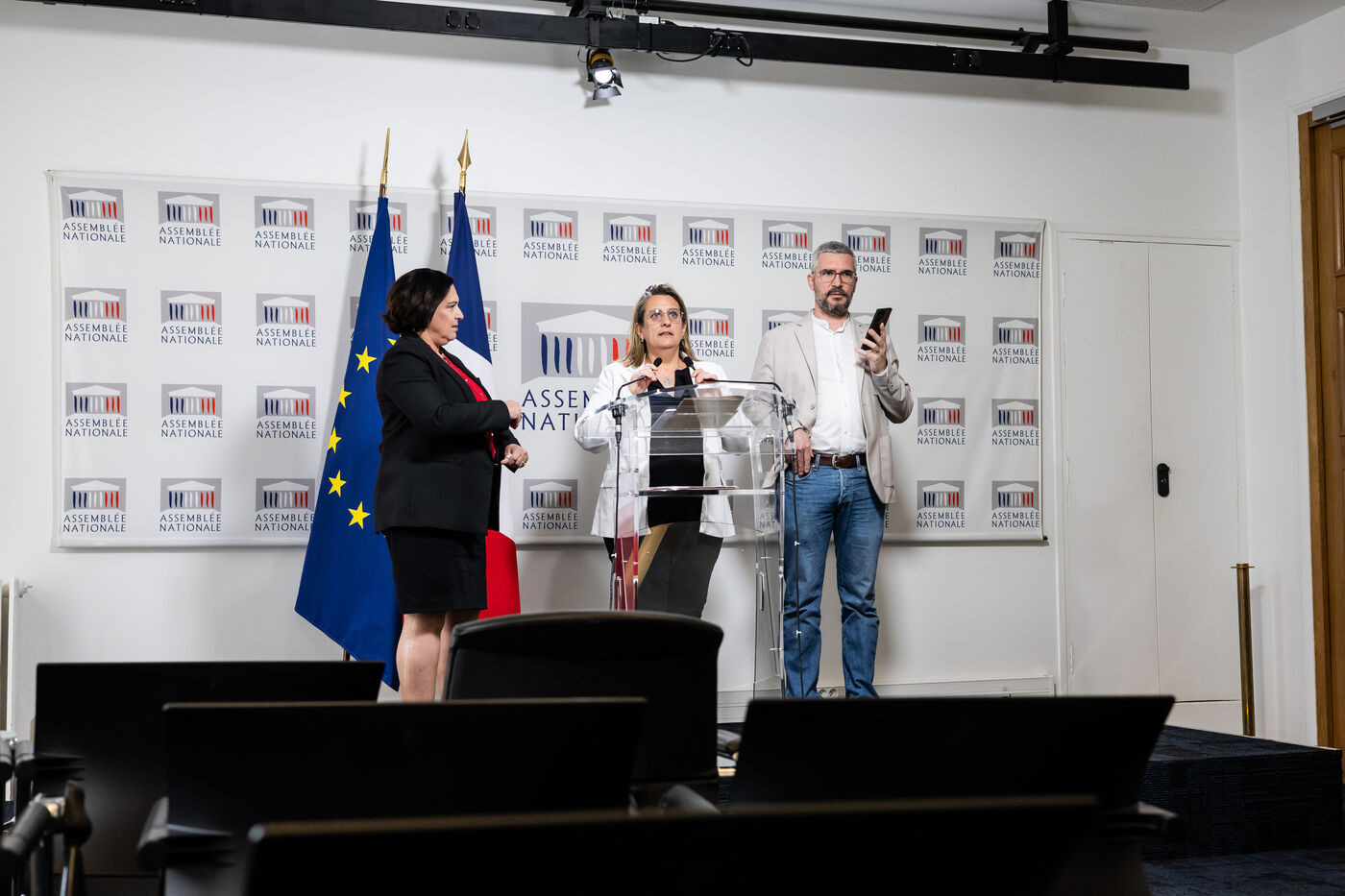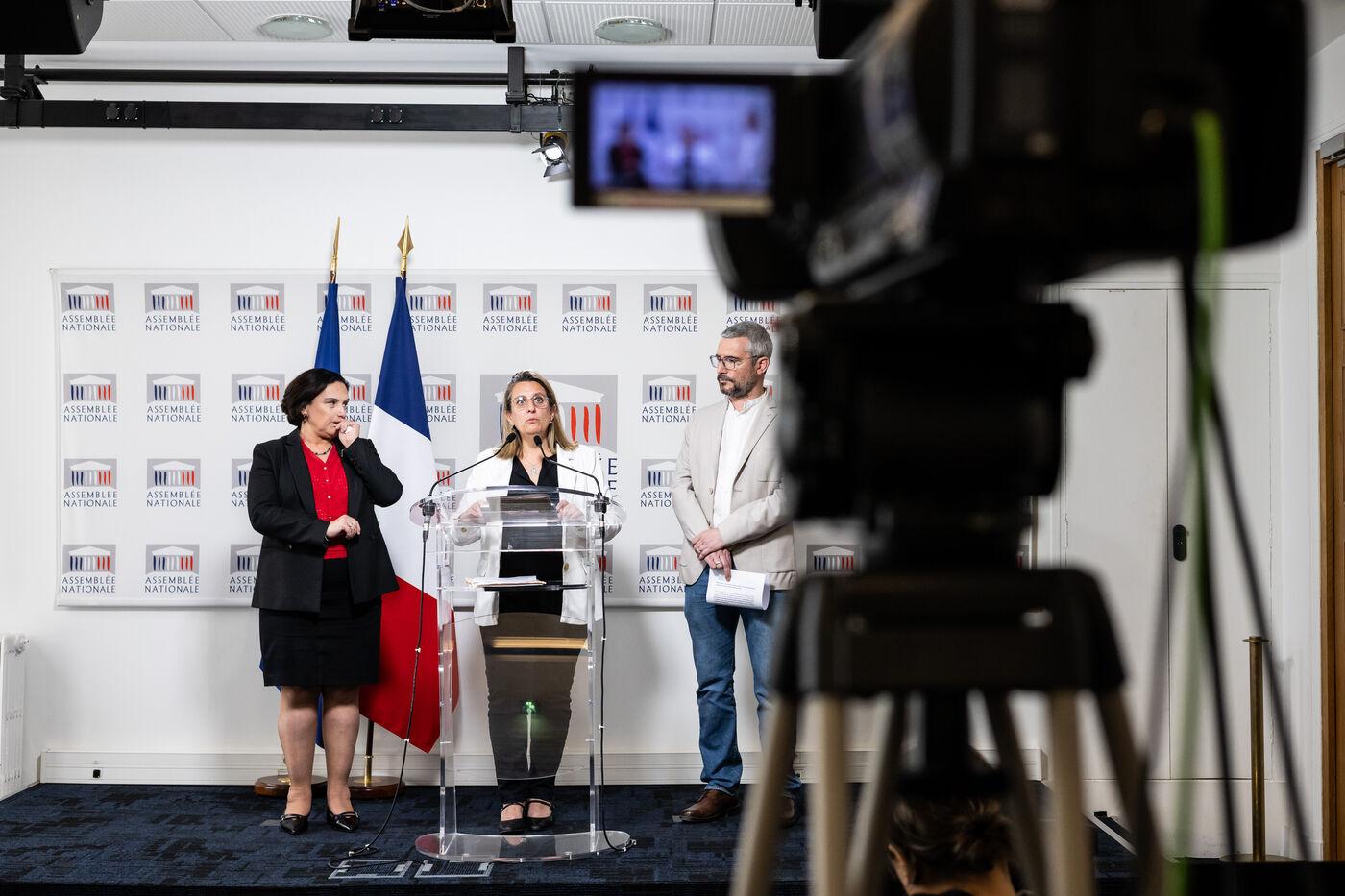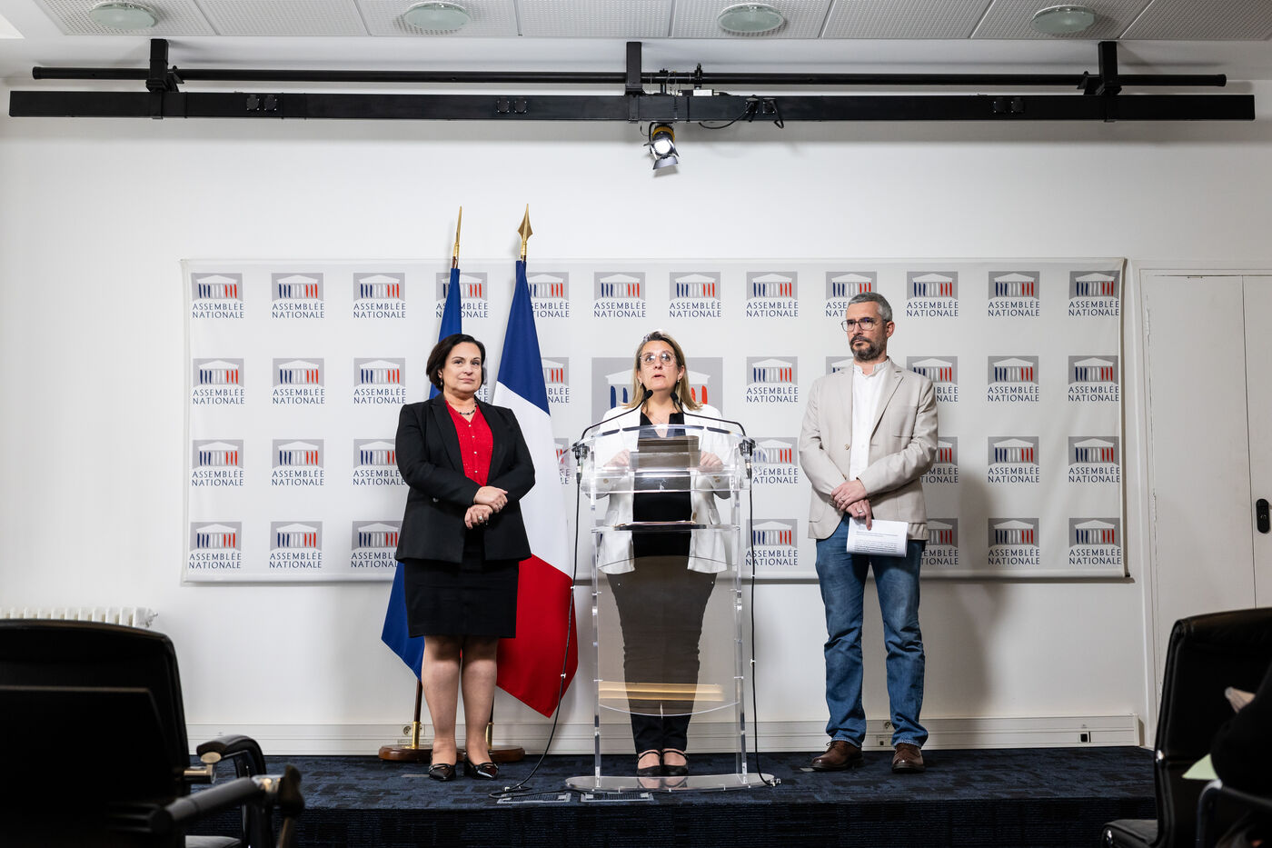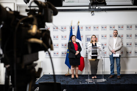 Press conference to present the report by MPs Arnaud Bonnet (Ecologiste et Social EcoS group), Perrine Goulet (Les Democrates Modem), Chair of the Delegation for Children’s Rights, and Alexandra Martin (Droite Republicaine DR, formerly Les Republicains), rapporteurs, of the report by the fact-finding mission on the non-applicability of statutes of limitations to violence committed against minors by the Delegation for Children’s Rights at the National Assembly in Paris, France on April 15, 2026.