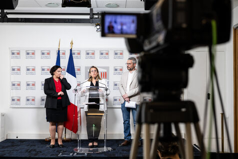 Conférence de presse de présentation par les députés Arnaud Bonnet (groupe Ecologiste et Social EcoS), Perrine Goulet (Les Democrates Modem), présidente de la Délégation aux droits des enfants, et Alexandra Martin (Droite Républicaine DR, ex Les Républicains), rapporteurs, du rapport de la mission d’information sur l'imprescriptibilité des violences commises sur des mineurs de la Délégation aux droits des enfants à l'Assemblée Nationale à Paris, France le 15 Avril 2026.