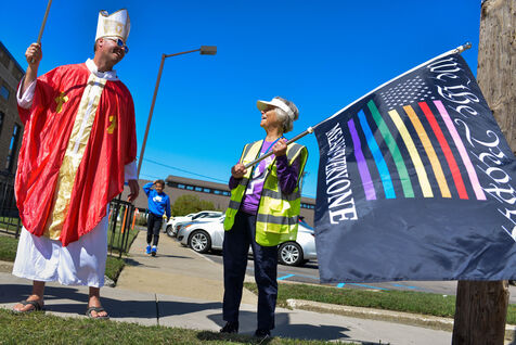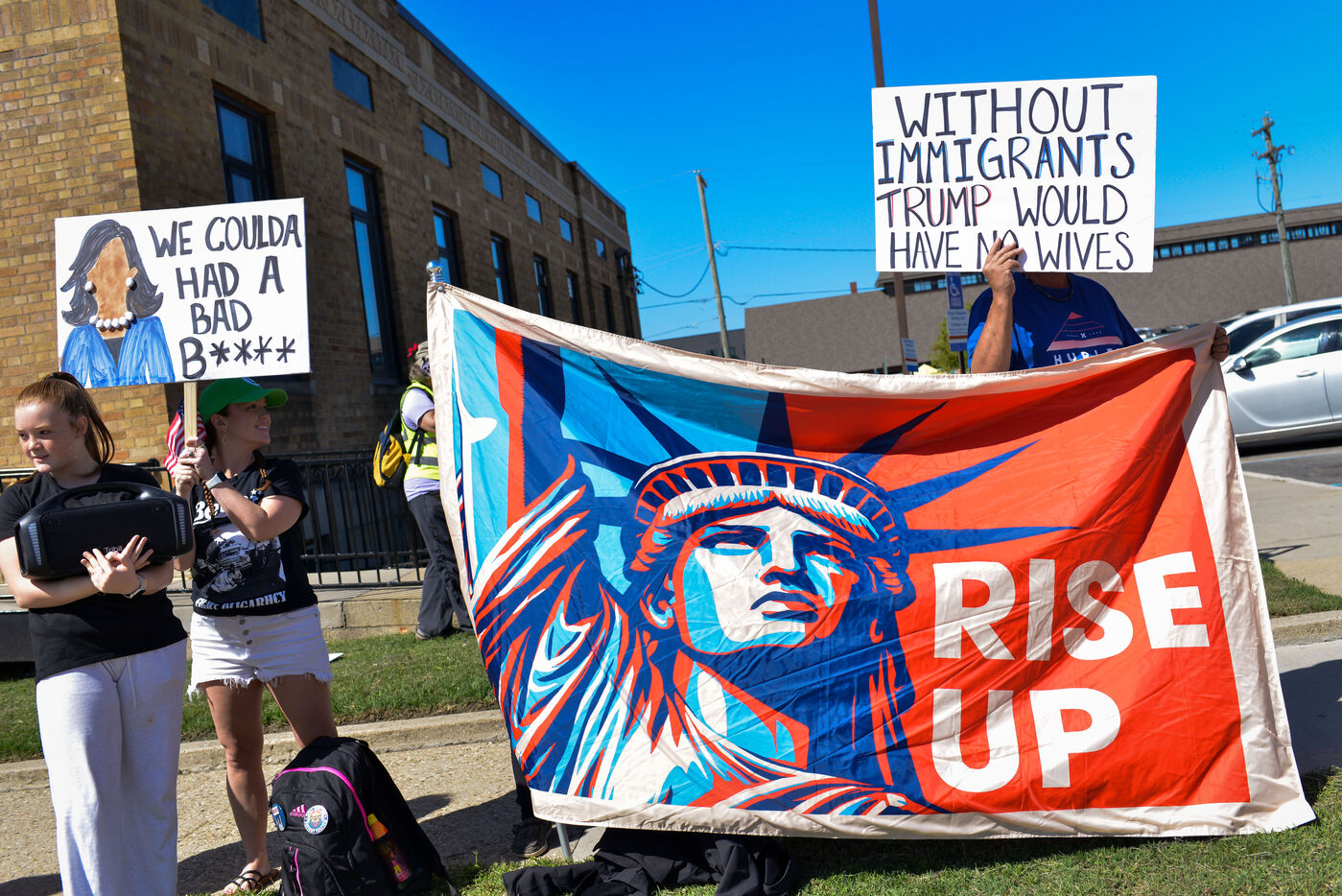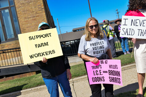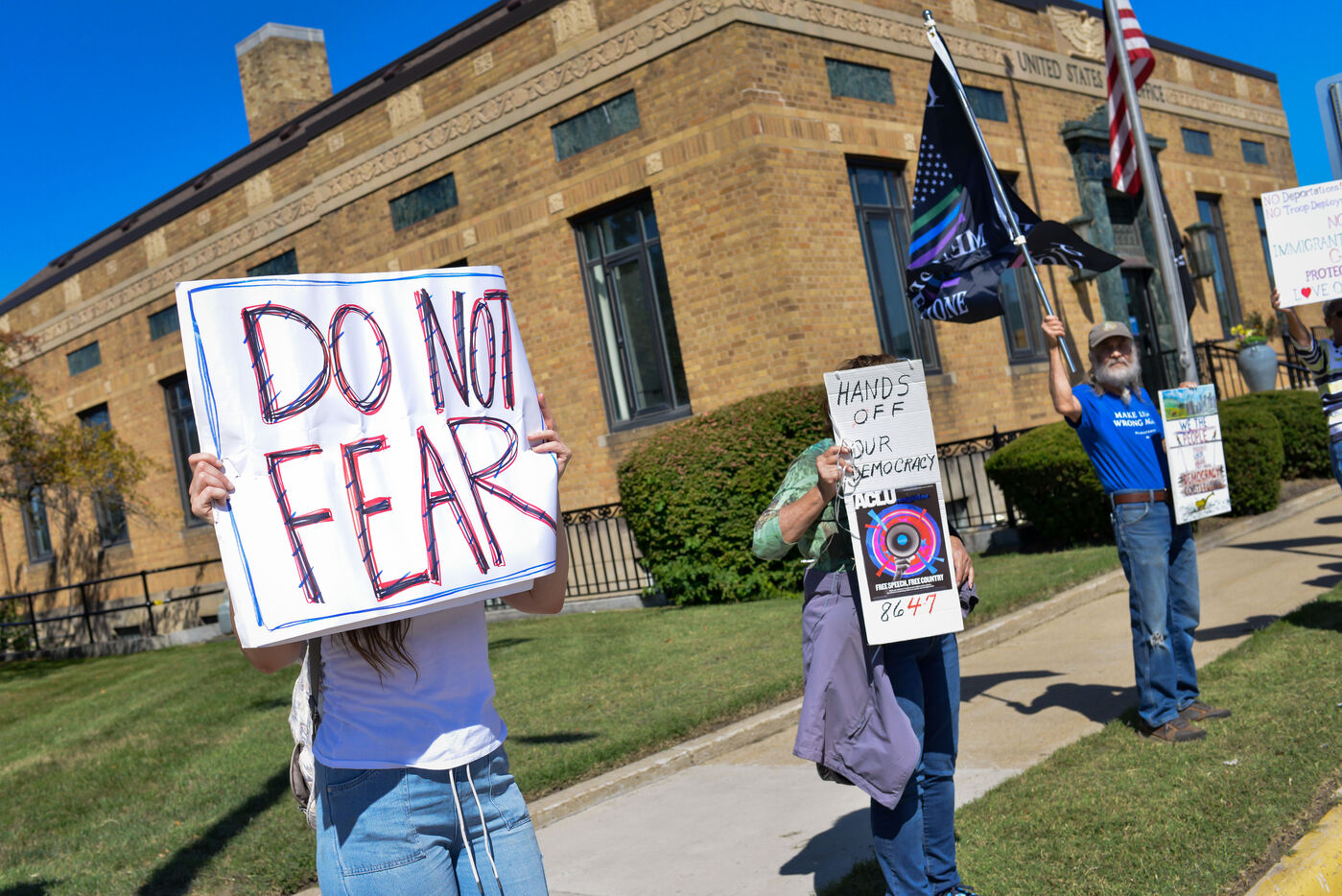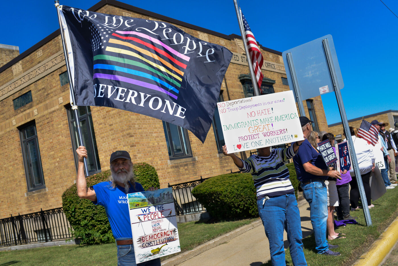 États-Unis, South Haven, Illinois, 2025-08-30. Plusieurs citoyens américains se sont rassemblés devant le bureau de poste de South Haven pour protester contre la politique de Donald Trump, notamment concernant ses choix et actions en matière d'immigration. Il s'agissait d'une manifestation pacifique et immobile dans cette ville balnéaire au bord du lac Michigan. De nombreuses voitures klaxonnaient à leur passage pour montrer leur soutien aux manifestants.