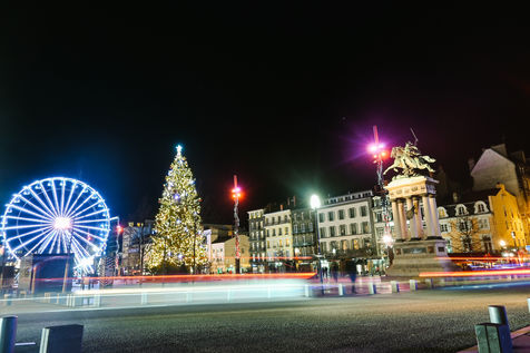 Vues du centre-ville de Clermont-Ferrand, de nuit. Les décorations des fêtes de fin d'année sont toujours en place, et la façade de l'Opéra-Théâtre est éclairée en bleu, afin de contribuer au lancement de la présidence de la France au Conseil de l'Union européenne.