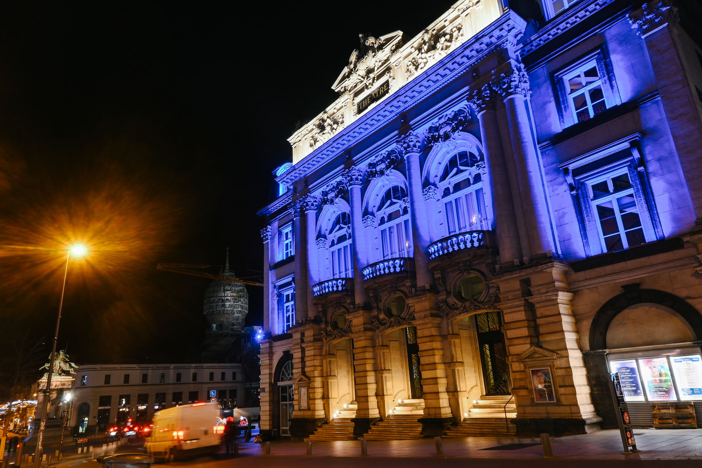 Views of the city center of Clermont-Ferrand, by night. The holiday decorations are still up, and the facade of the Opera-Theater is lit up in blue, to help launch France's presidency of the Council of the European Union.