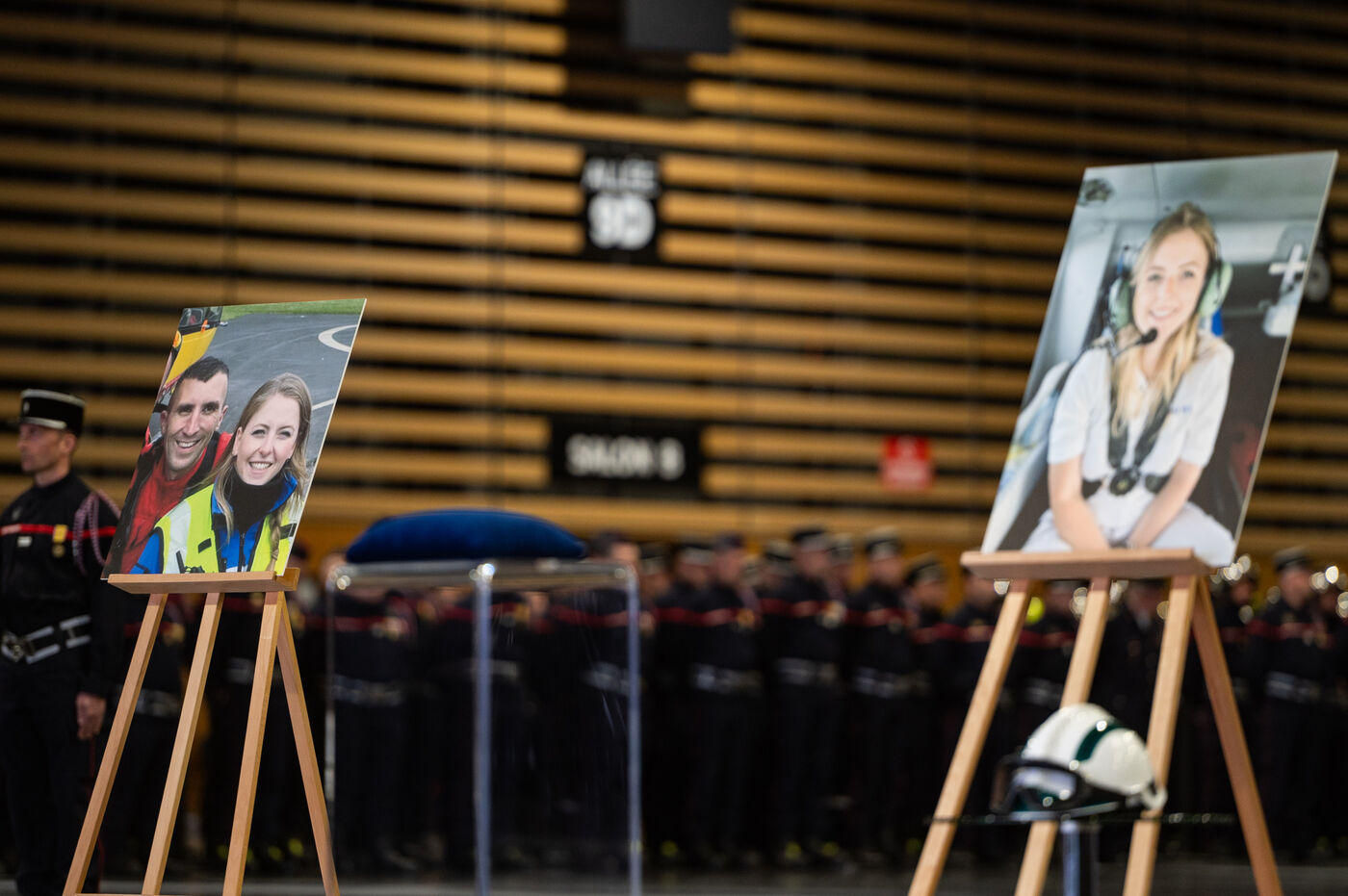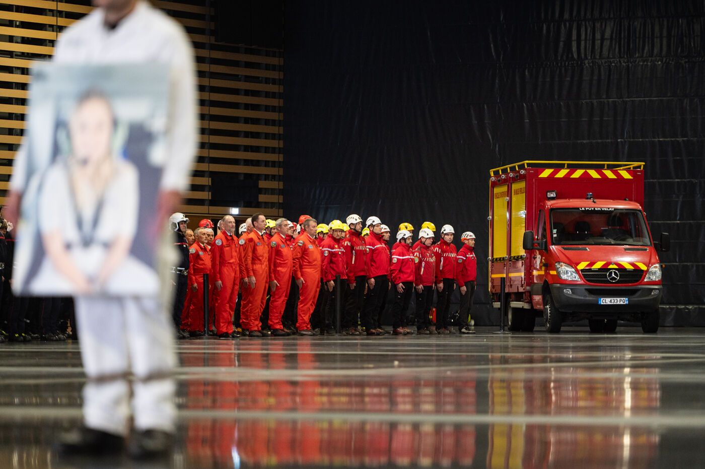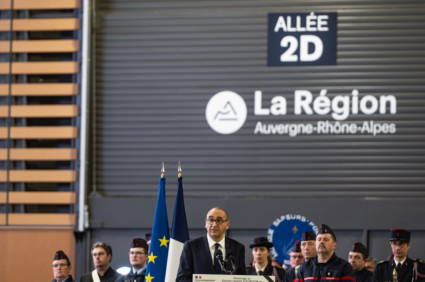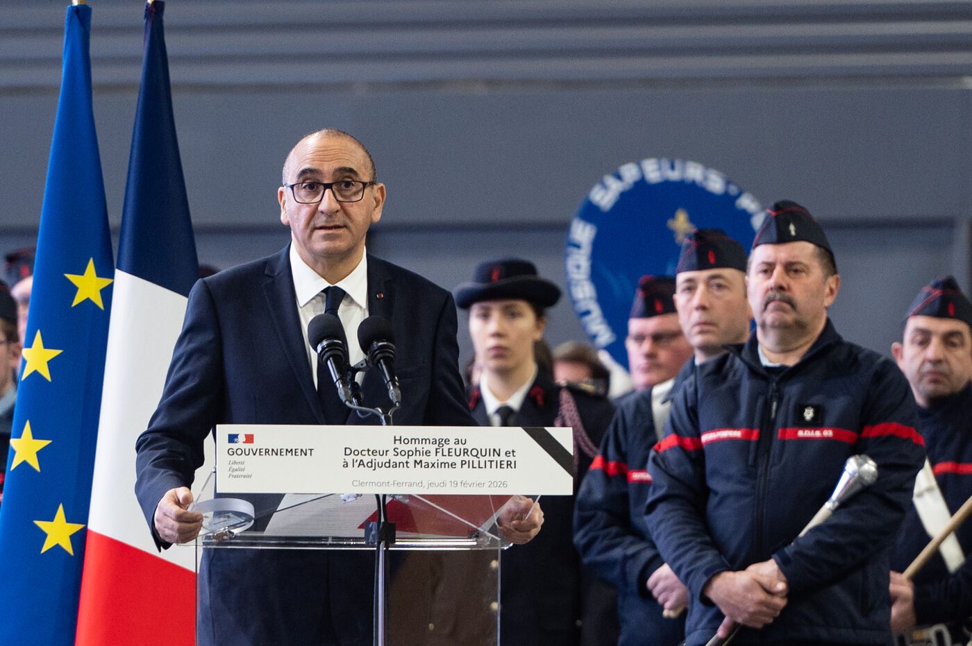 France, Cournon-d'Auvergne, February 19, 2026. Interior Minister Laurent Nunez and Health Minister Stephanie Rist pay national tribute to Dr. Sophie Fleurquin and Adjutant Maxime Pilliteri, a professional firefighter, in Cournon-d'Auvergne, near Clermont-Ferrand, on February 19, 2026. These two first responders died in the Sancy massif, in Puy-de-Dome, on February 11, 2026, during a helicopter exercise. Photograph by Adrien Fillon / Hans Lucas.