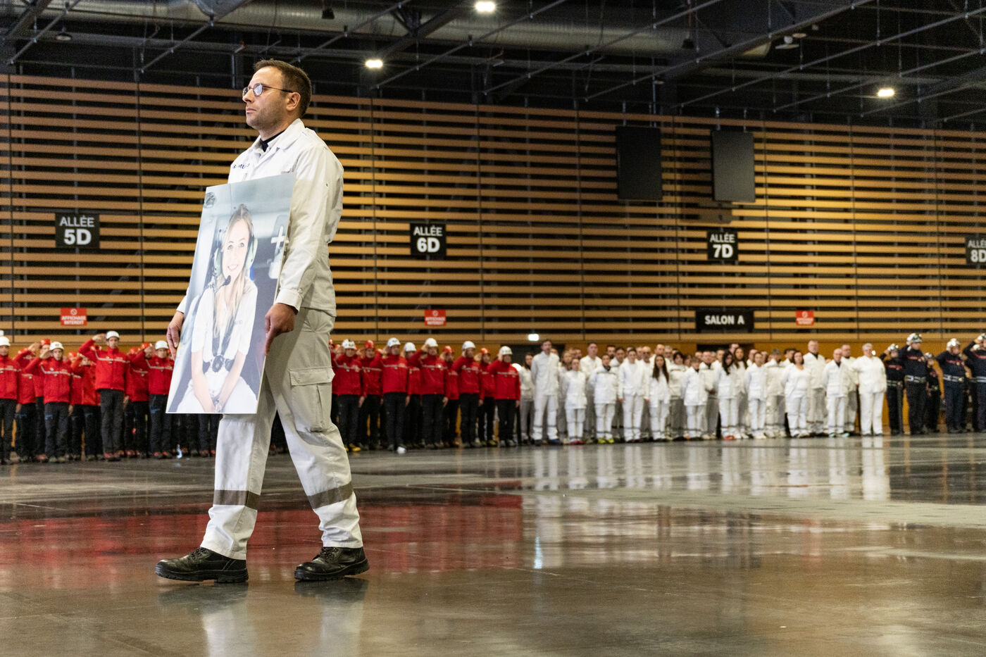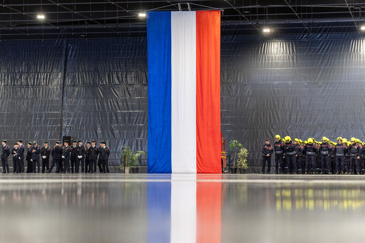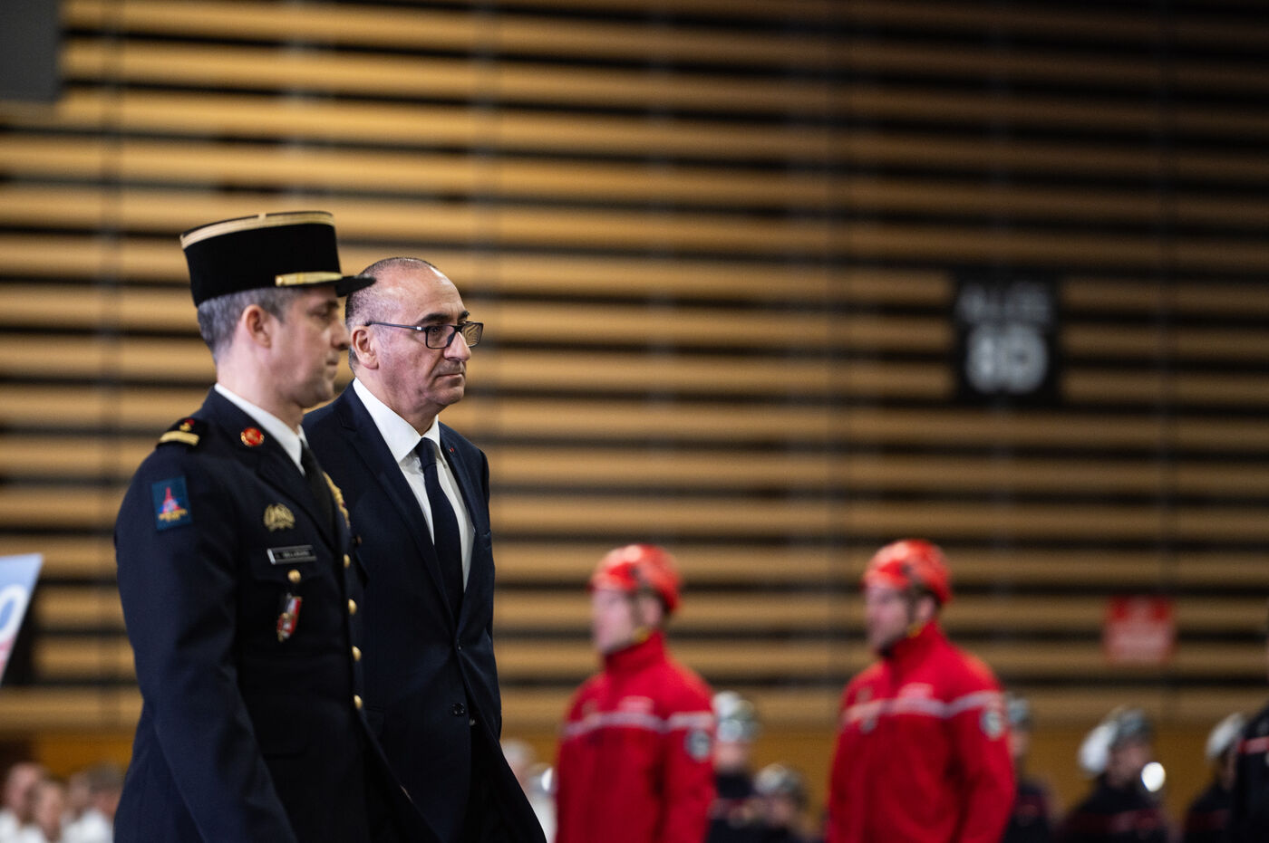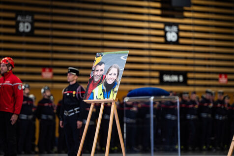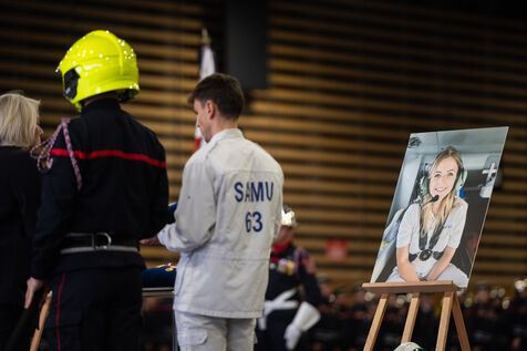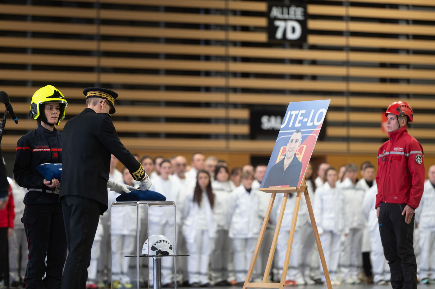 France, Cournon-d'Auvergne, February 19, 2026. Interior Minister Laurent Nunez and Health Minister Stephanie Rist pay national tribute to Dr. Sophie Fleurquin and Adjutant Maxime Pilliteri, a professional firefighter, in Cournon-d'Auvergne, near Clermont-Ferrand, on February 19, 2026. These two first responders died in the Sancy massif, in Puy-de-Dome, on February 11, 2026, during a helicopter exercise. Photograph by Adrien Fillon / Hans Lucas.