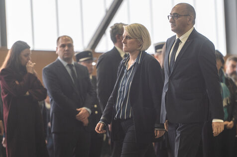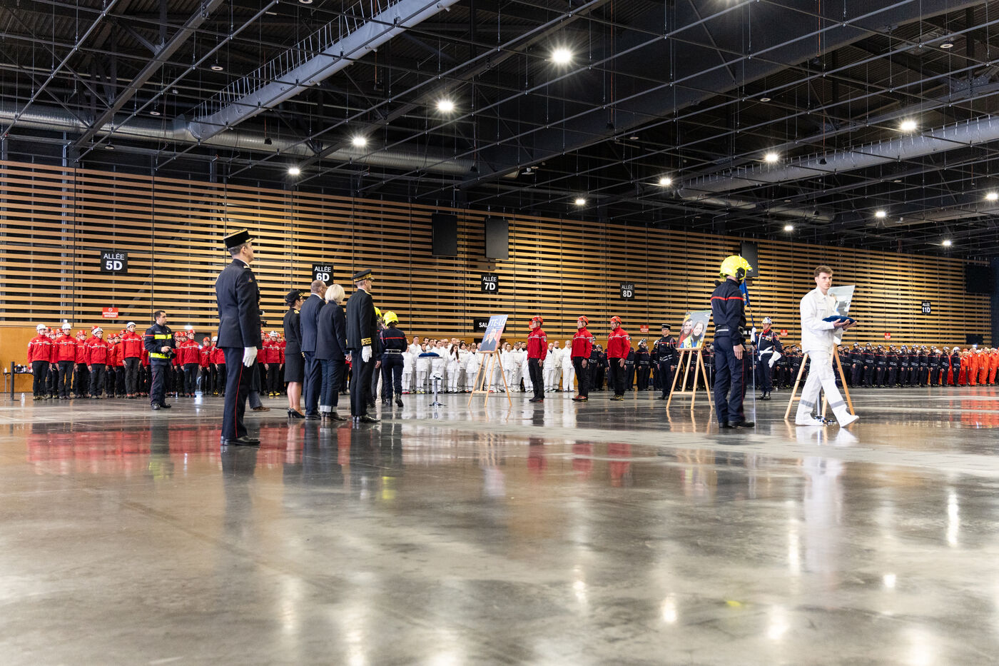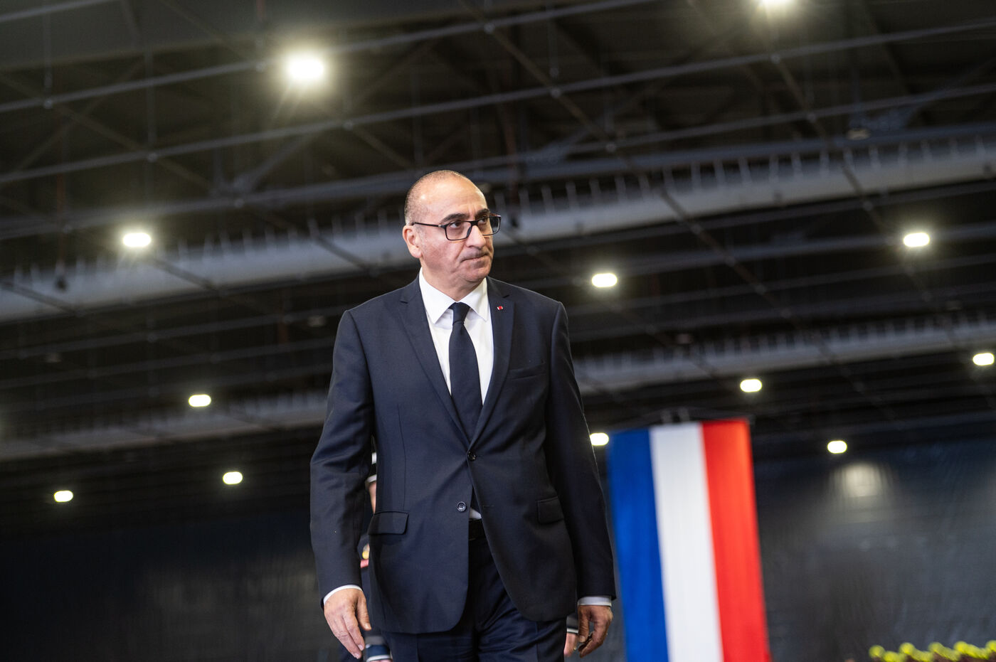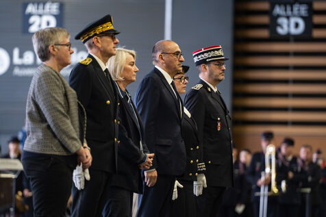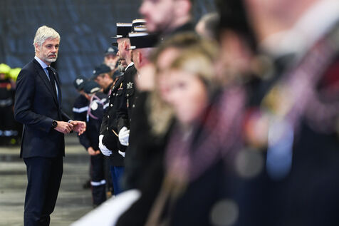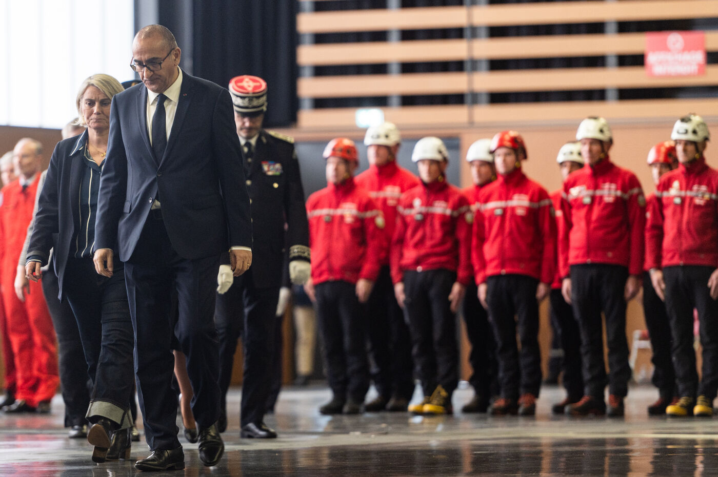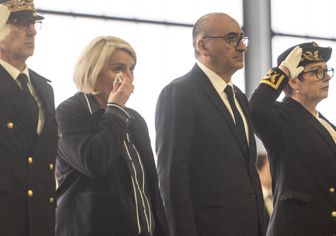 France, Cournon-d'Auvergne, February 19, 2026. Interior Minister Laurent Nunez and Health Minister Stephanie Rist pay national tribute to Dr. Sophie Fleurquin and Adjutant Maxime Pilliteri, a professional firefighter, in Cournon-d'Auvergne, near Clermont-Ferrand, on February 19, 2026. These two first responders died in the Sancy massif, in Puy-de-Dome, on February 11, 2026, during a helicopter exercise. Photograph by Adrien Fillon / Hans Lucas.