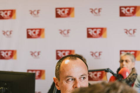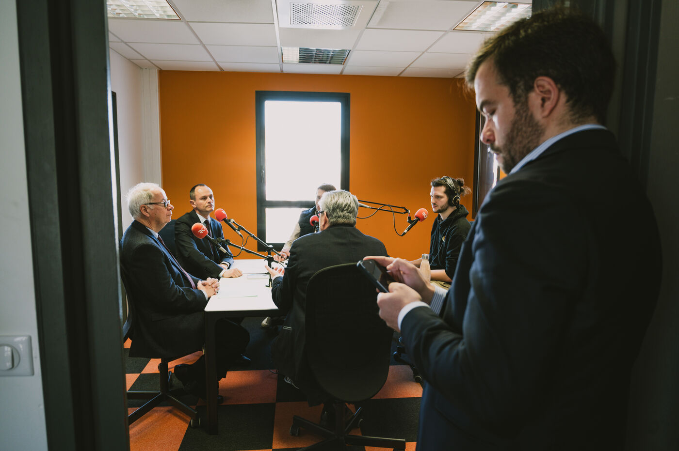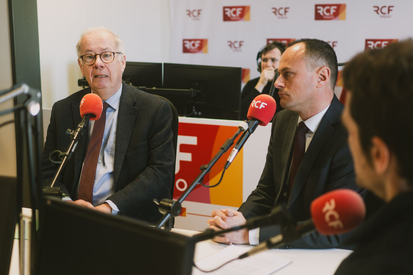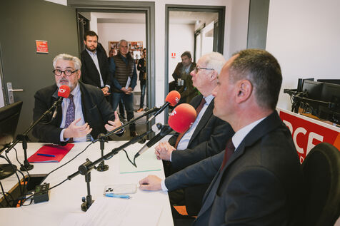 France, Clermont-Ferrand, 2026-03-19. Olivier Bianchi (PS), Julien Bony (LR) and Antoine Darbois (RN) take part in a debate on local radio station RCF, in Clermont-Ferrand, France, on March 19, 2026, a few days before the second round of the municipal elections. In the first round of the elections, the right came out on top: a historic result in a city that has been socialist since the end of World War II. Photograph by Adrien Fillon / Hans Lucas.