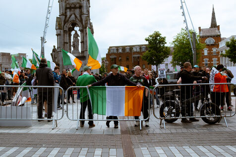 Les deux manifestations étaient séparées par un no man's land, occupé principalement par des gardai (forces de police irlandaises), des observateurs légaux, des journalistes et, à l'occasion, des touristes ou des habitants qui espéraient garer leur voiture.