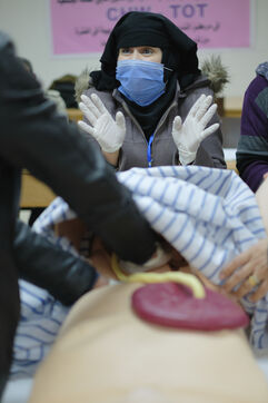 Ghosoun (en jaune sur les photos) est une sage-femme syrienne qui exerce depuis plusieurs années dans le nord de la Syrie. Elle est venue suivre la formation du Pr Raphaël Pitti, responsable de formation Mehad, et du Dr Zouhair Lahna, médecin-humanitaire, gynécologue médical et obstétrique, lors d'une mission en Syrie.
