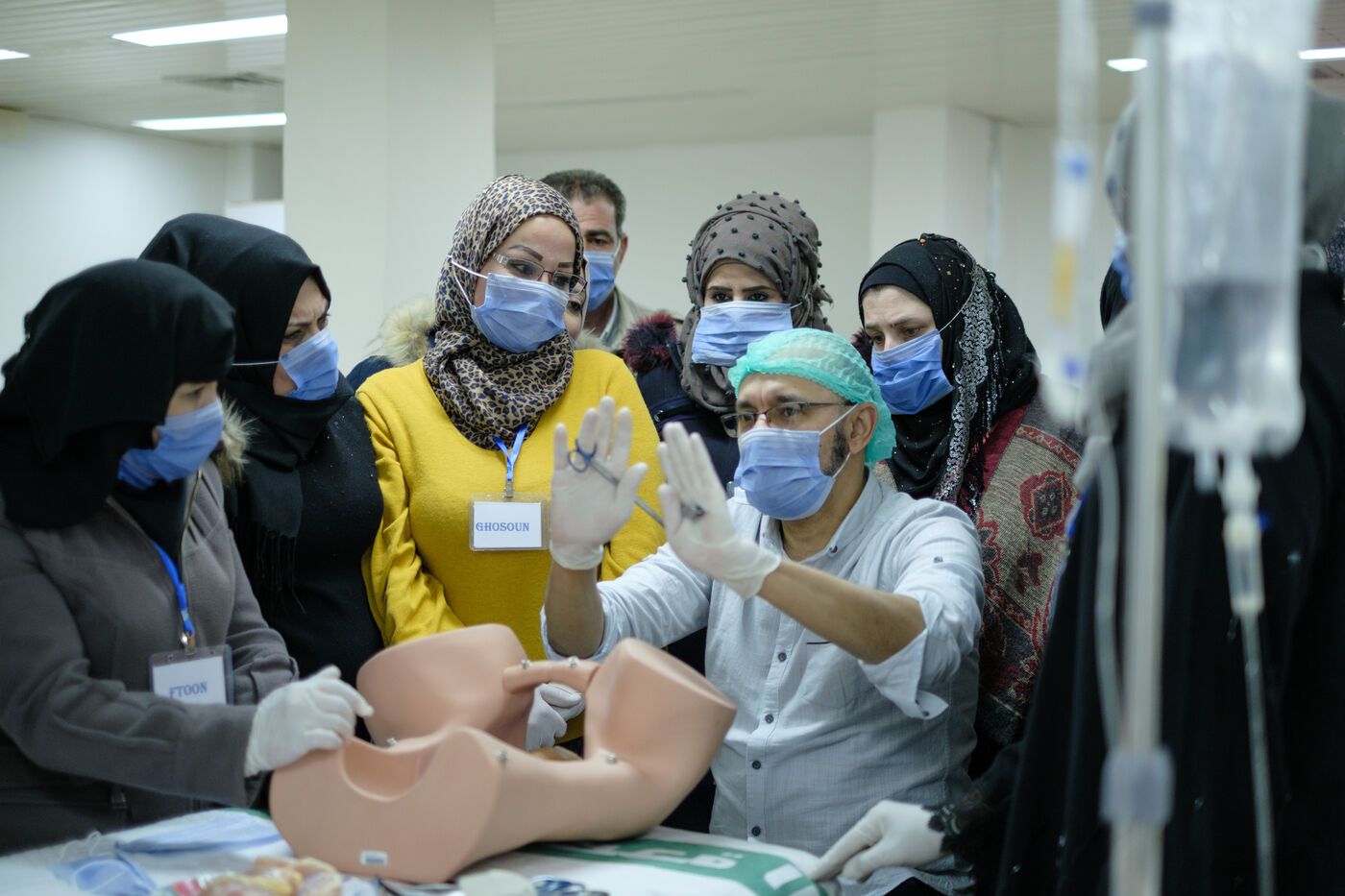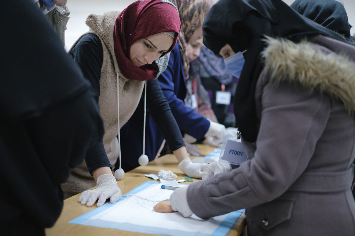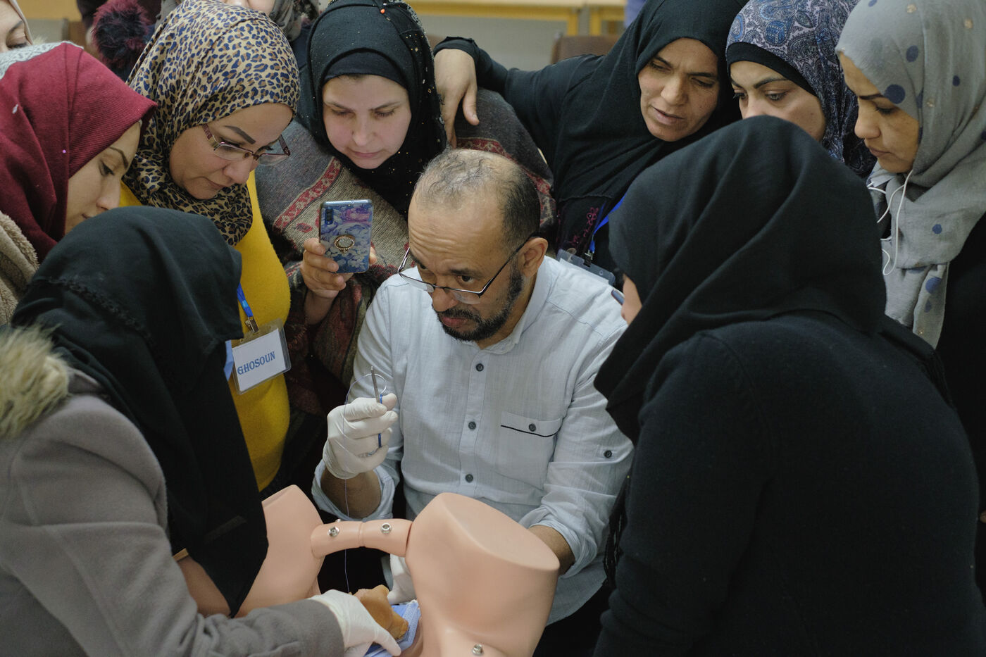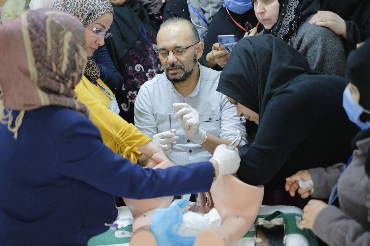 Ghosoun (in yellow) is a Syrian midwife who has been practicing for several years in northern Syria. She came to attend the training led by Dr. Raphaël Pitti, head of Mehad training, and Dr. Zouhair Lahna, a medical-humanitarian, specializing in medical and obstetric gynecology, during a mission in Syria.