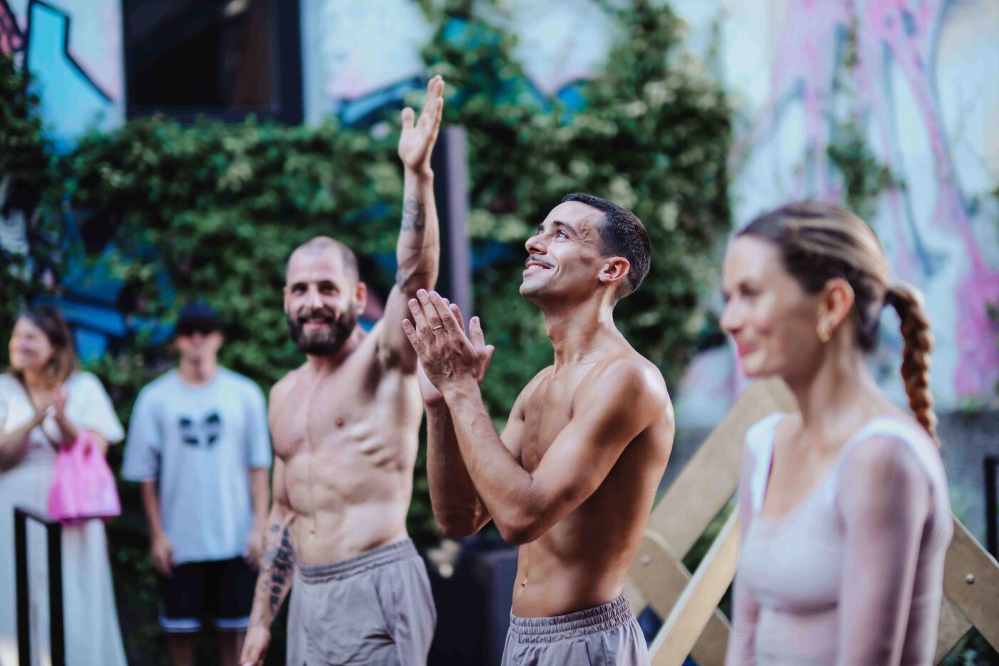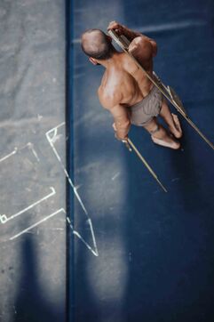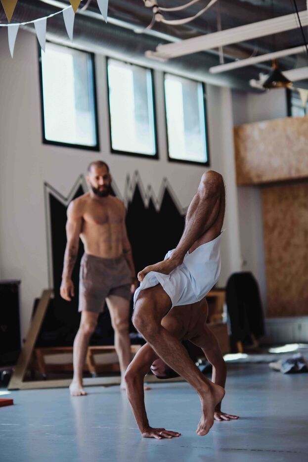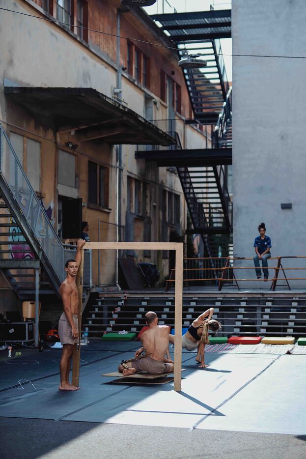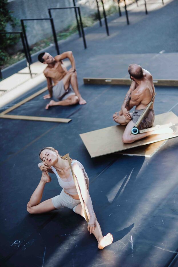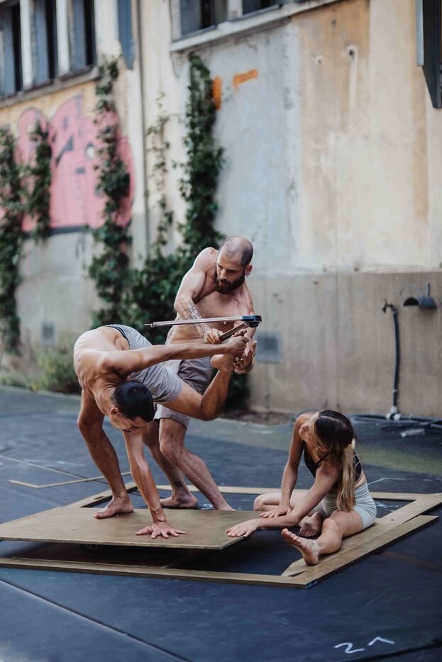 Le trio évolue en parfaite harmonie avec les lois de la géométrie sacrée, s’alignant aux équerres, règles et compas géants conçus sur mesure. Les corps se plient, se tordent et se figent dans des figures extrêmes, explorant l’équilibre parfait entre puissance et sérénité.