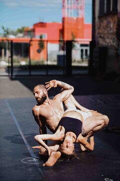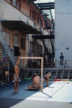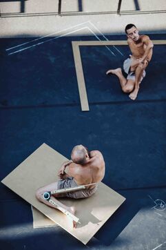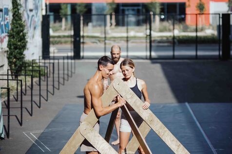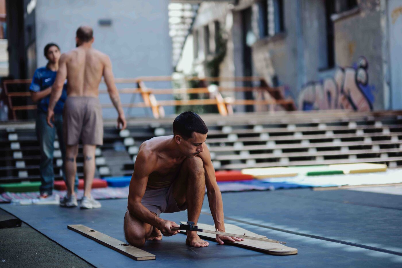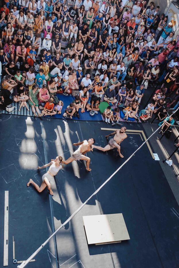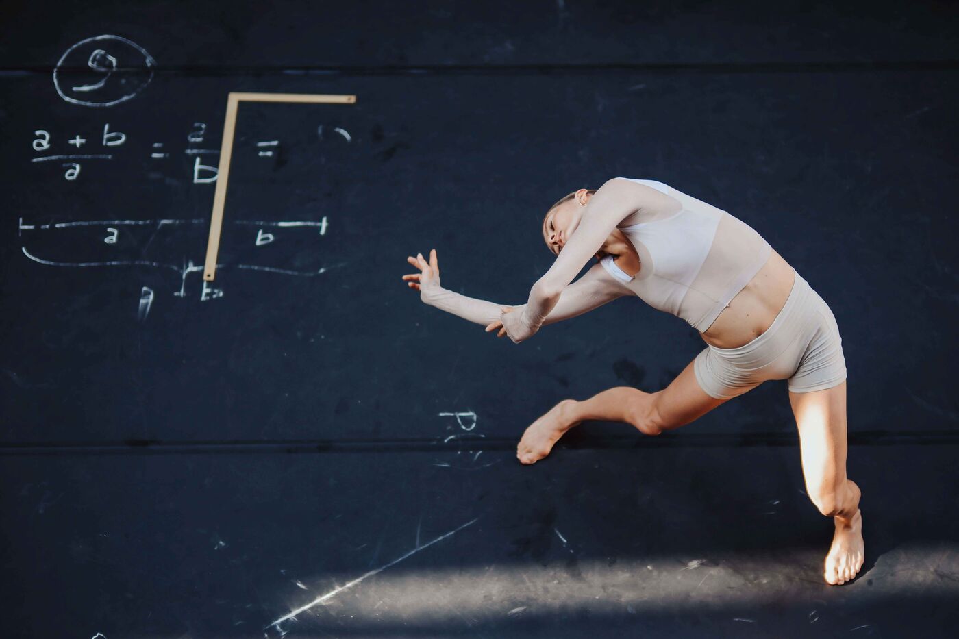 The trio evolves in perfect harmony with the laws of sacred geometry, aligning themselves with giant, custom-designed squares, rulers and compasses. Bodies bend, twist and freeze in extreme figures, exploring the perfect balance between power and serenity.