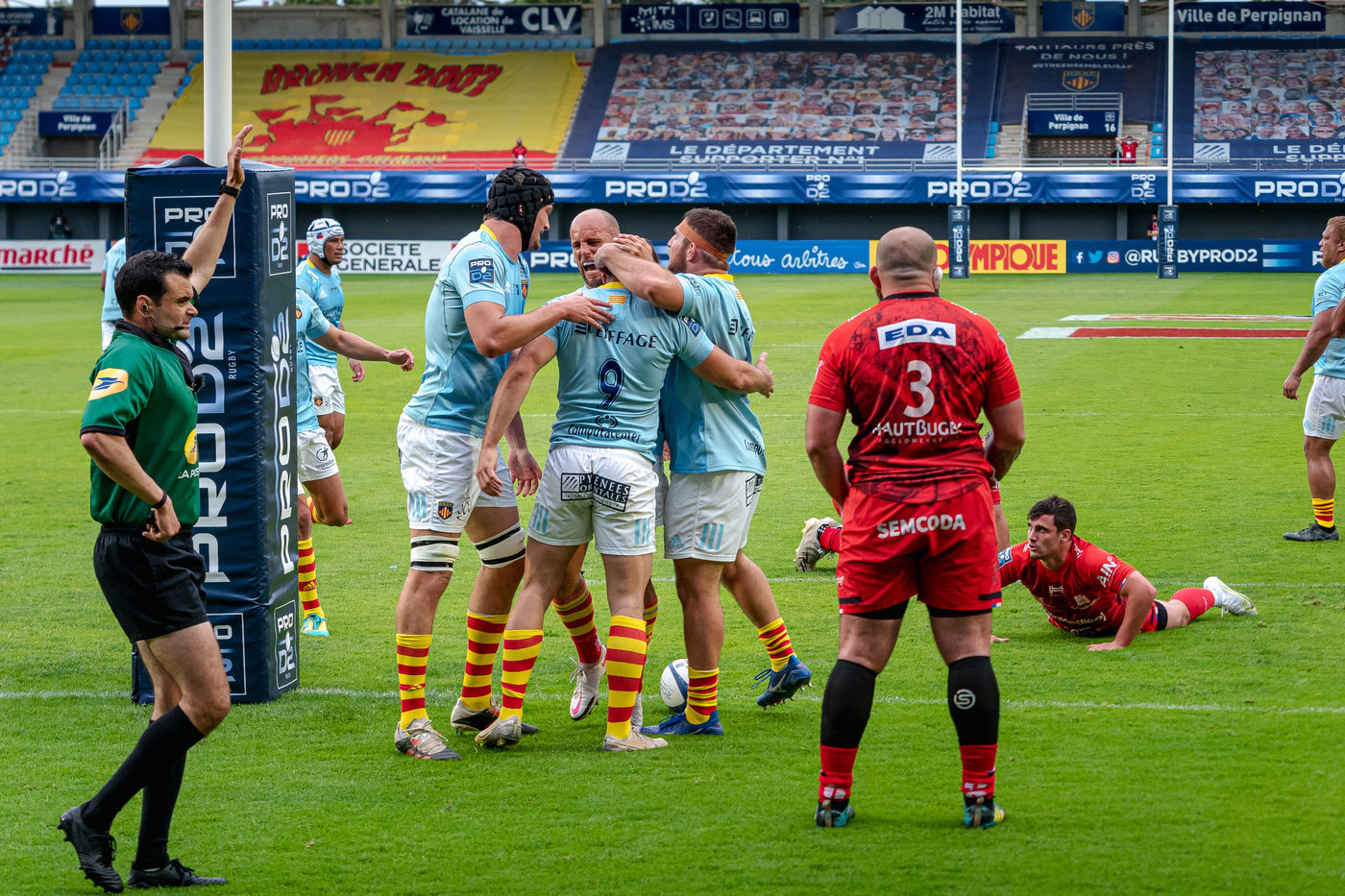 France, Perpignan, 2021-05-30. USAP won 27-15 at Aime Giral against Oyonnax in the Pro D2 semi-final. The Perpignanese scored 4 tries and will face the Biarritz team in the final in Montpellier at the beginning of June. This match also marked the return to the stadium of Catalan fans with a capacity of 1,000 people. For the fans of rugby XV, the city hall had installed 5 fan zones in Perpignan with giant screens.
