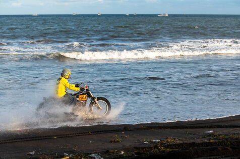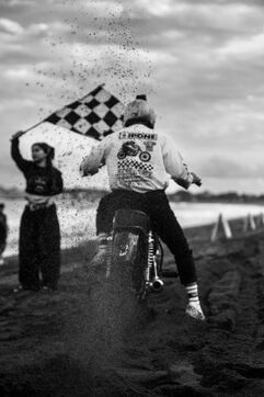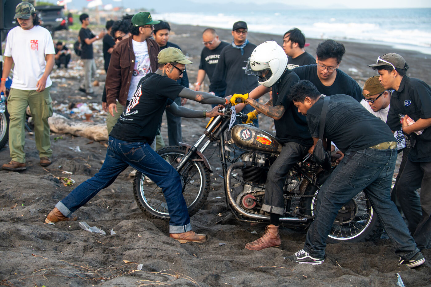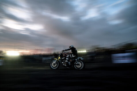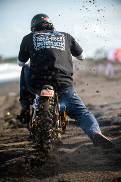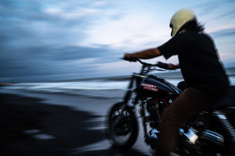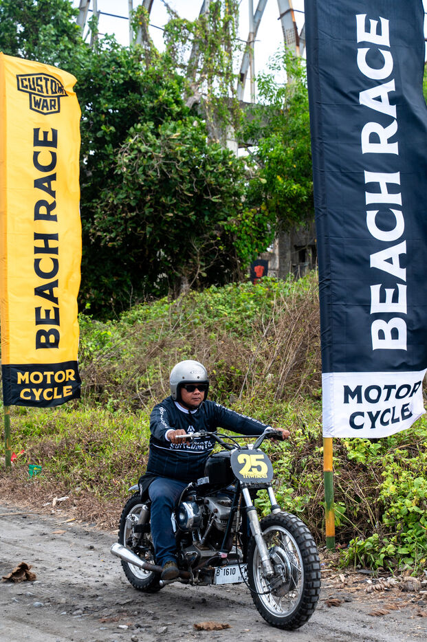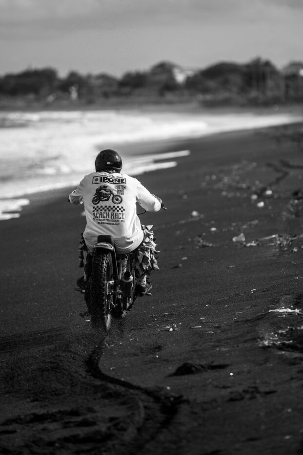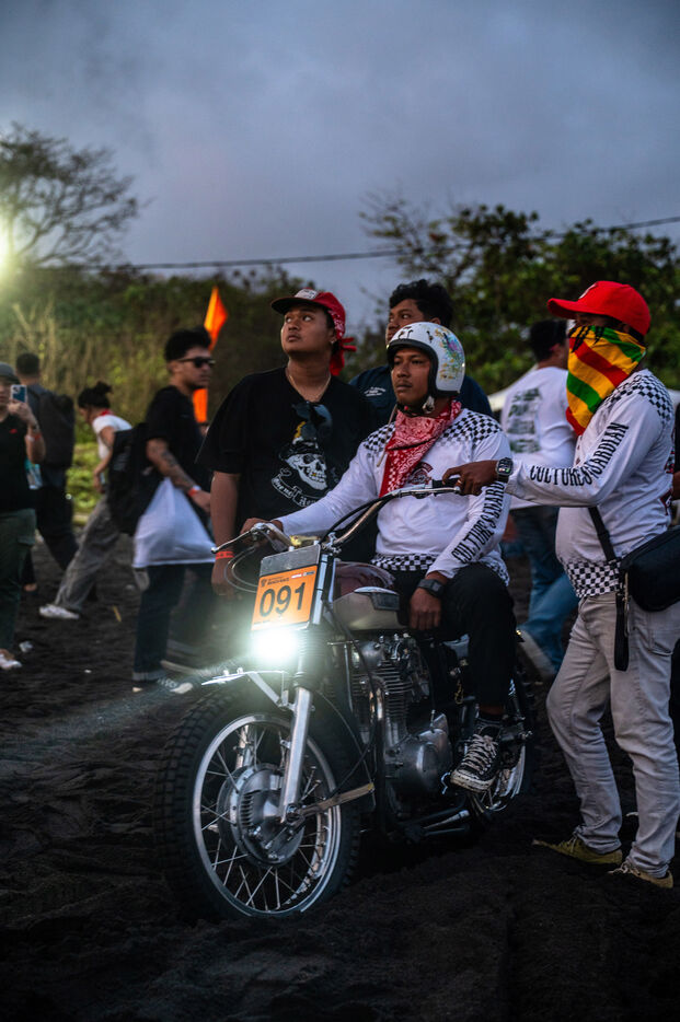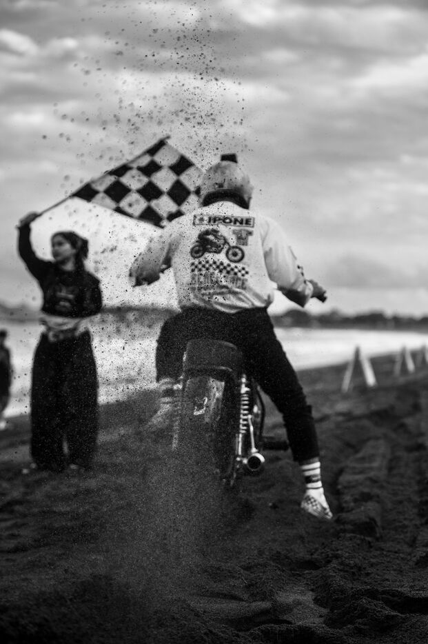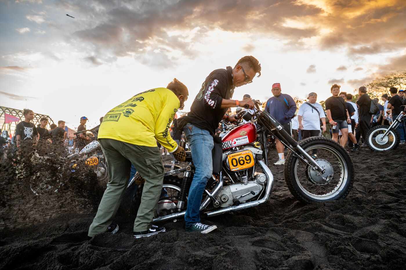 Installé dans un cadre underground, entre temple végétalisé et bunker à ciel ouvert intégralement tagués pour l’occasion par une multitude d’artistes aux slogans, comme un cri sur les murs : « CUSTOM WAR !!! ». La guerre du custom est déclarée. À quelques mètres, une plage au sable noir comme le fuel, transformée en piste sauvage, accueille la beach race : courses survoltées où les pneus crissent sur le sable brûlant, les moteurs hurlent, des HD tackées das le sable, et la mer, en toile de fond, se couvre d’étincelles d’écume. Courses folles : les runs s’enchaînent au milieu d’une foule de plus en plus dense. Entre sérieux et éclats de rires, les garages se livrent une guerre sans nom, du debut de l’après-midi jusqu’à la nuit tombée. Ici, le Sunset prend une nouvelle teinte – punk, brut et racé.