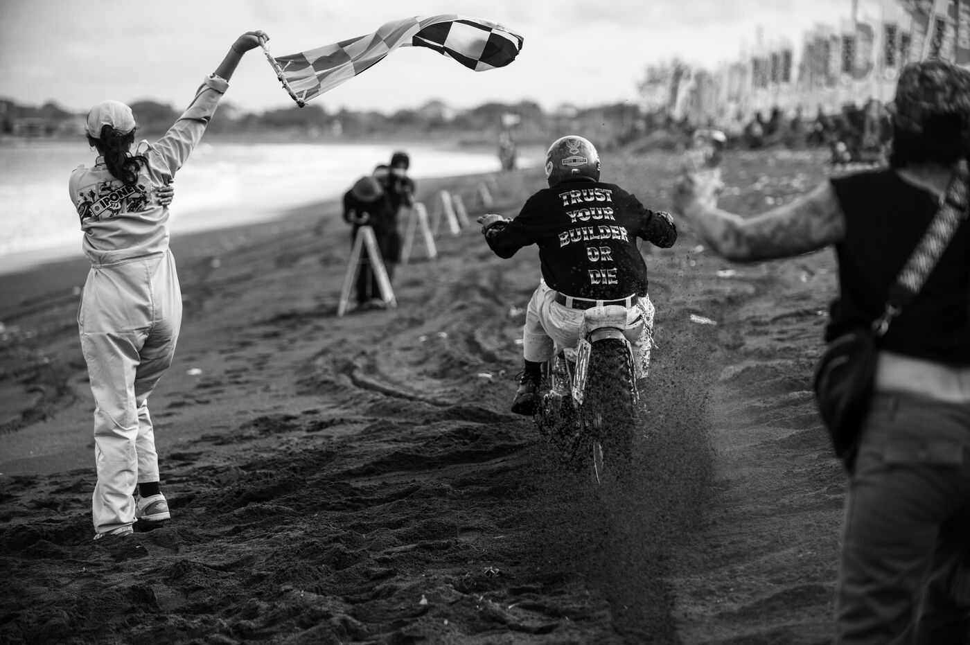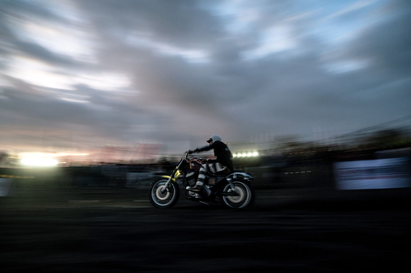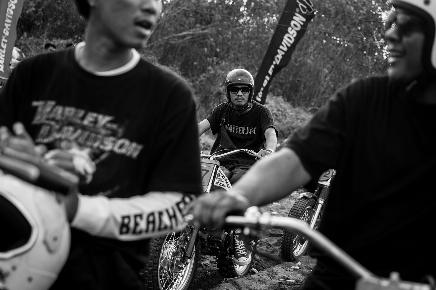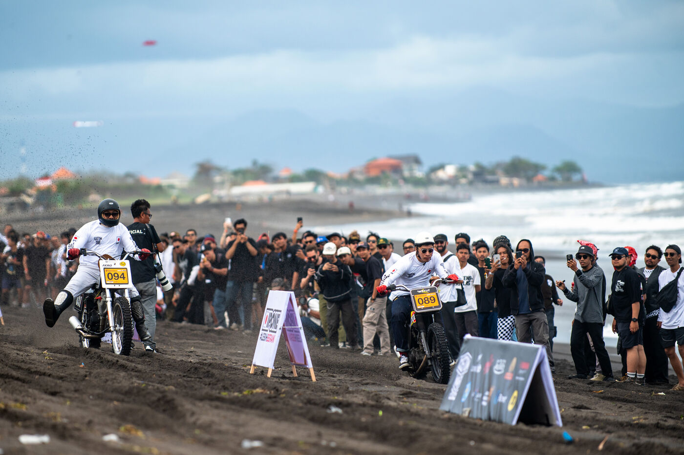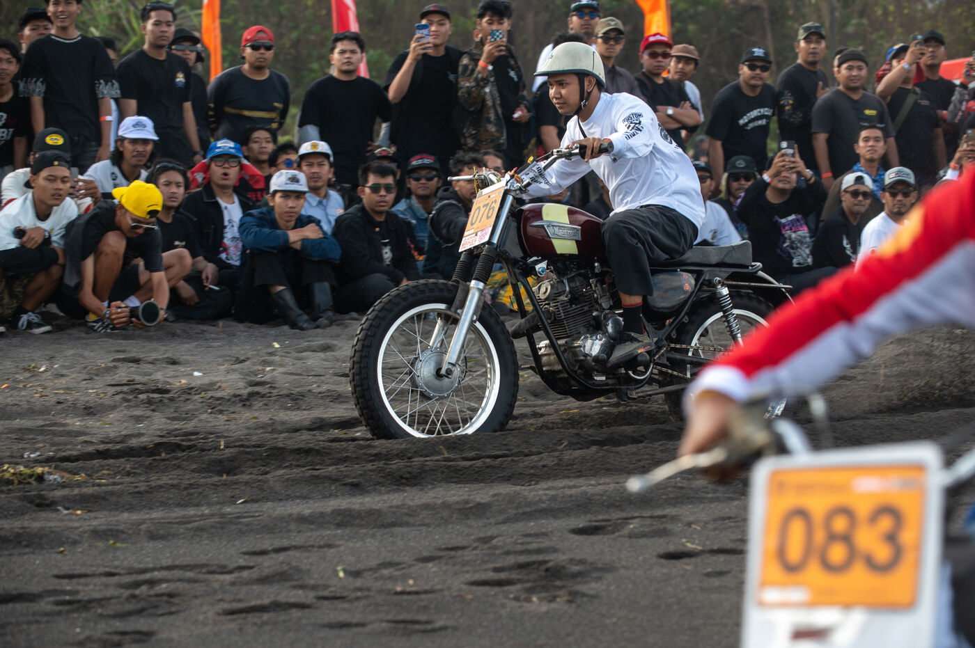 Installé dans un cadre underground, entre temple végétalisé et bunker à ciel ouvert intégralement tagués pour l’occasion par une multitude d’artistes aux slogans, comme un cri sur les murs : « CUSTOM WAR !!! ». La guerre du custom est déclarée. À quelques mètres, une plage au sable noir comme le fuel, transformée en piste sauvage, accueille la beach race : courses survoltées où les pneus crissent sur le sable brûlant, les moteurs hurlent, des HD tackées das le sable, et la mer, en toile de fond, se couvre d’étincelles d’écume. Courses folles : les runs s’enchaînent au milieu d’une foule de plus en plus dense. Entre sérieux et éclats de rires, les garages se livrent une guerre sans nom, du debut de l’après-midi jusqu’à la nuit tombée. Ici, le Sunset prend une nouvelle teinte – punk, brut et racé.